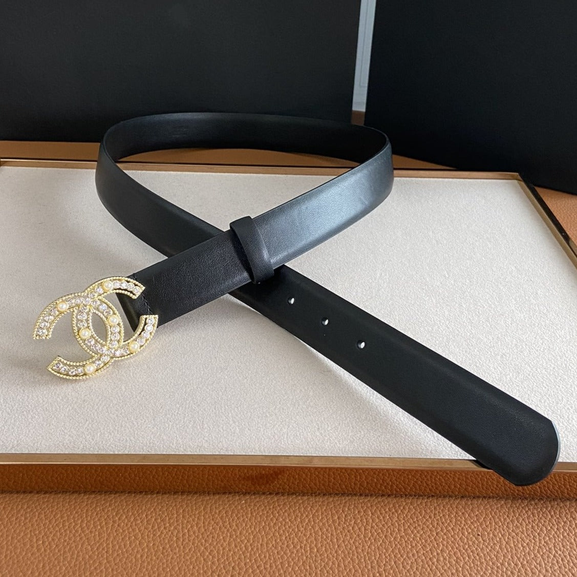 CC BELT 30MM BUCKLE GOLD PEARL DIAMOND LEATHER BLACK