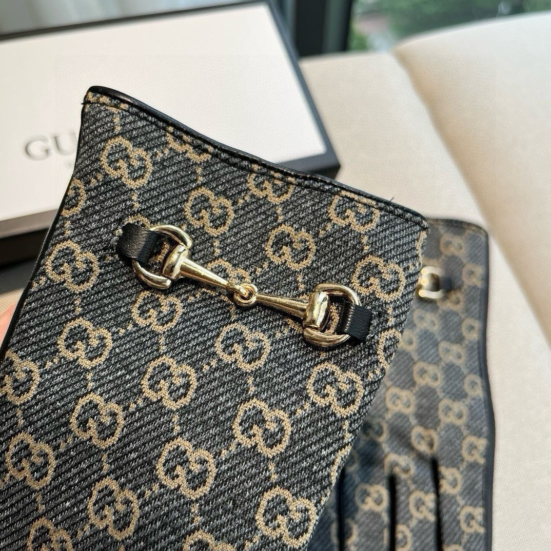 HORSEBIT GLOVES IN STONE BLUE MONOGRAM JACQUARD FABRIC MIX BLACK SHEEPSKIN 456333