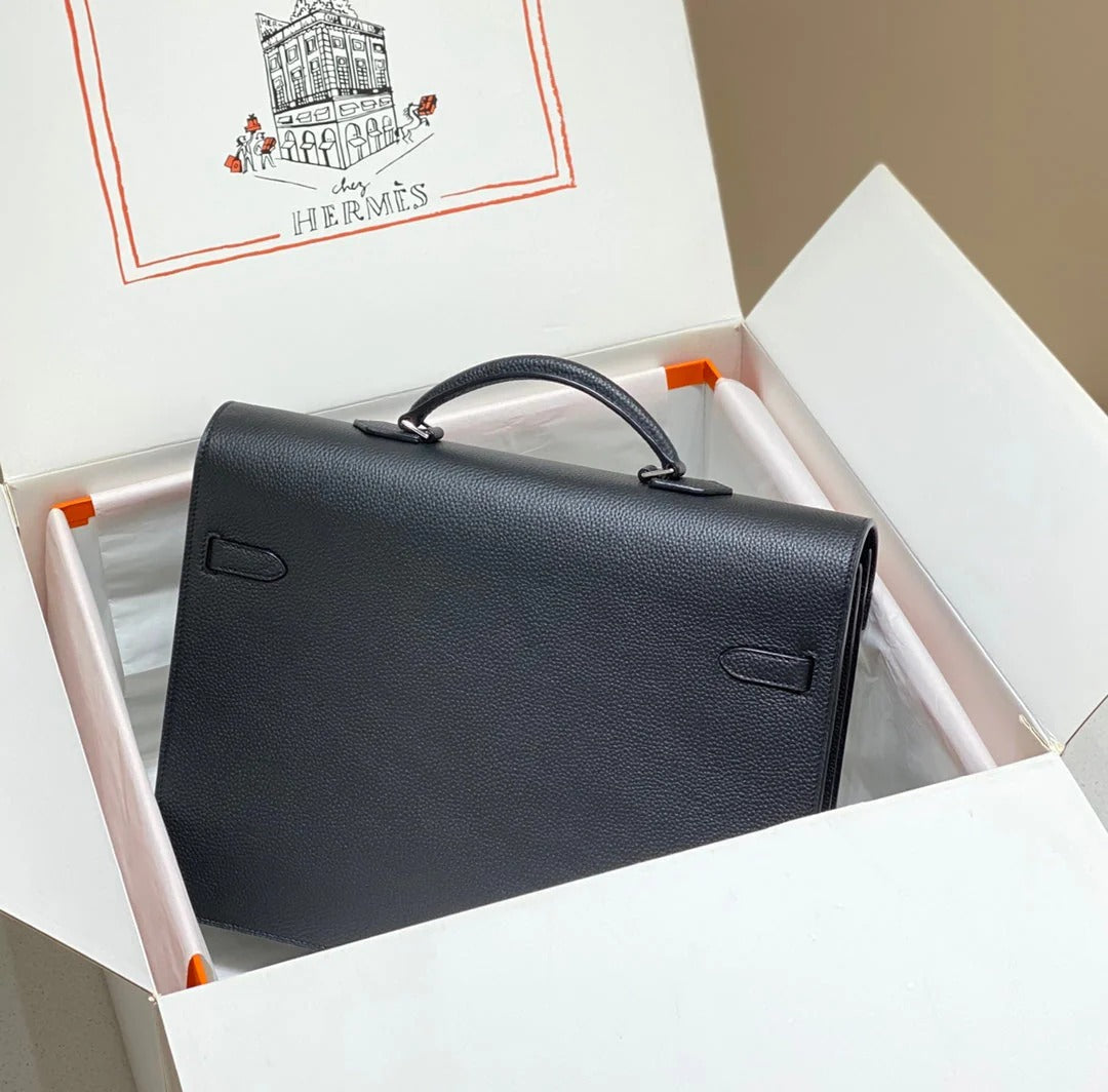 KELLY DEPECHES 38 BRIEFCASE IN BLACK TOGO CALFSKIN SILVER HARDWARE