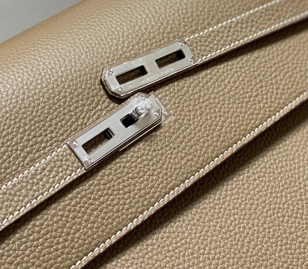 KELLY DEPECHES 38 BRIEFCASE IN ETOUPE TOGO CALFSKIN SILVER HARDWARE