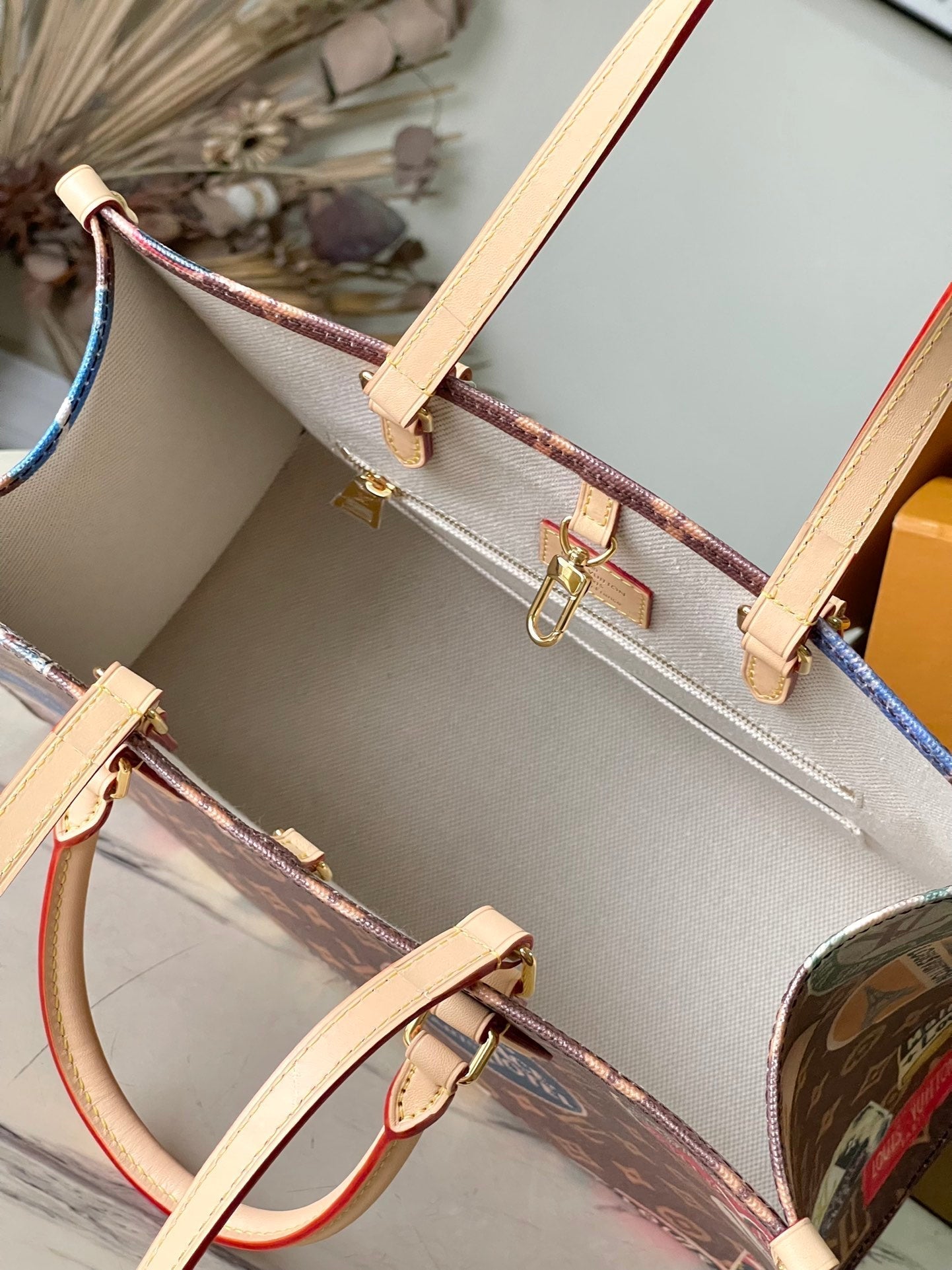 ONTHEGO VOYAGE 35 IN BROWN MONOGRAM CANVAS WITH VINTAGE HOTEL LABELS