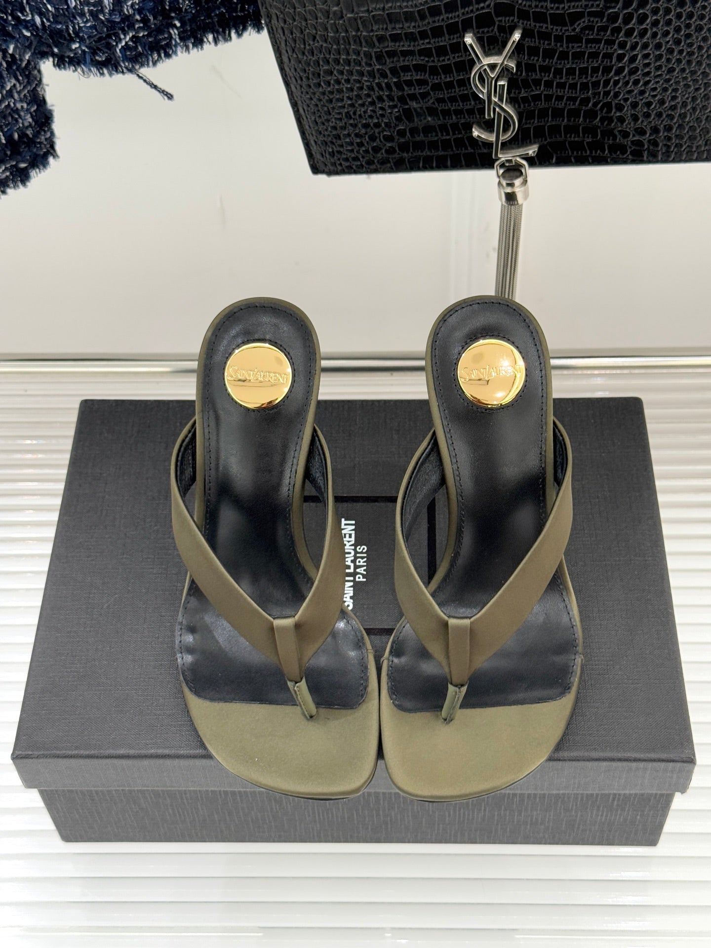 YSL Opyum Mule Sandals 8.5cm Olive Green Satin Leather 642928