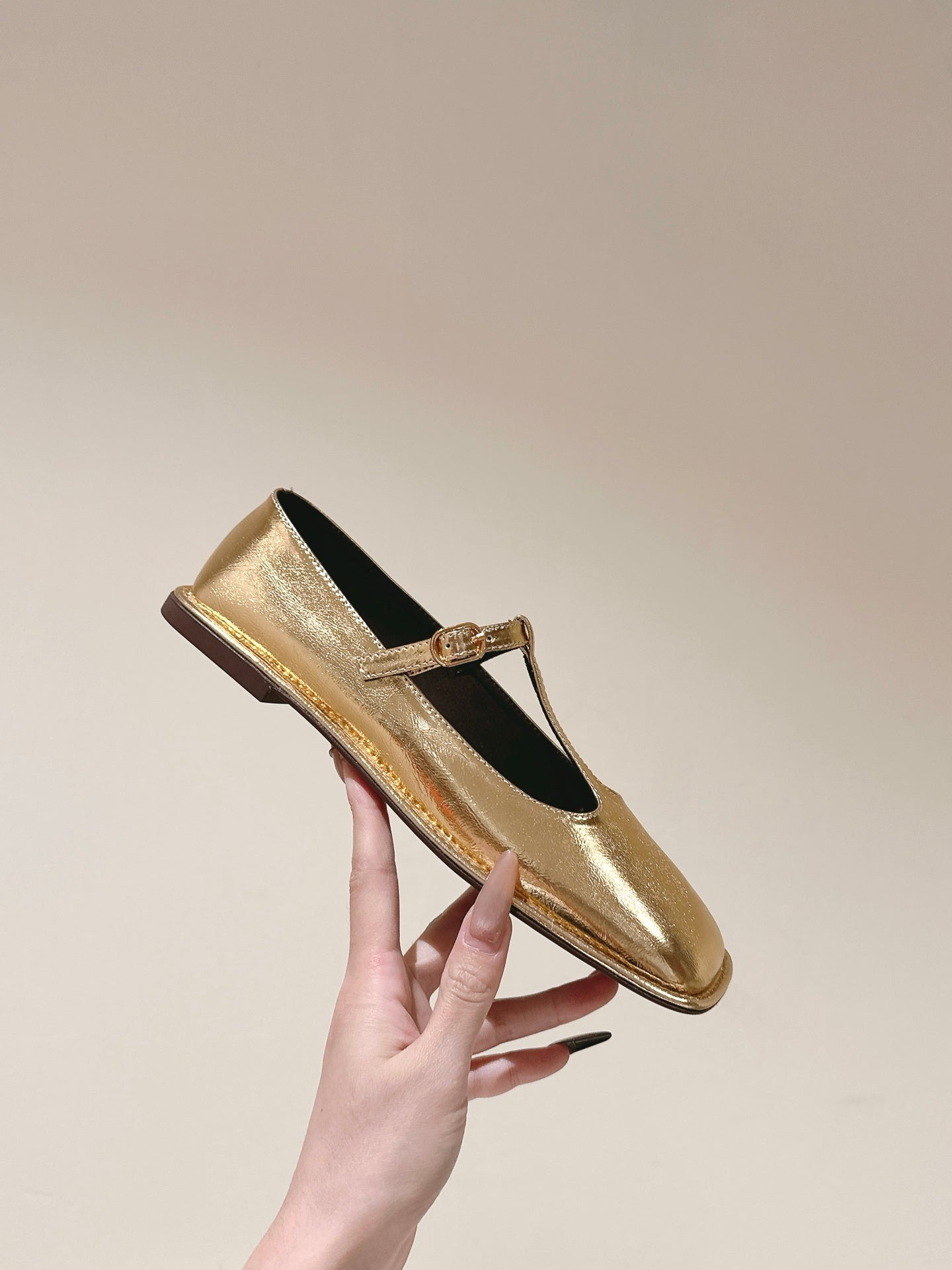 The Row Square T-Strap Flat Gold Metallic Leather 451286