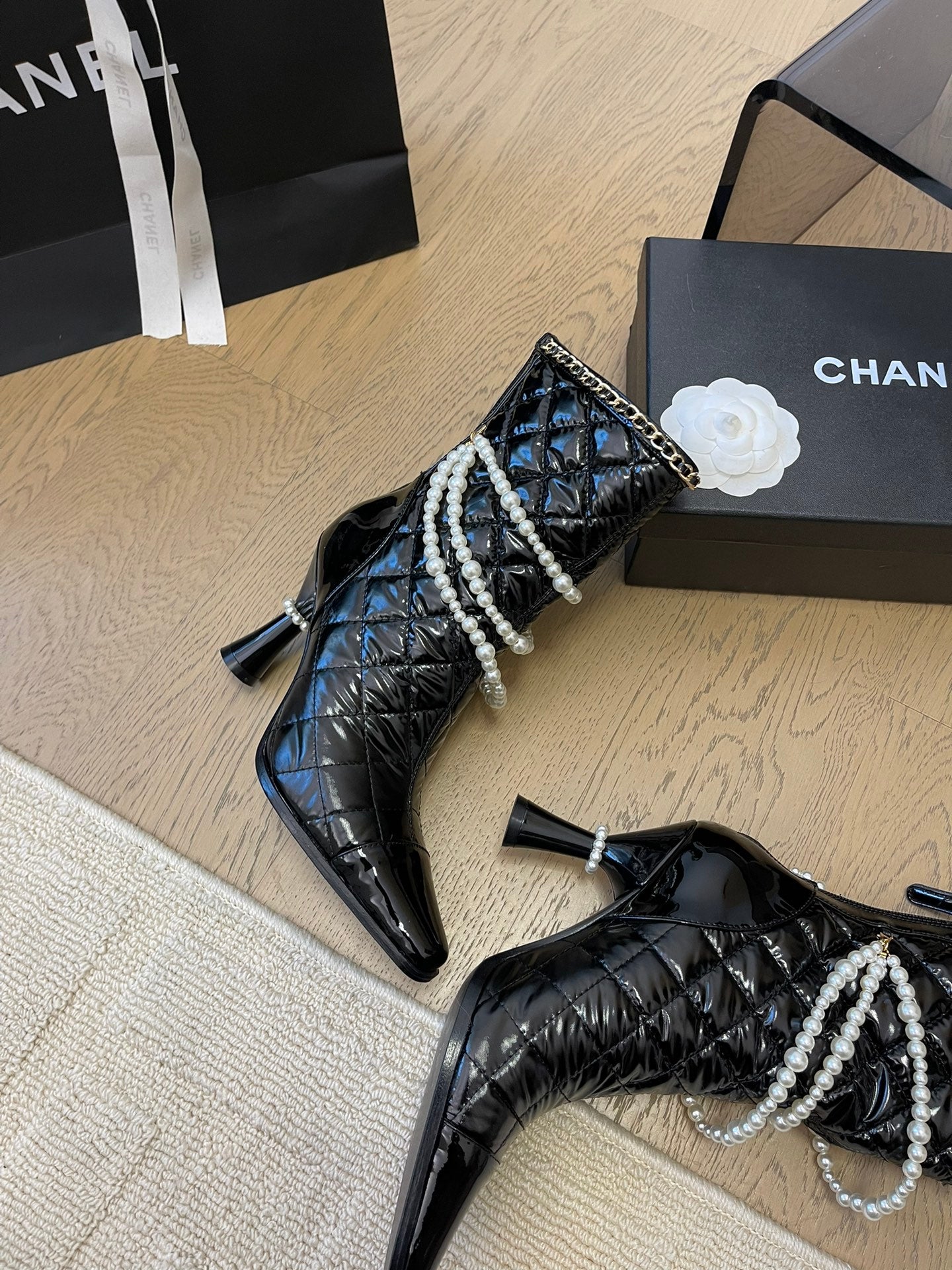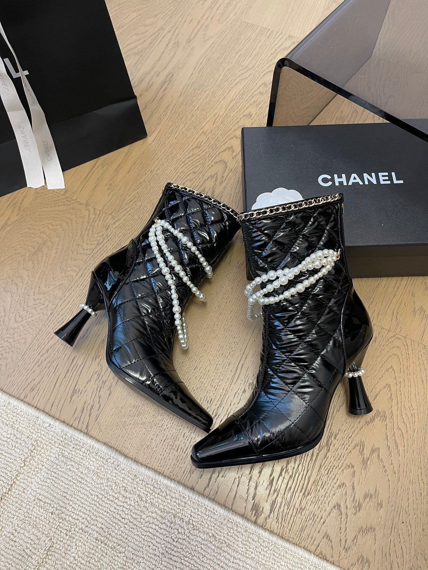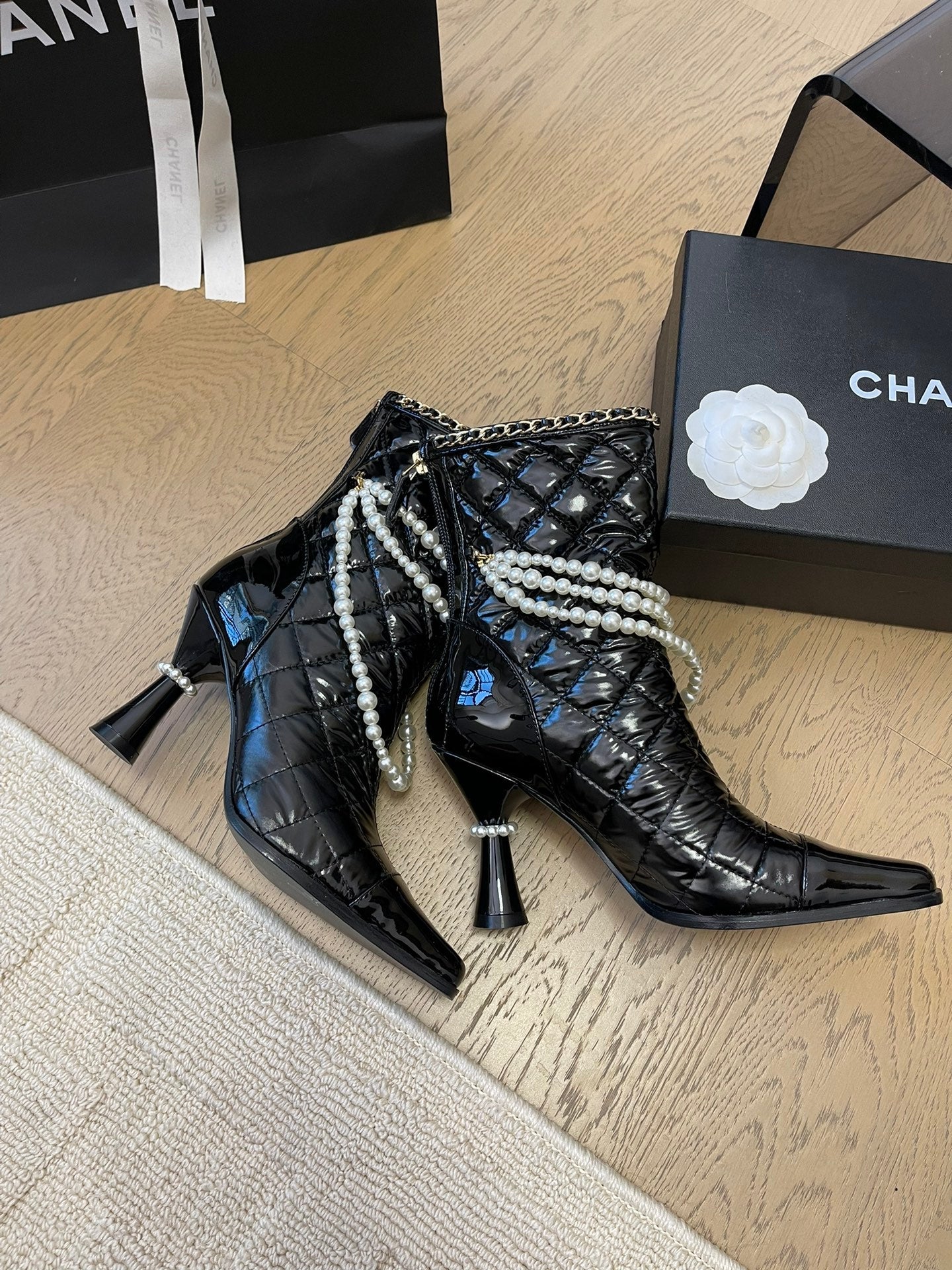 HIGH HEELS 8CM BOOTS IN BLACK CALFSKIN WITH PEARL CHAIN