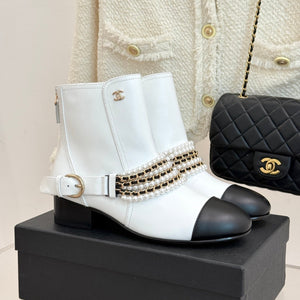 CC Classic Pearl Chain Colorblock Block Heel Ankle Boots White Lambskin 473318