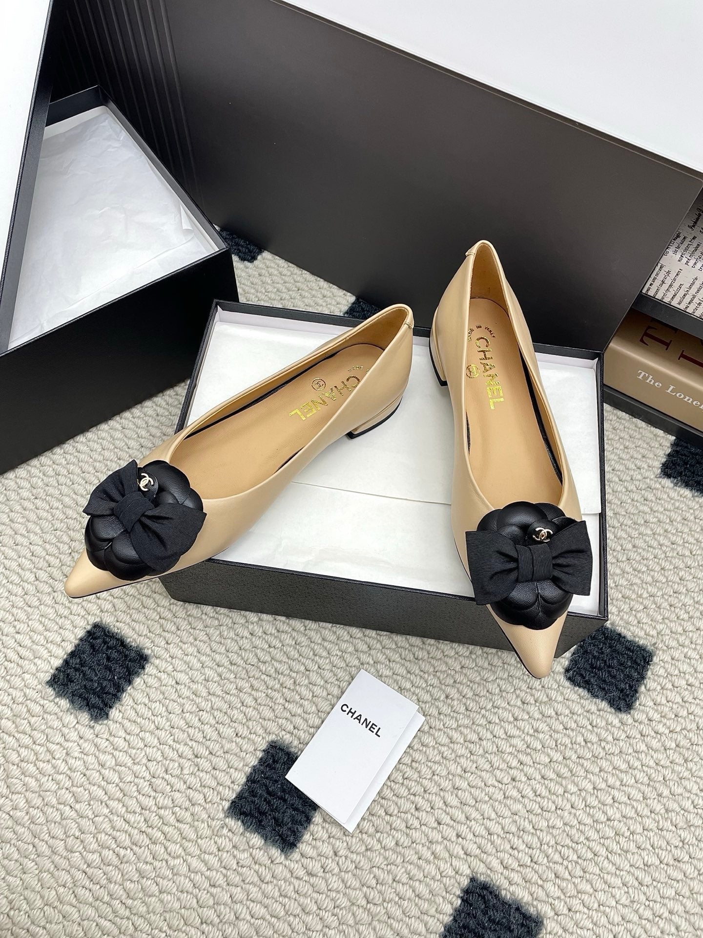 CC Logo Bow with Camellia Ballerina Flats Black Beige Cowhide Sheepskin 427020