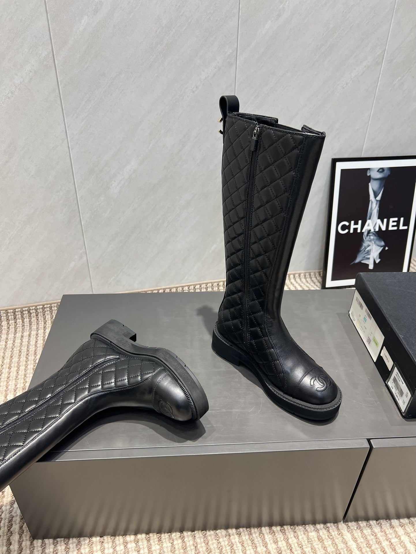 CC 25S Round Toe Mid-Heel Zippered High Boots in Black Cowhide and Embroidered Latticework 442493