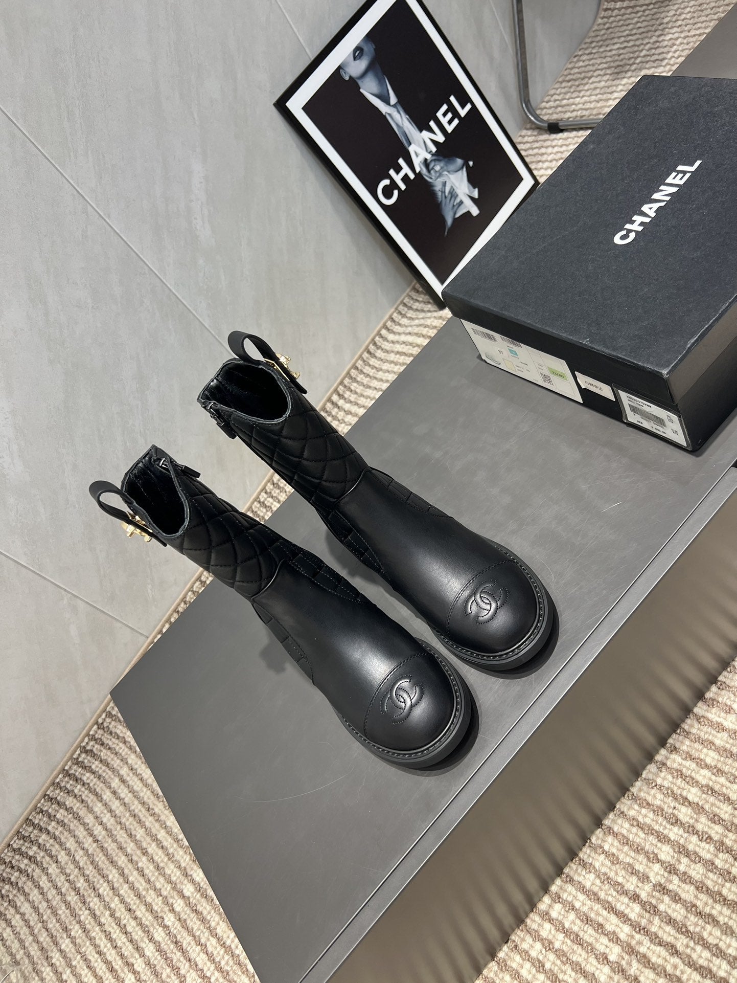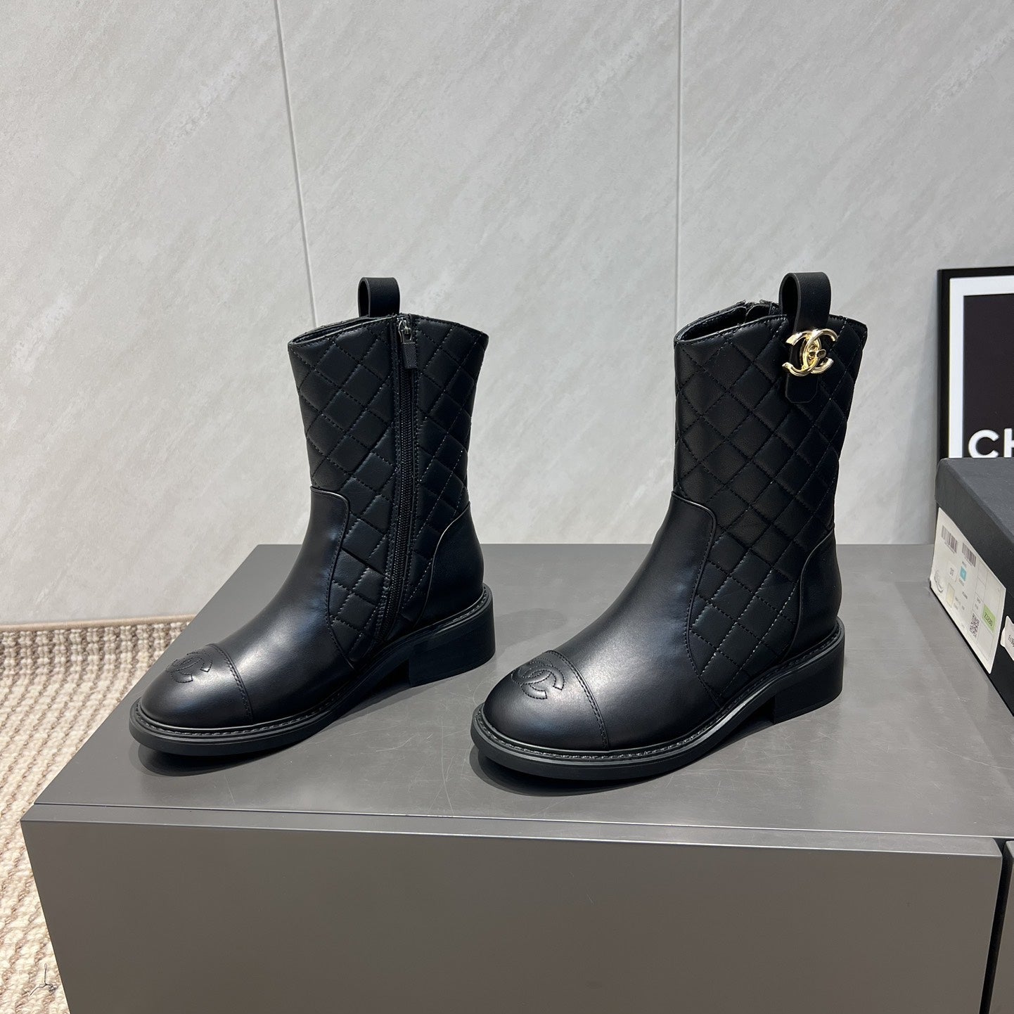 CC 25S Round-Toe Zippered Ankle Boots in Black Cowhide and Embroidered Latticework 442503