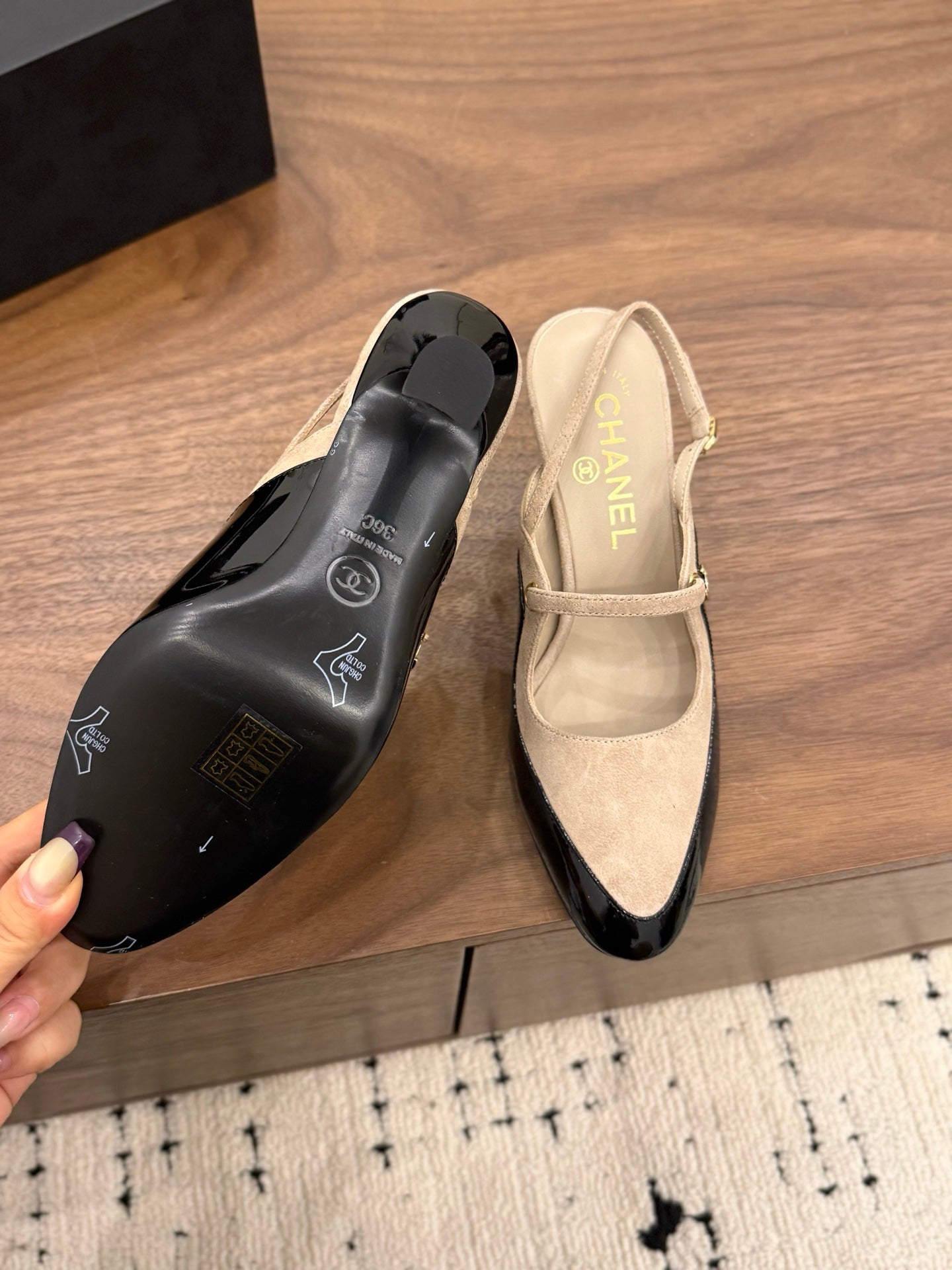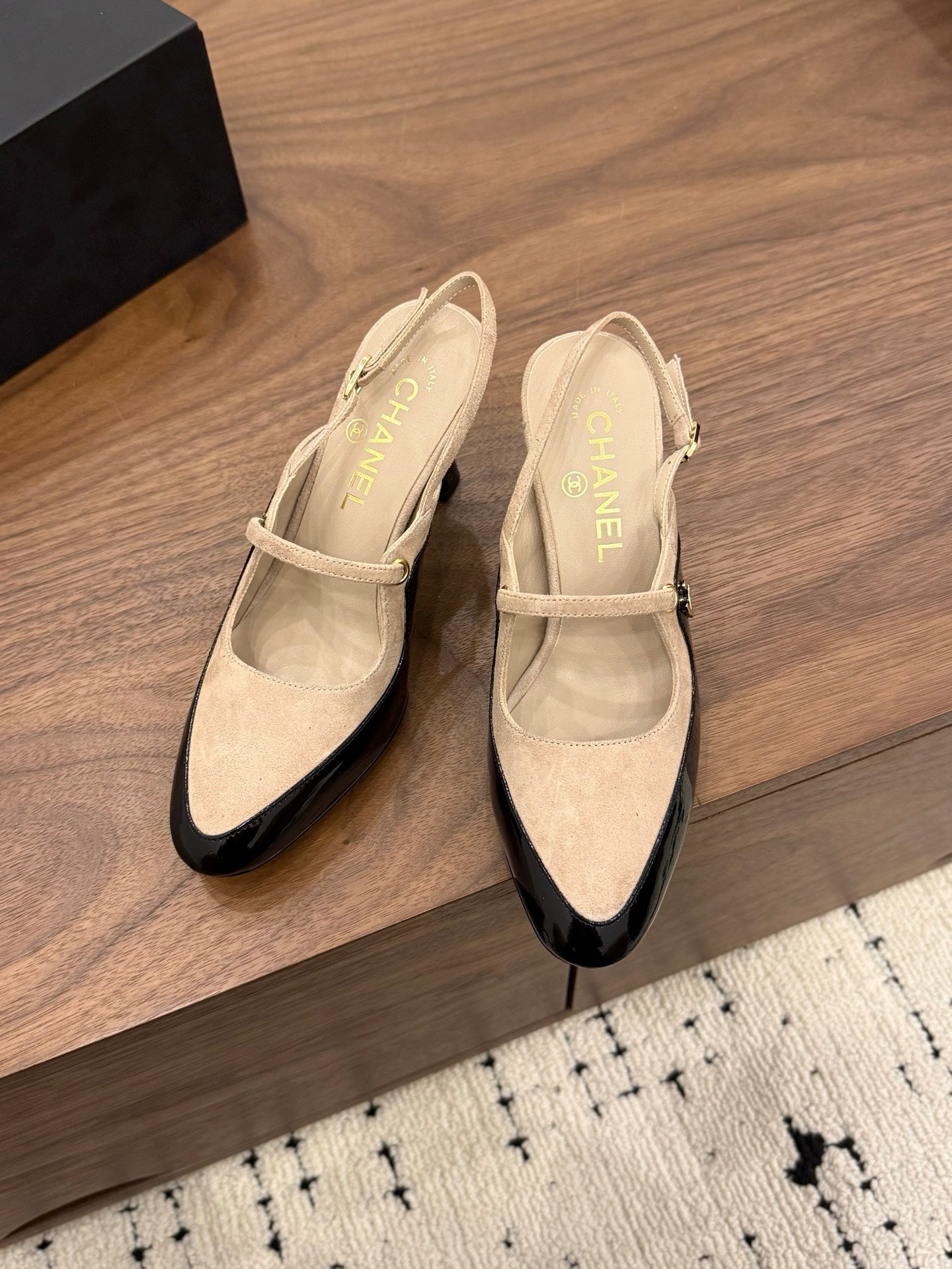 CC 26FW Slingback 7.5cm Beige Black Suede Patent Leather 676120