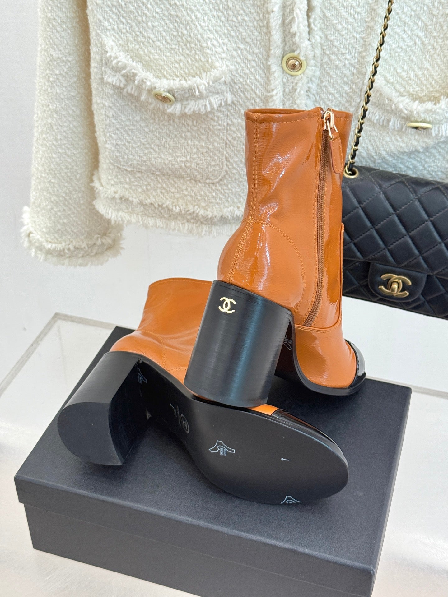CC Classic Short Boots Block Heel 90mm Burnt Orange Patent Leather 465390