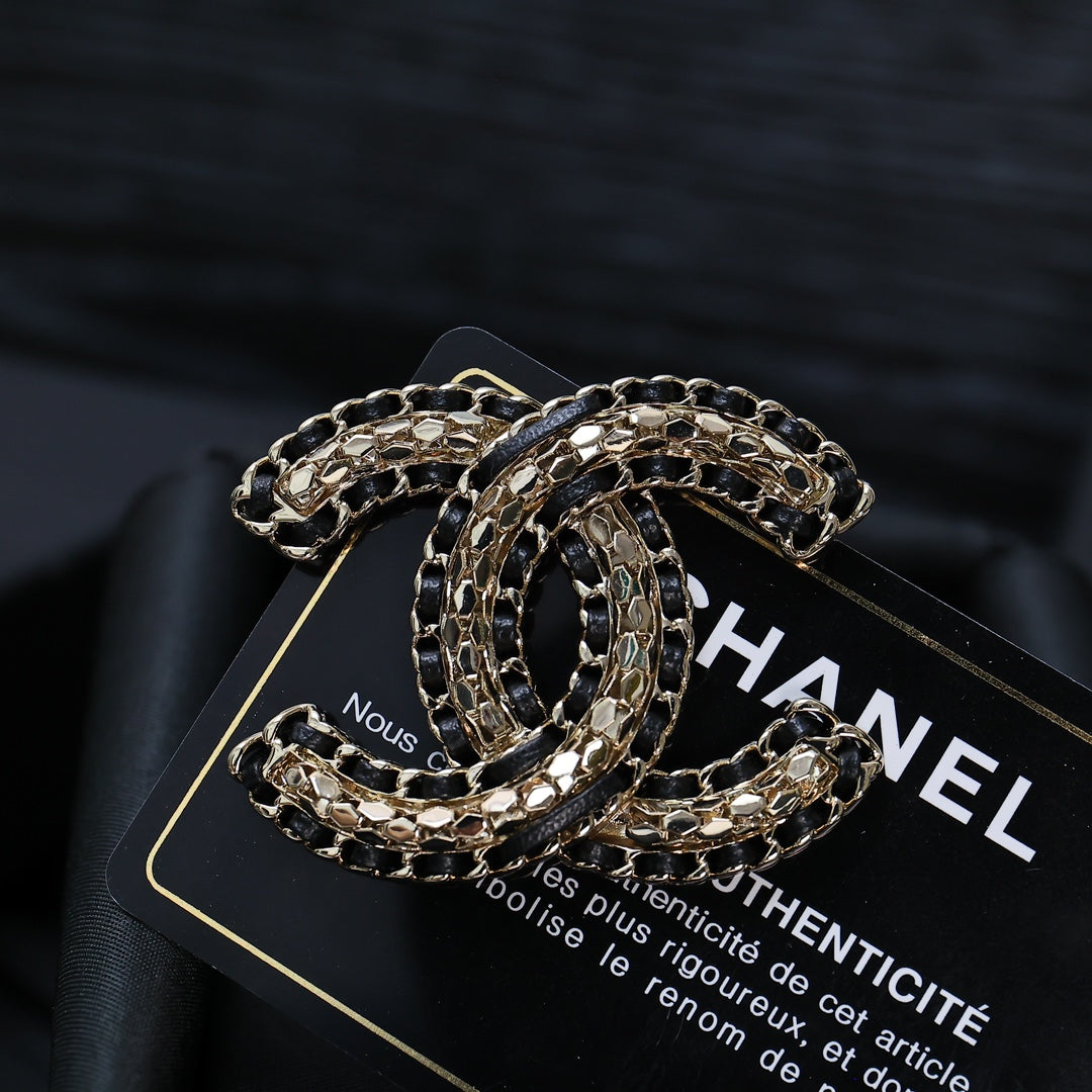 DOUBLE C BROOCH IN GOLD METAL WITH BLACK LEATHER THREADED CHAIN