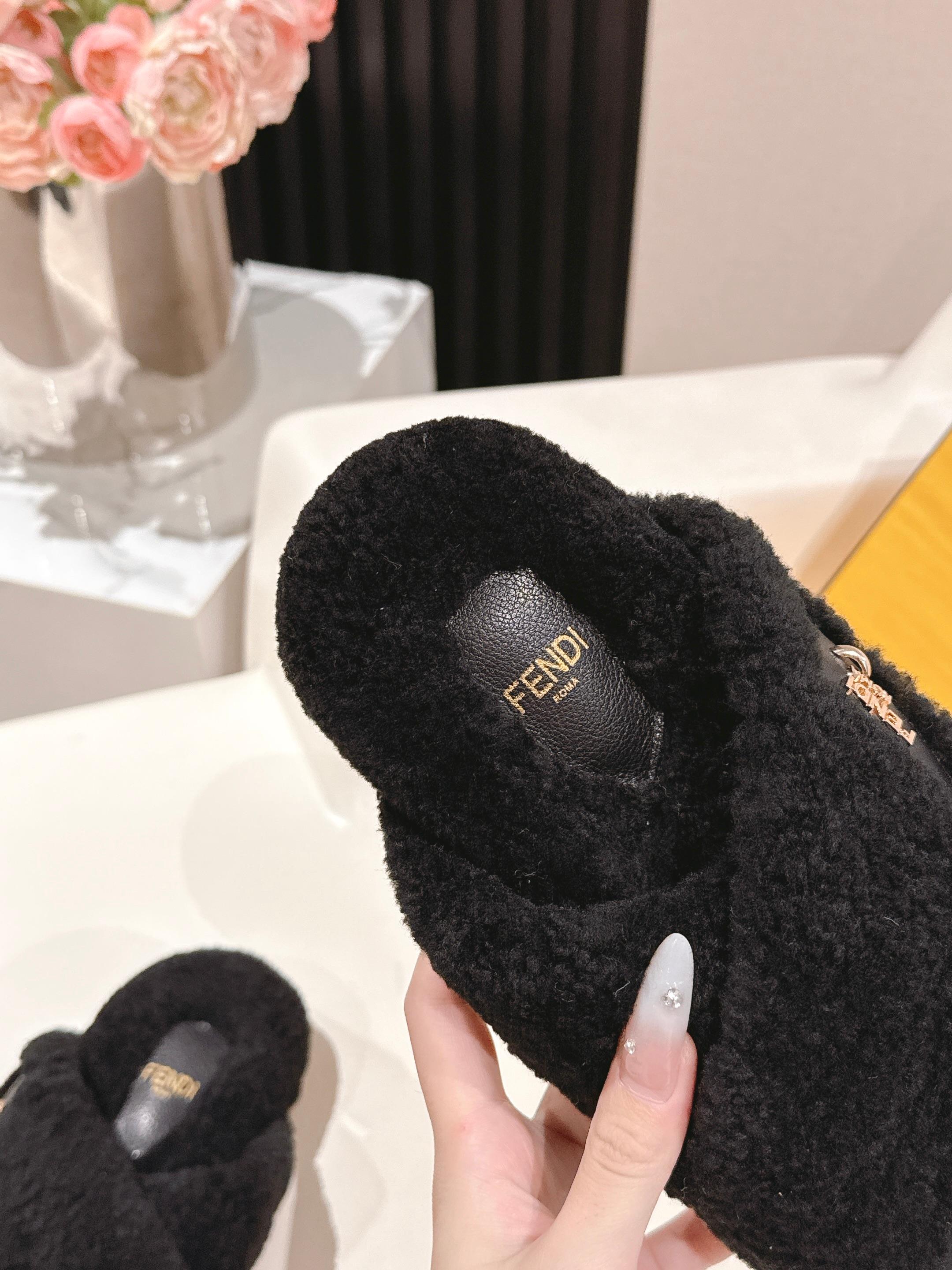 Fendi F013 2025ss Fluffy Slippers Black Lambswool 467194