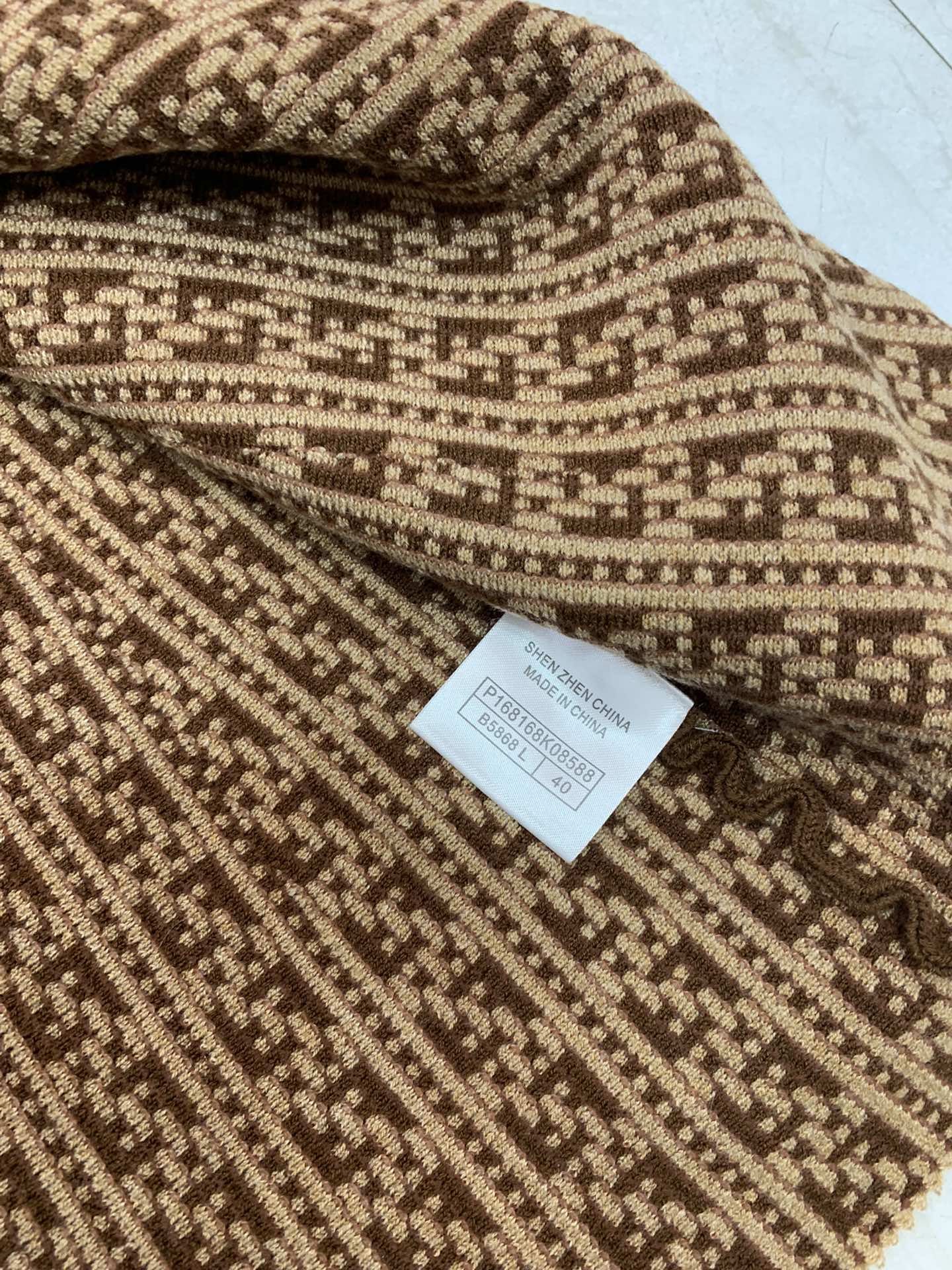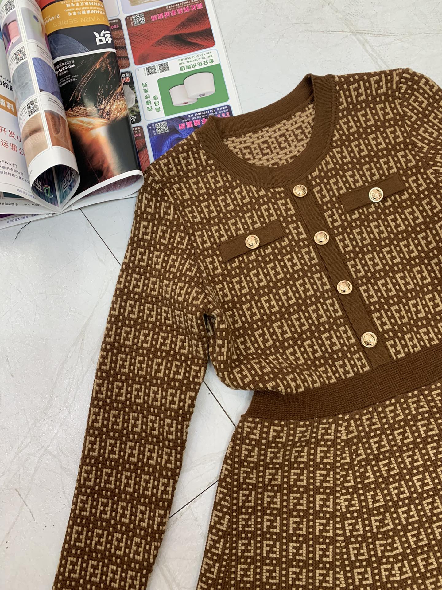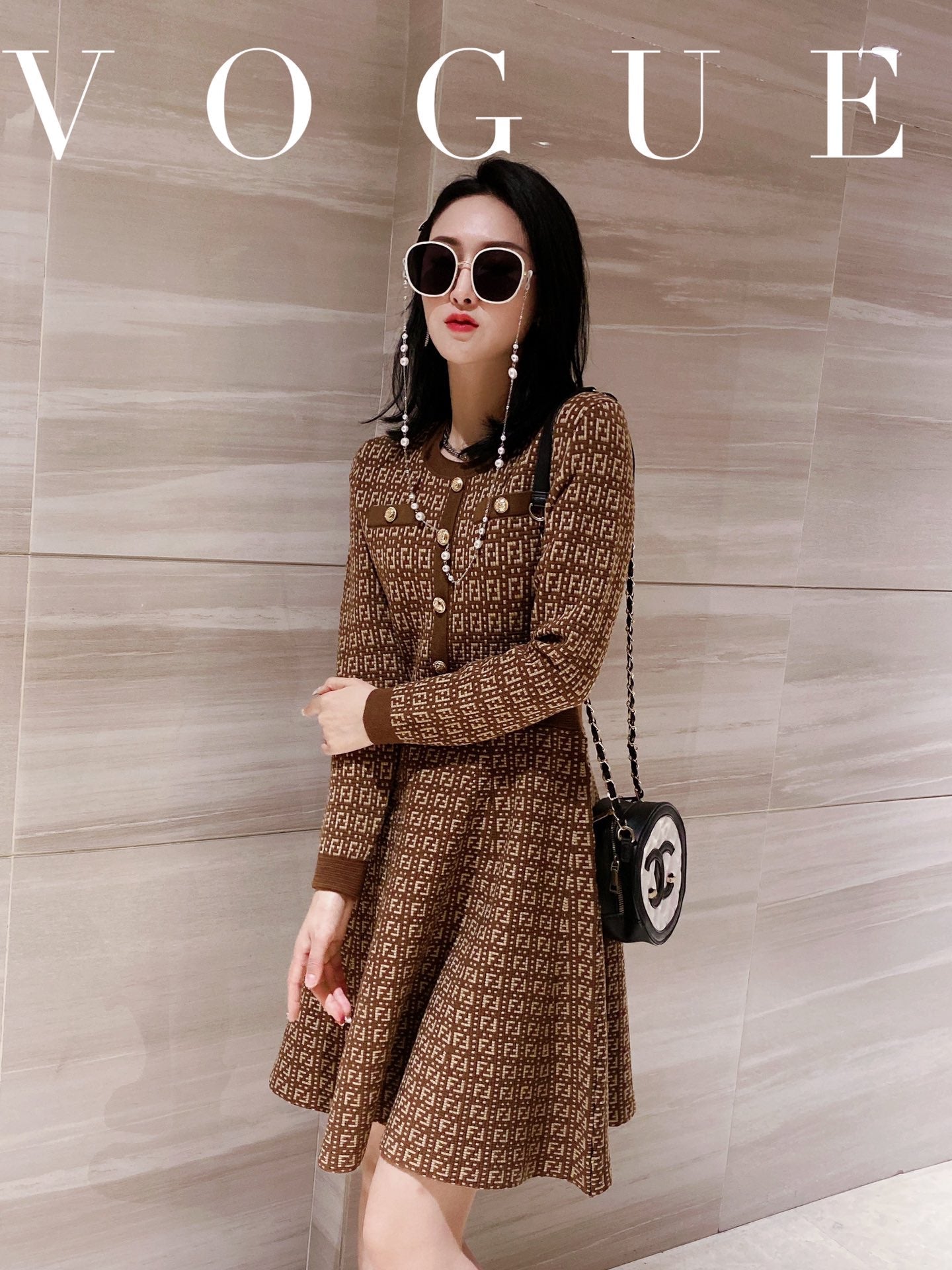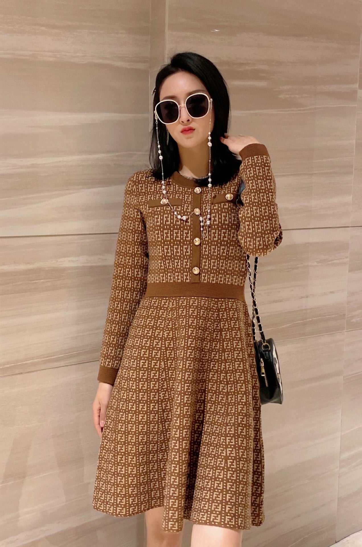 Fendi FF Logo Long Sleeve Jacquard Brown Fabric Wool Dress
