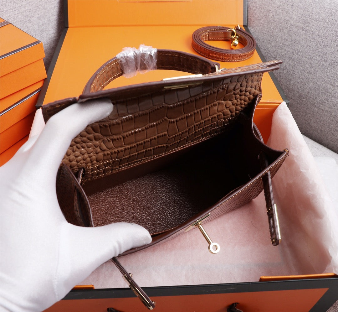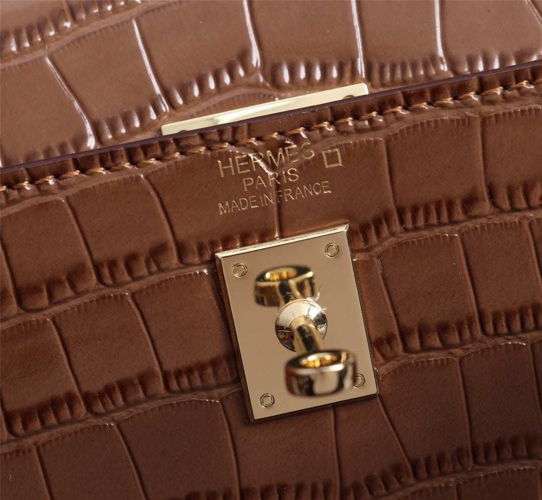 HM KELLY MINI 19 CHOCOLATE CROCODILE EMBOSSED CALFSKIN GOLD HARDWARE