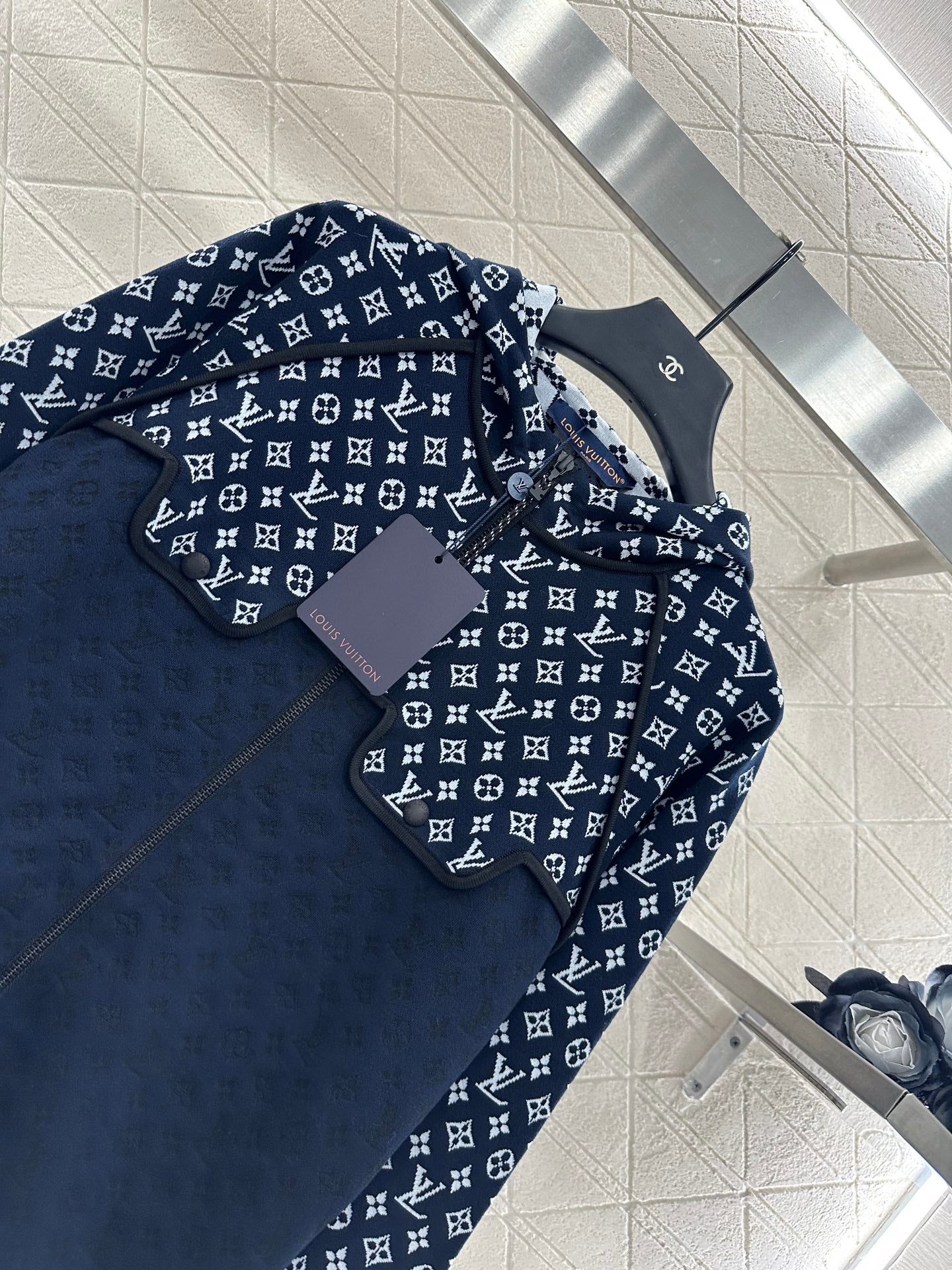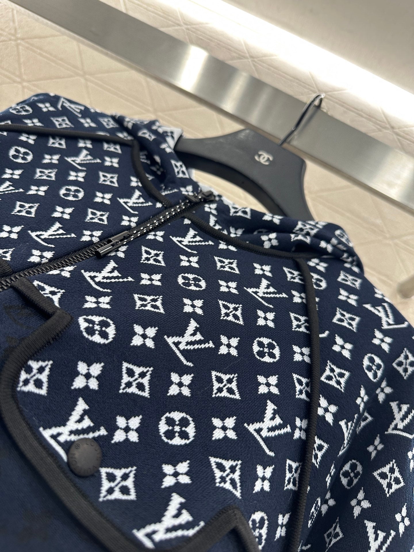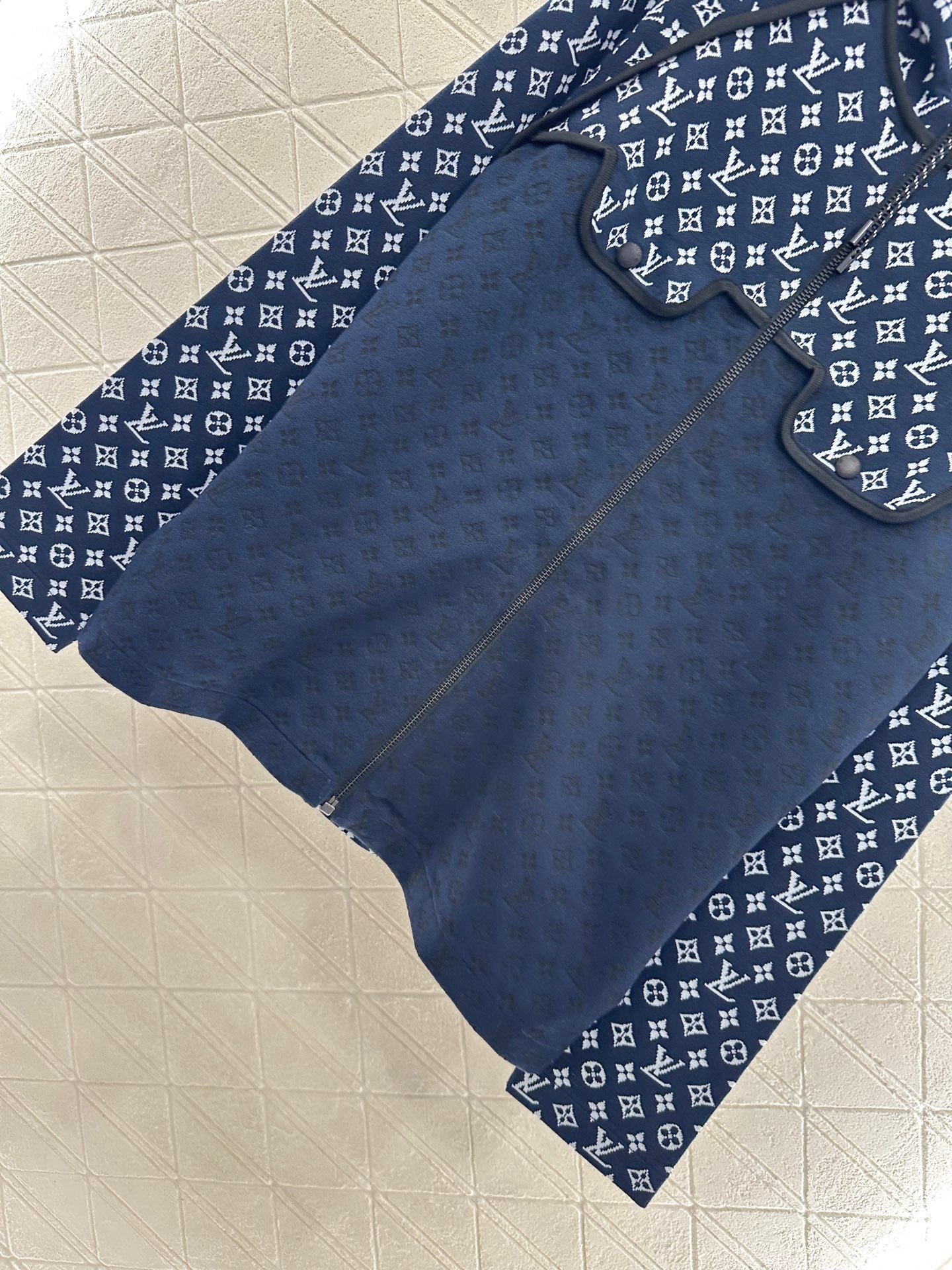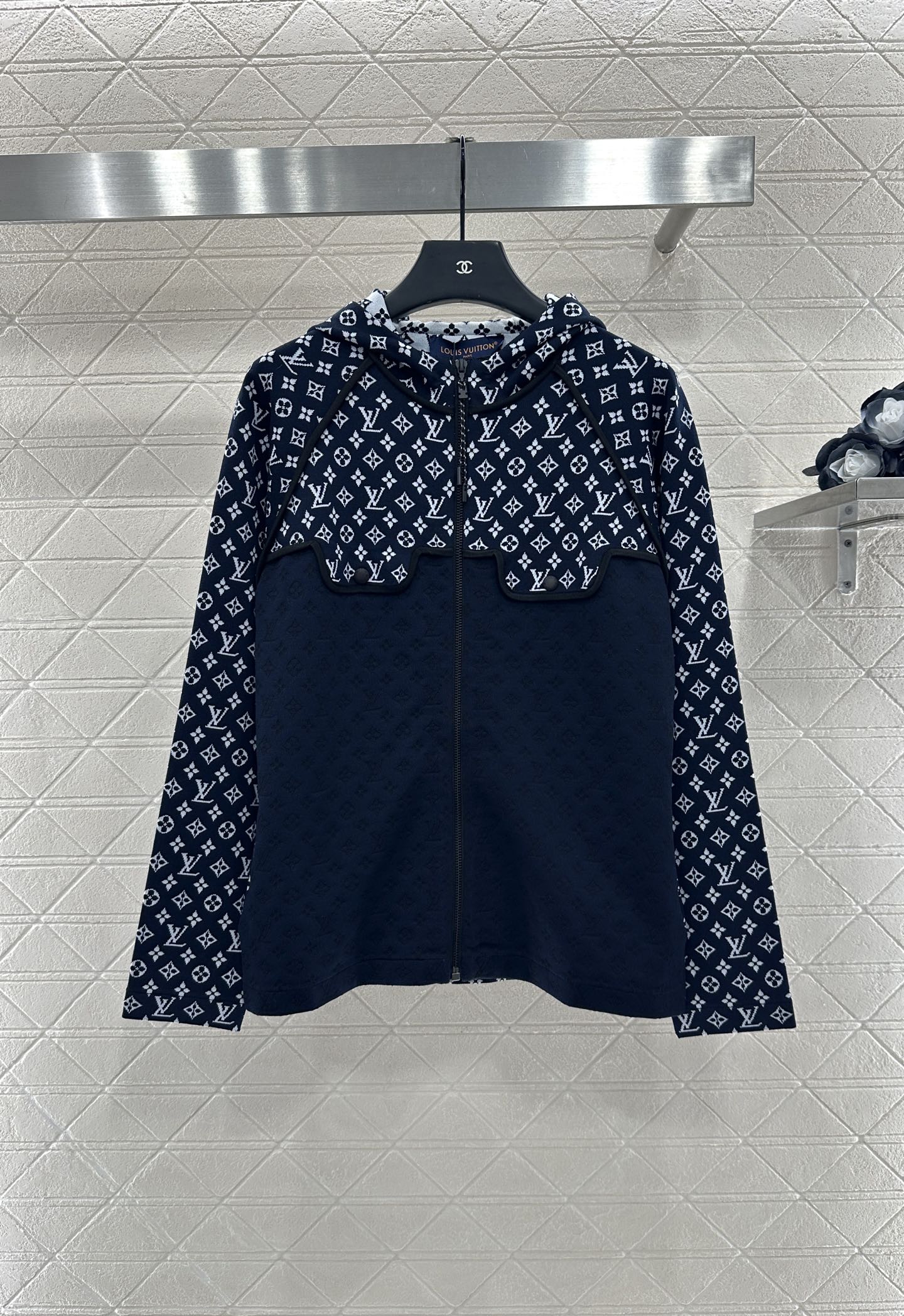LV25 Patchwork Jacquard Hooded Jacket in Navy Blue Mulberry Silk 294493