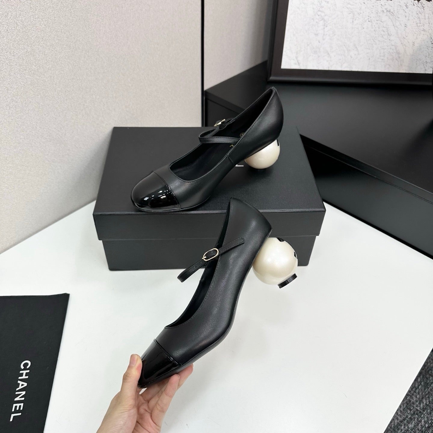 CC 25 FW Mary Janes with Faux Pearl 85mm Black Lambskin