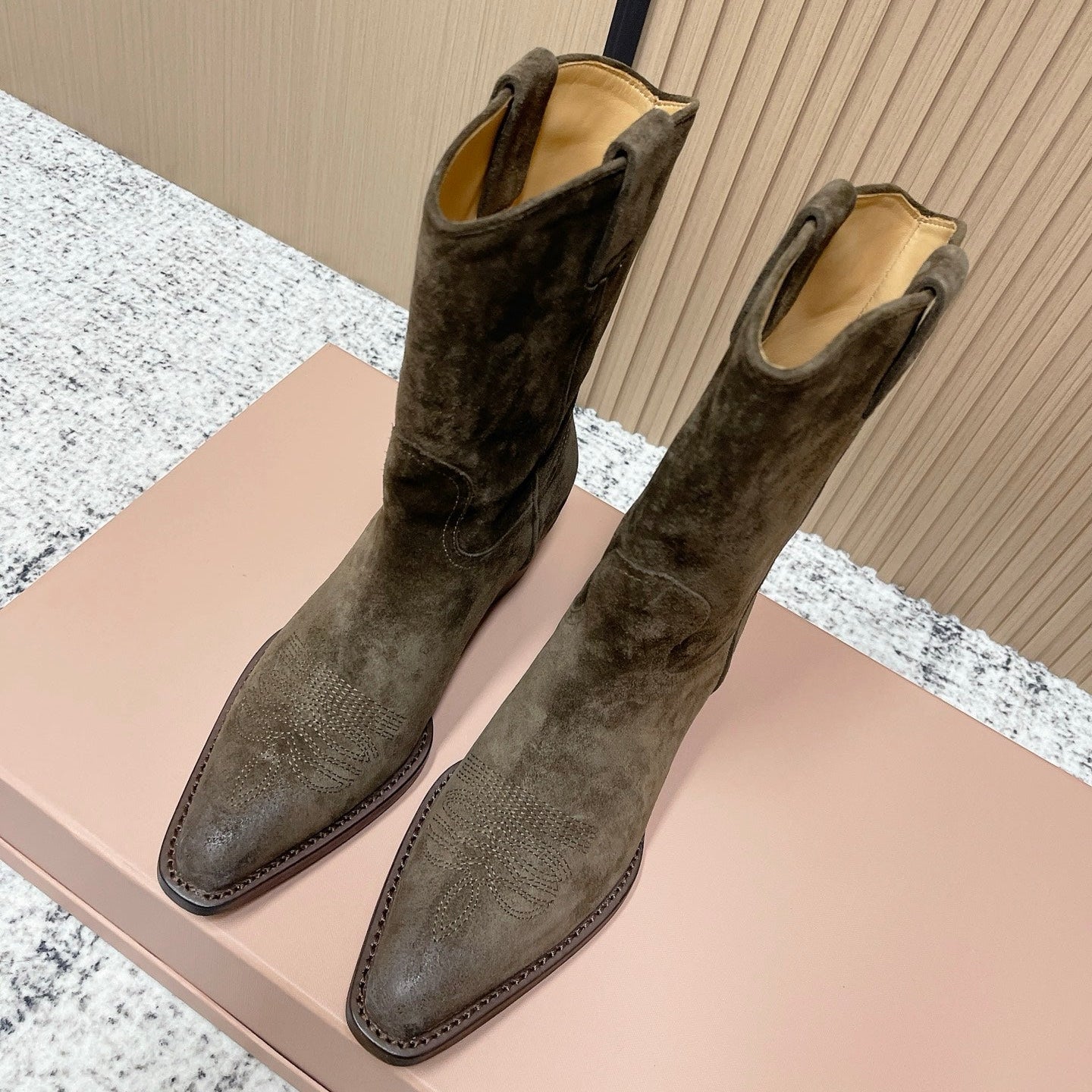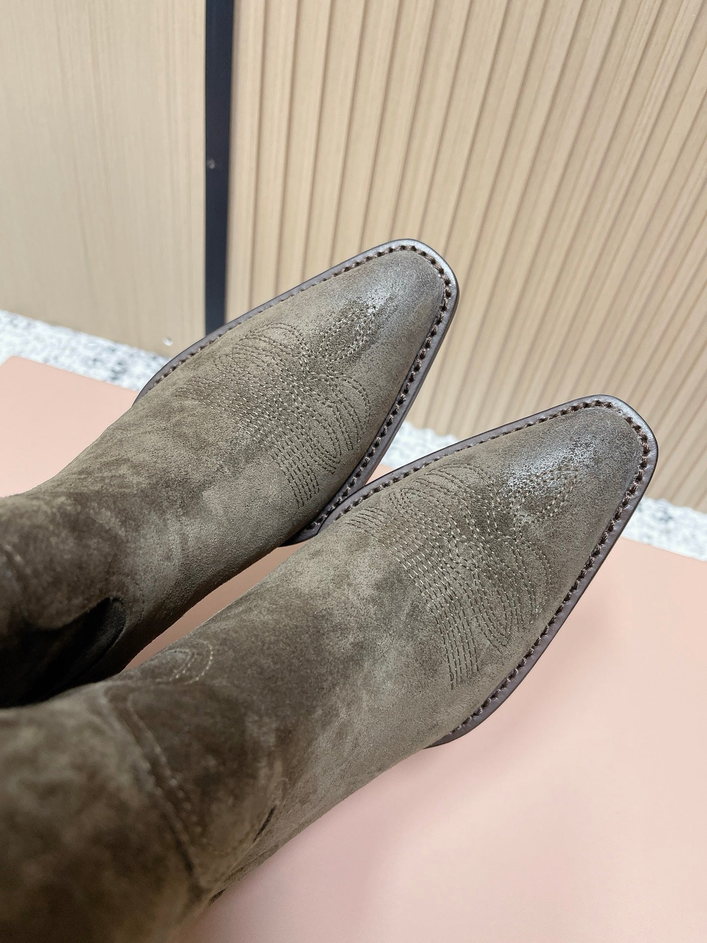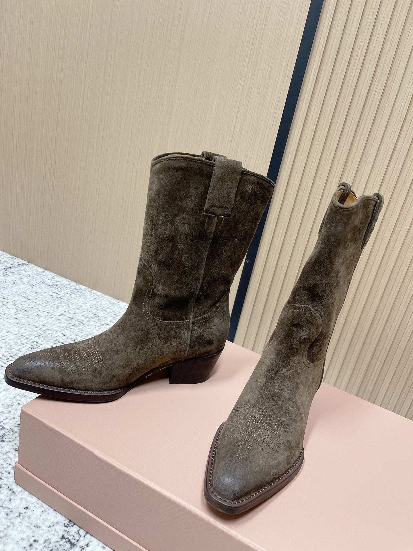 Miumiu Latest FW Western Cowboy Boots olive green Suede 533967