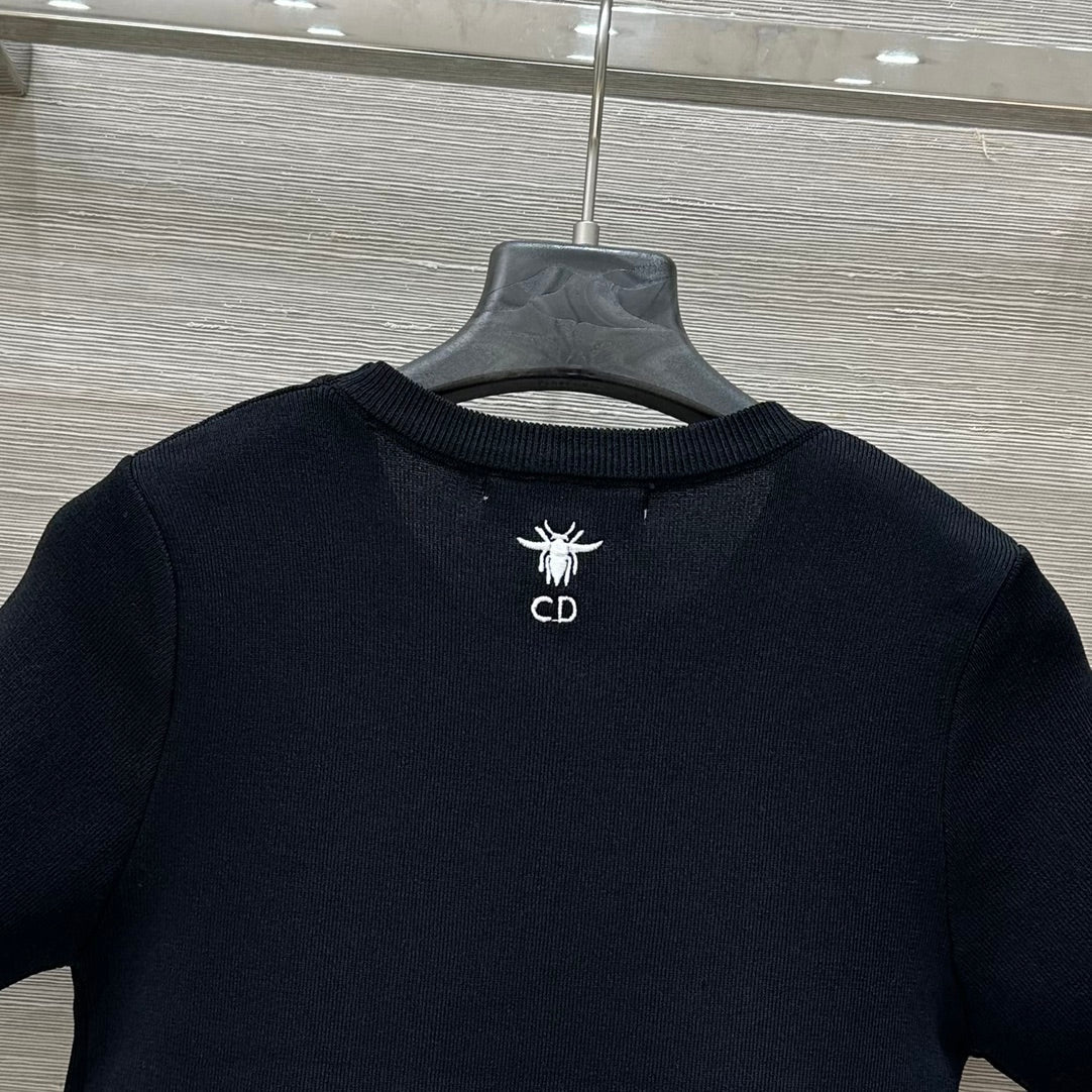 CD 25 Star Embroidery Knitted Short-sleeved Top Black Tencel Wool