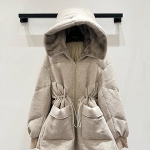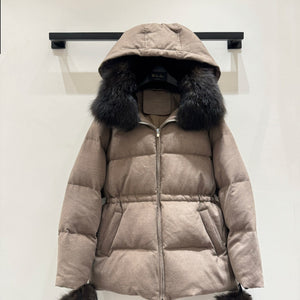 LP 25 Hooded Long Goose Down Light Gray Jacket with Fur Trim 124985