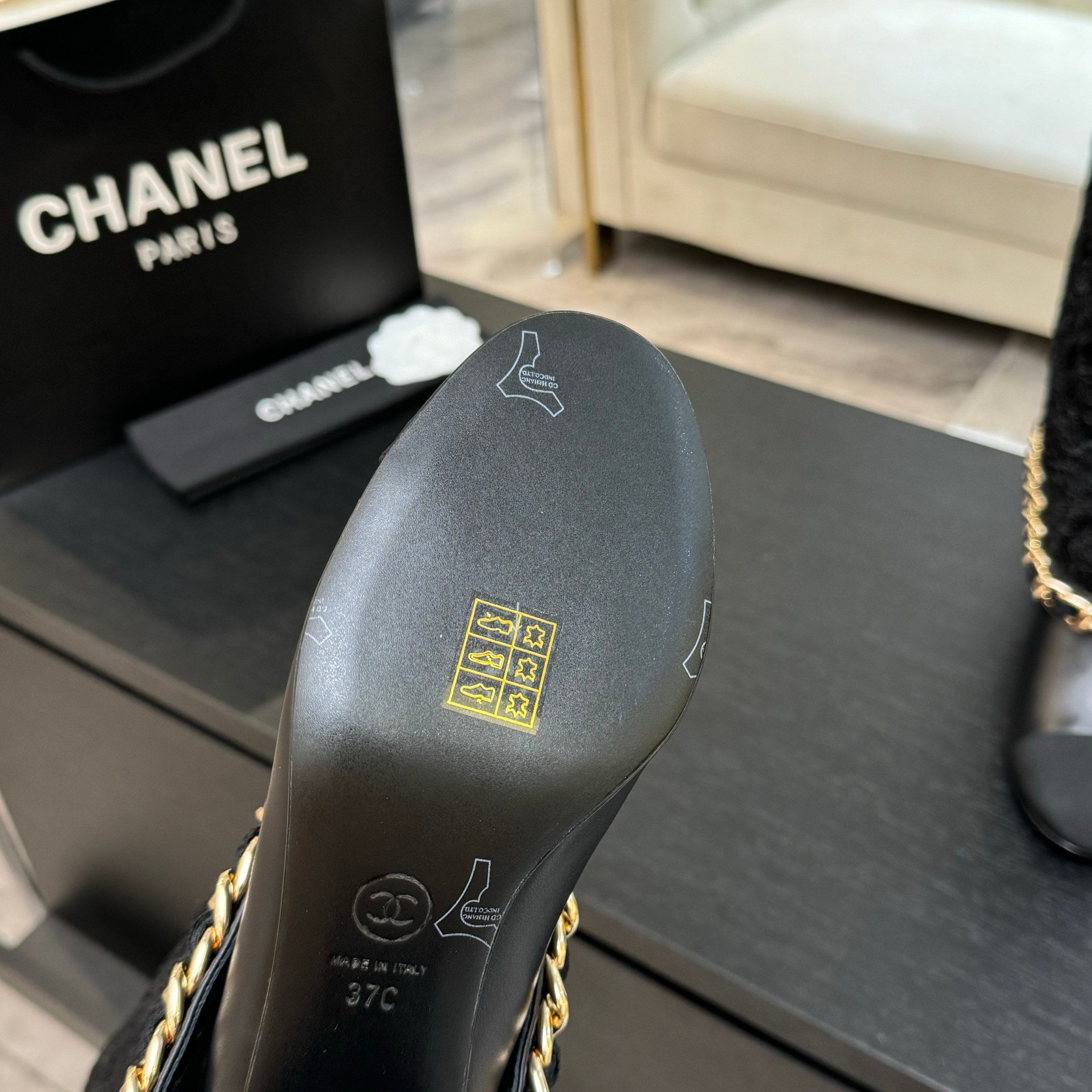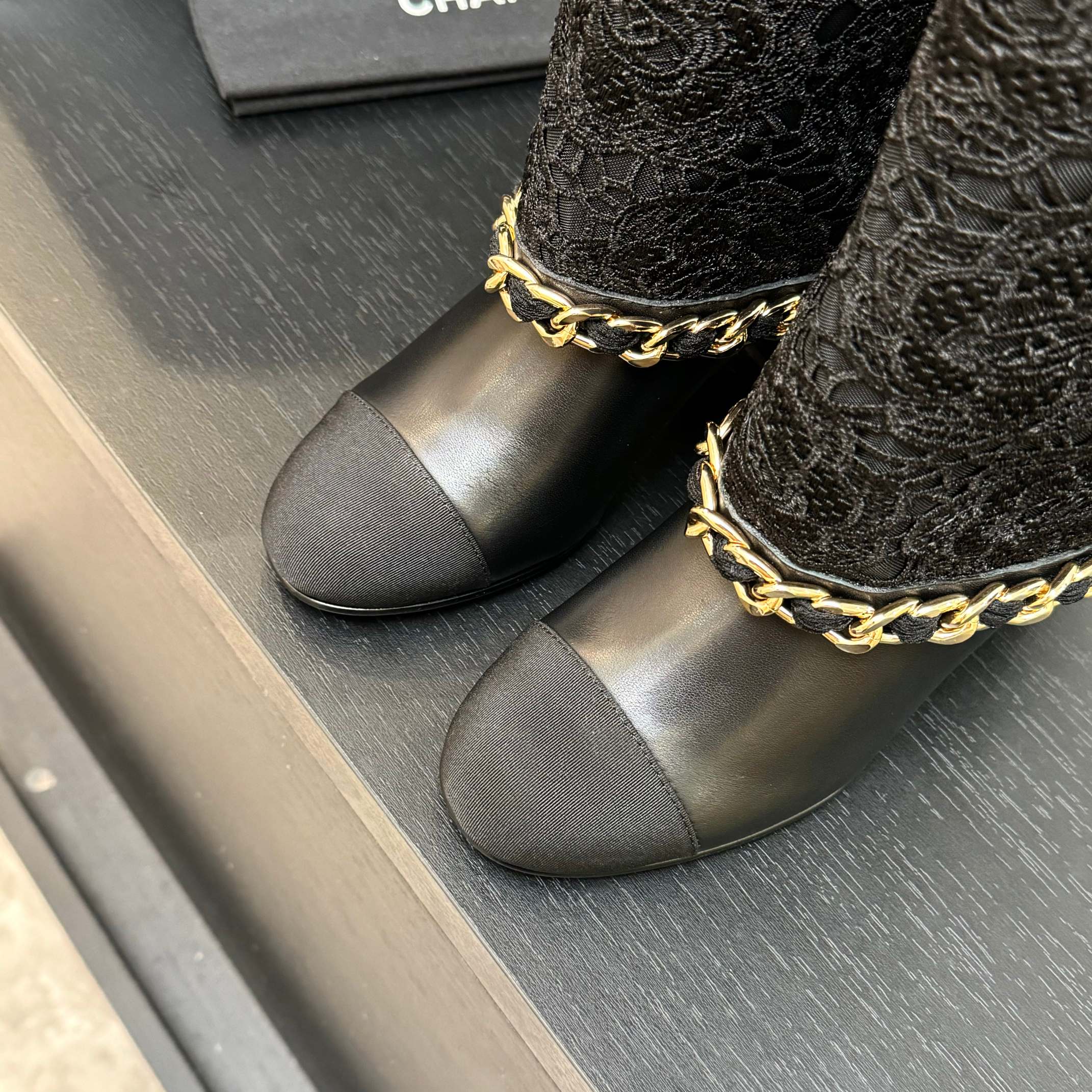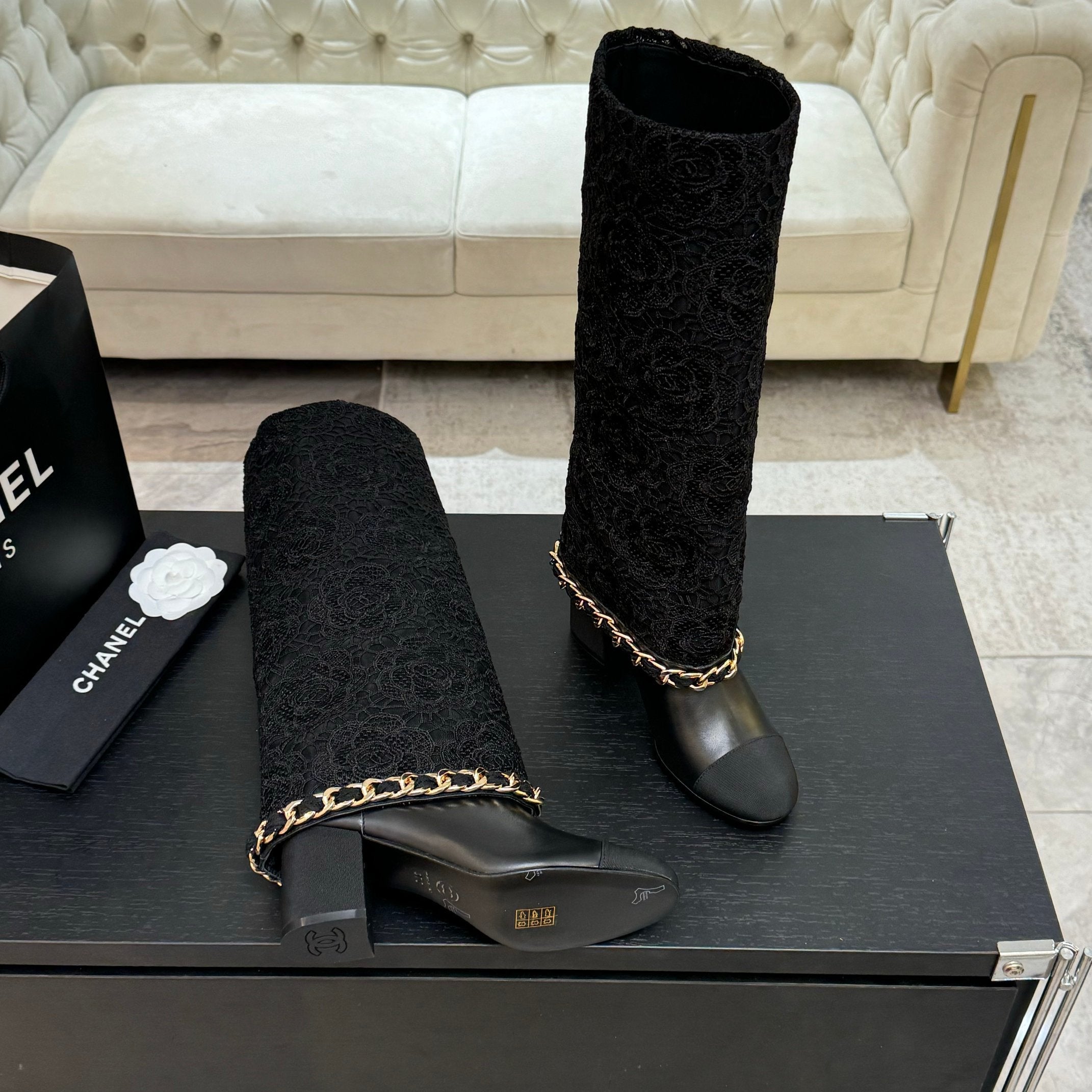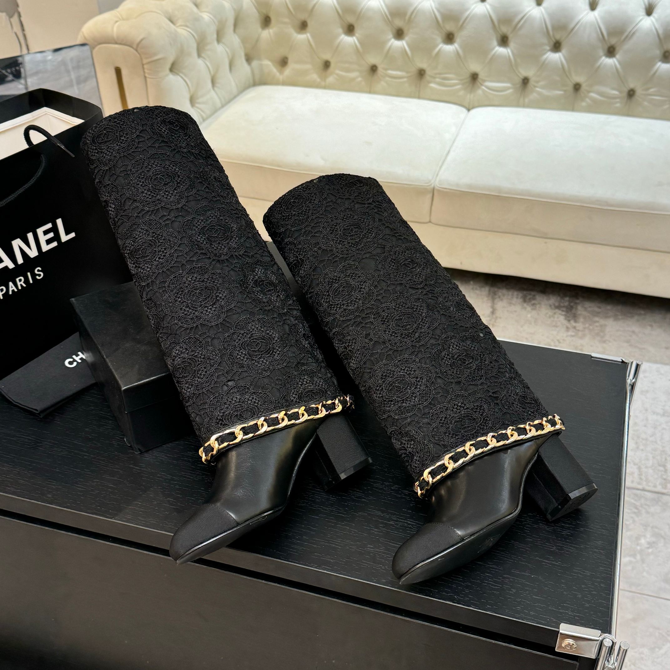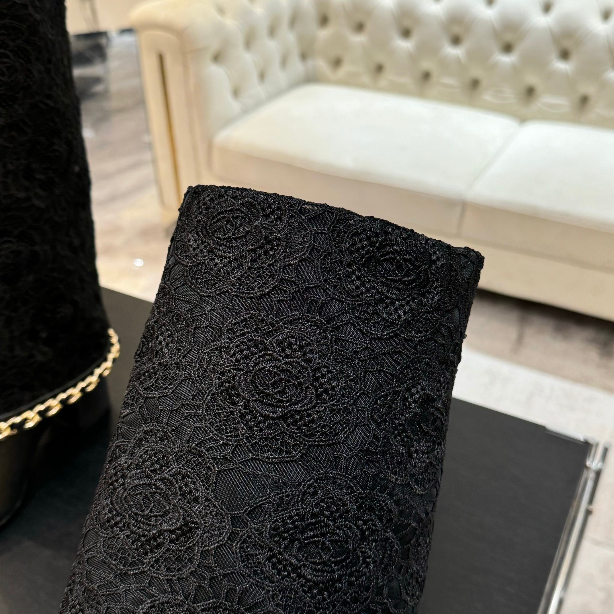 CC 25B High Boots Black Lace With Chain And Grosgrain 373806