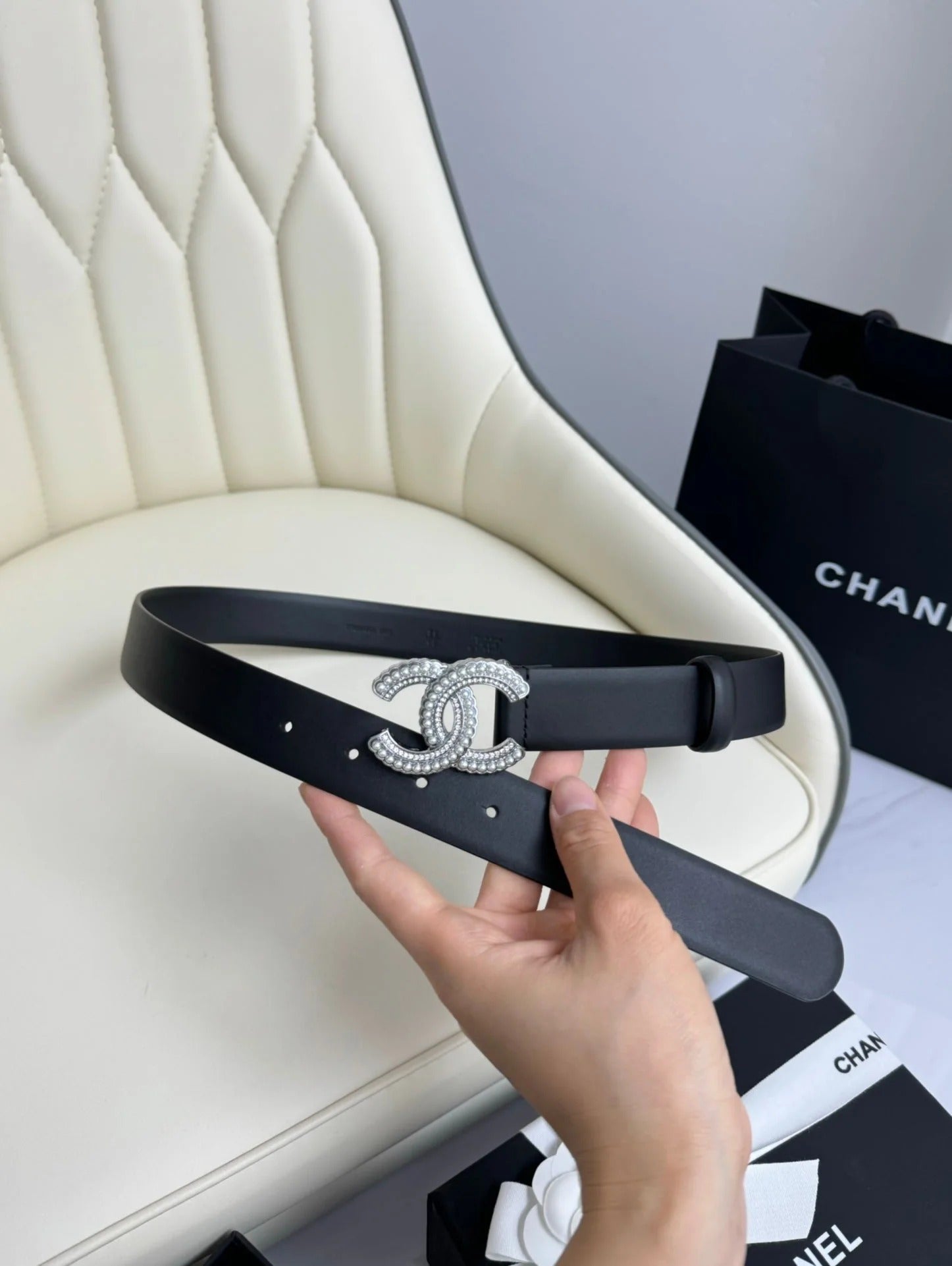 CC BELT 30MM IN BLACK SMOOTH CALFSKIN SILVER HARDWARE ATTACH PEARLS