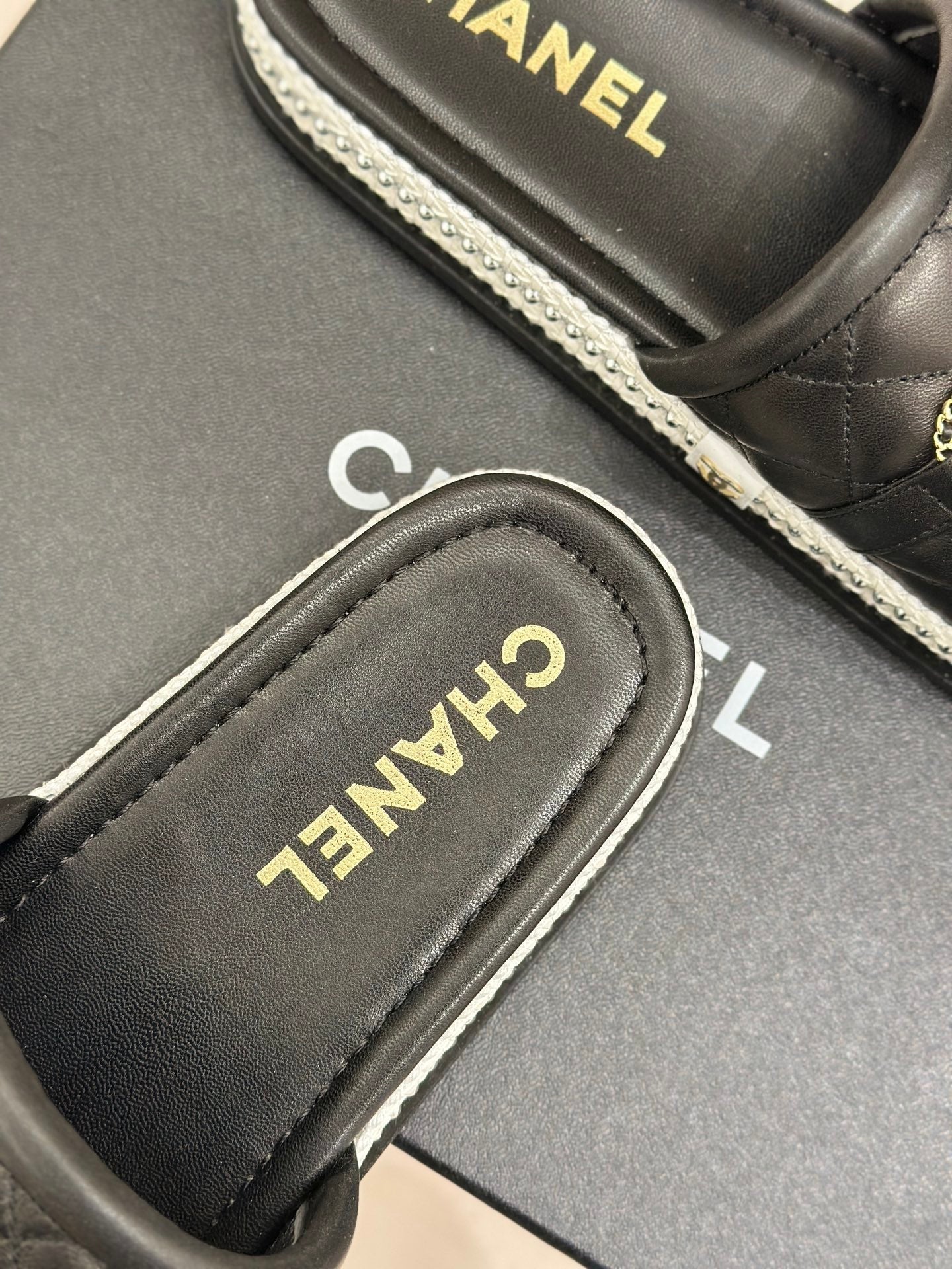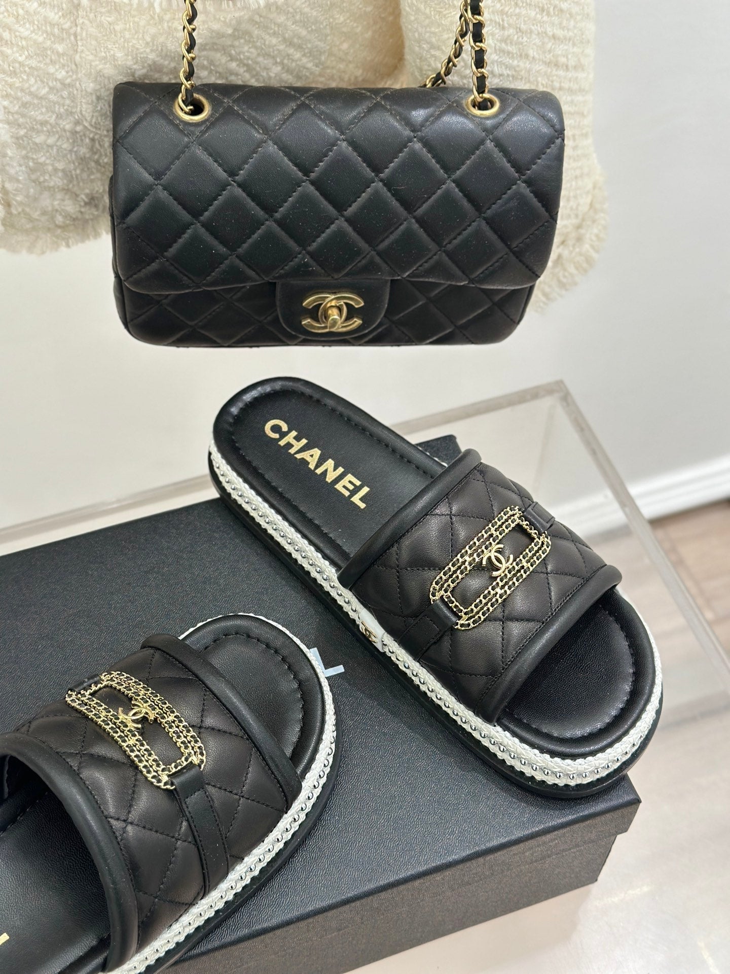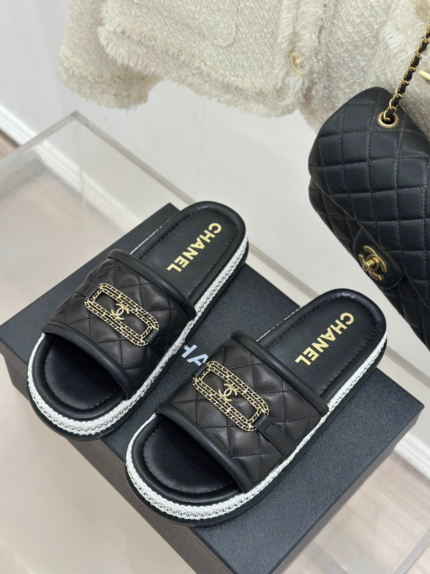 DIAMOND QUILTED CHAIN LAZY SLIPPERS IN BLACK LAMBSKIN