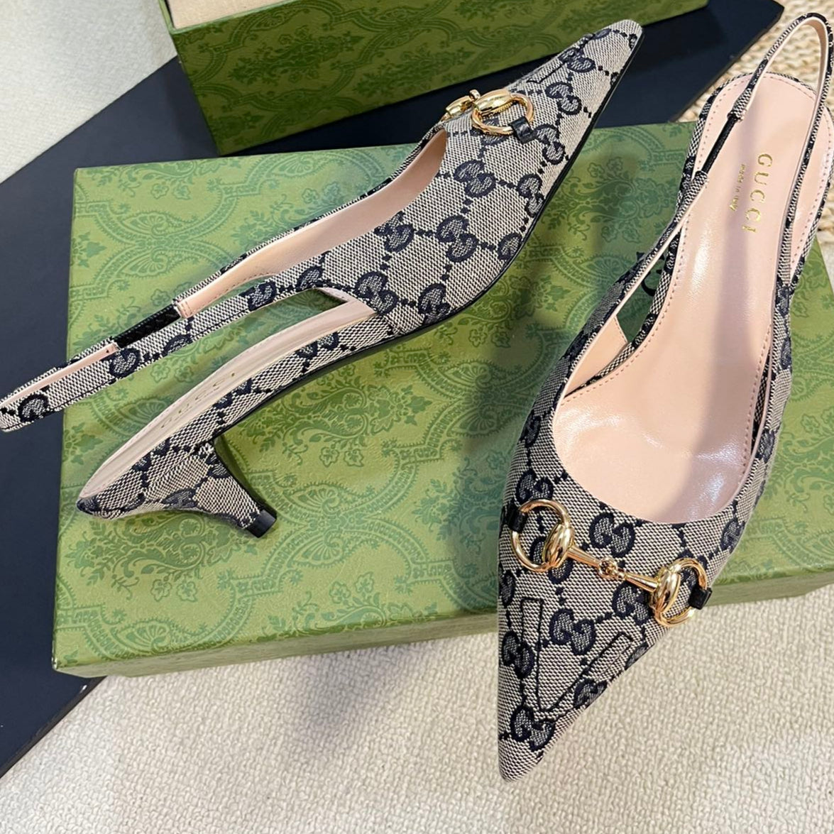GC Horsebit Slingback Pump 50mm Beige mix Blue Canvas Sheepskin 294559