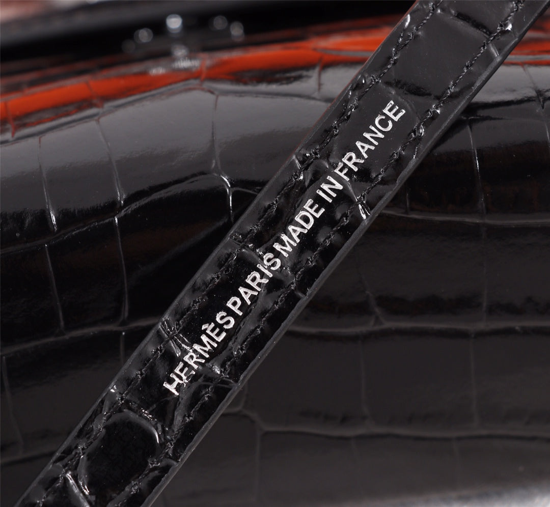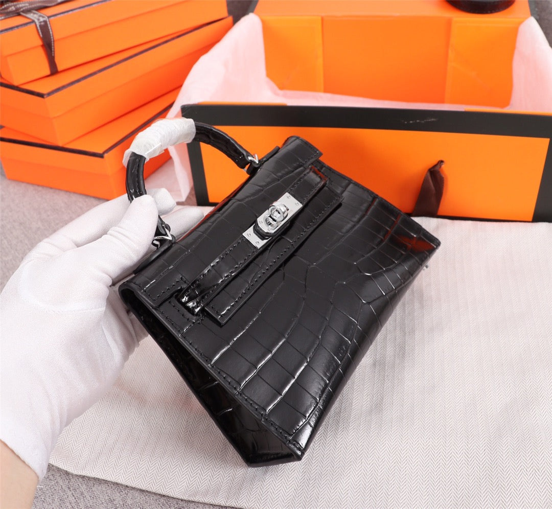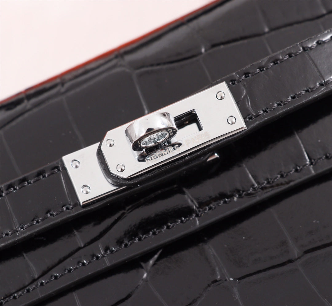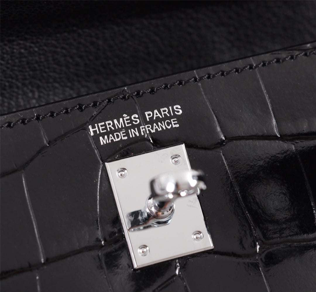 HM KELLY MINI 19.5 BLACK CROCODILE EMBOSSED CALFSKIN SILVER HARDWARE