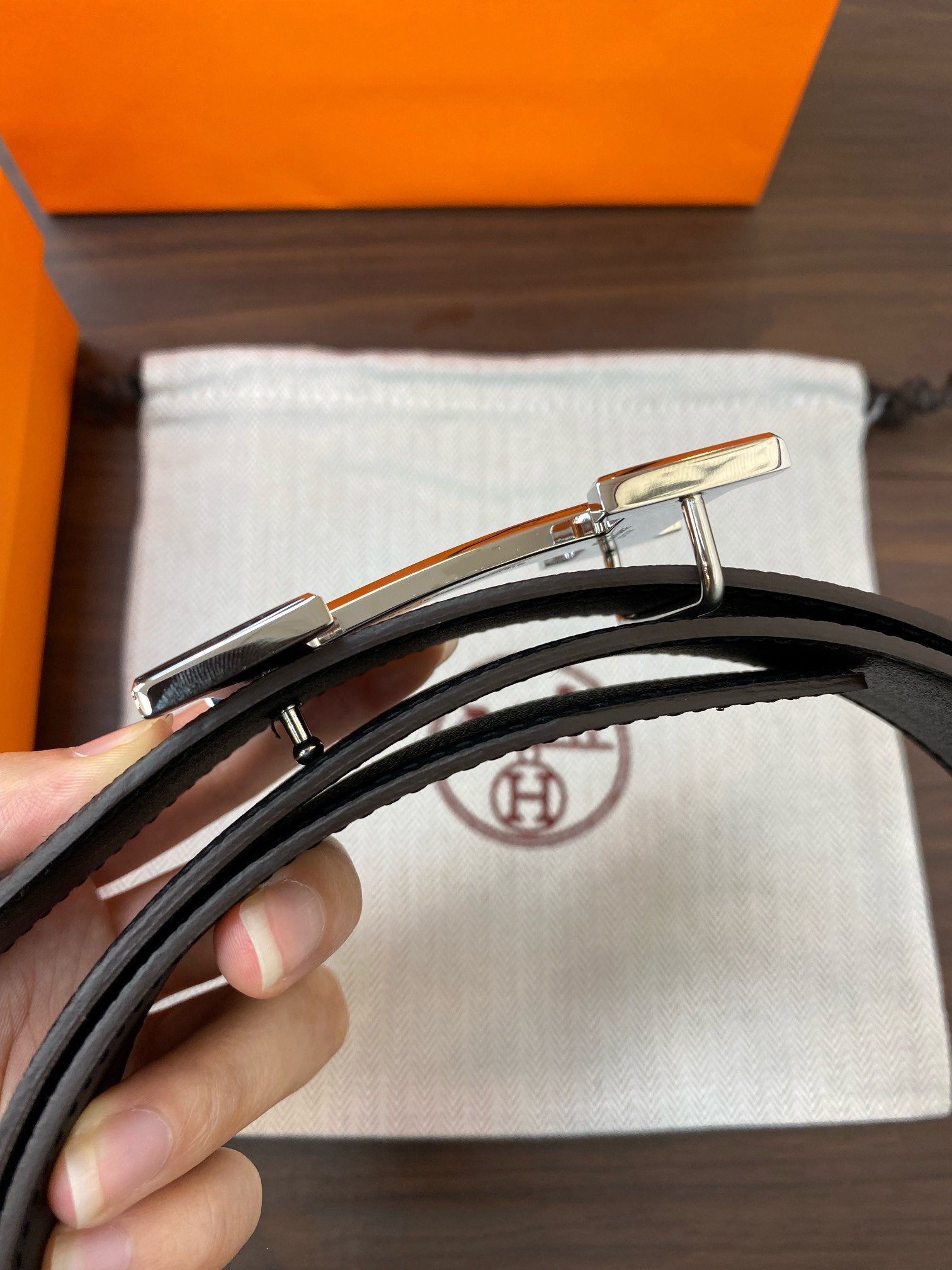 • H Buckle in permabrass plated metal.