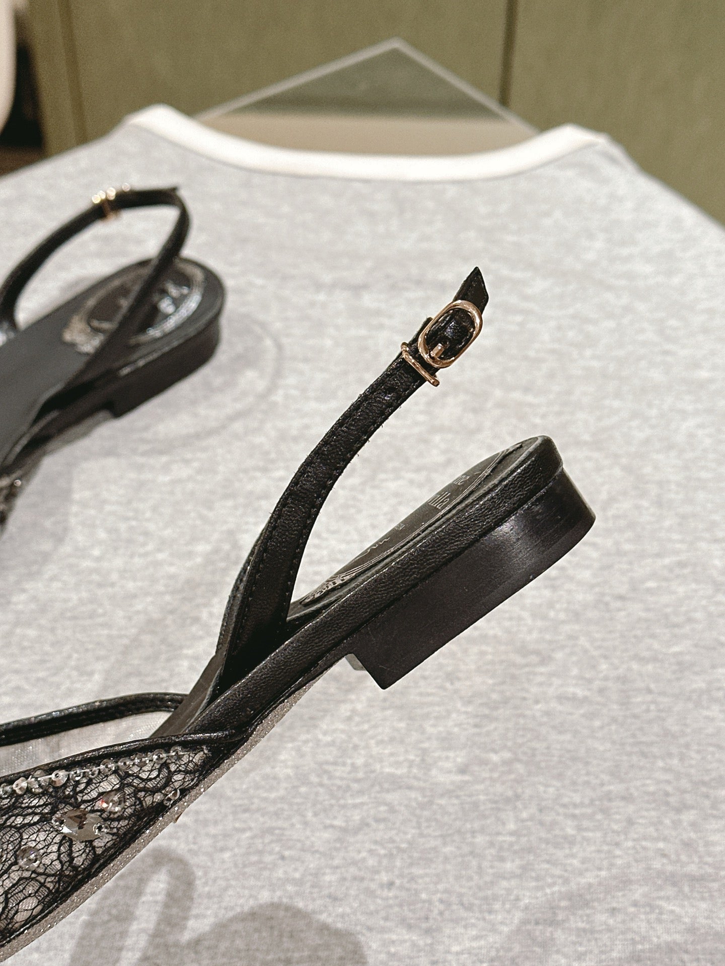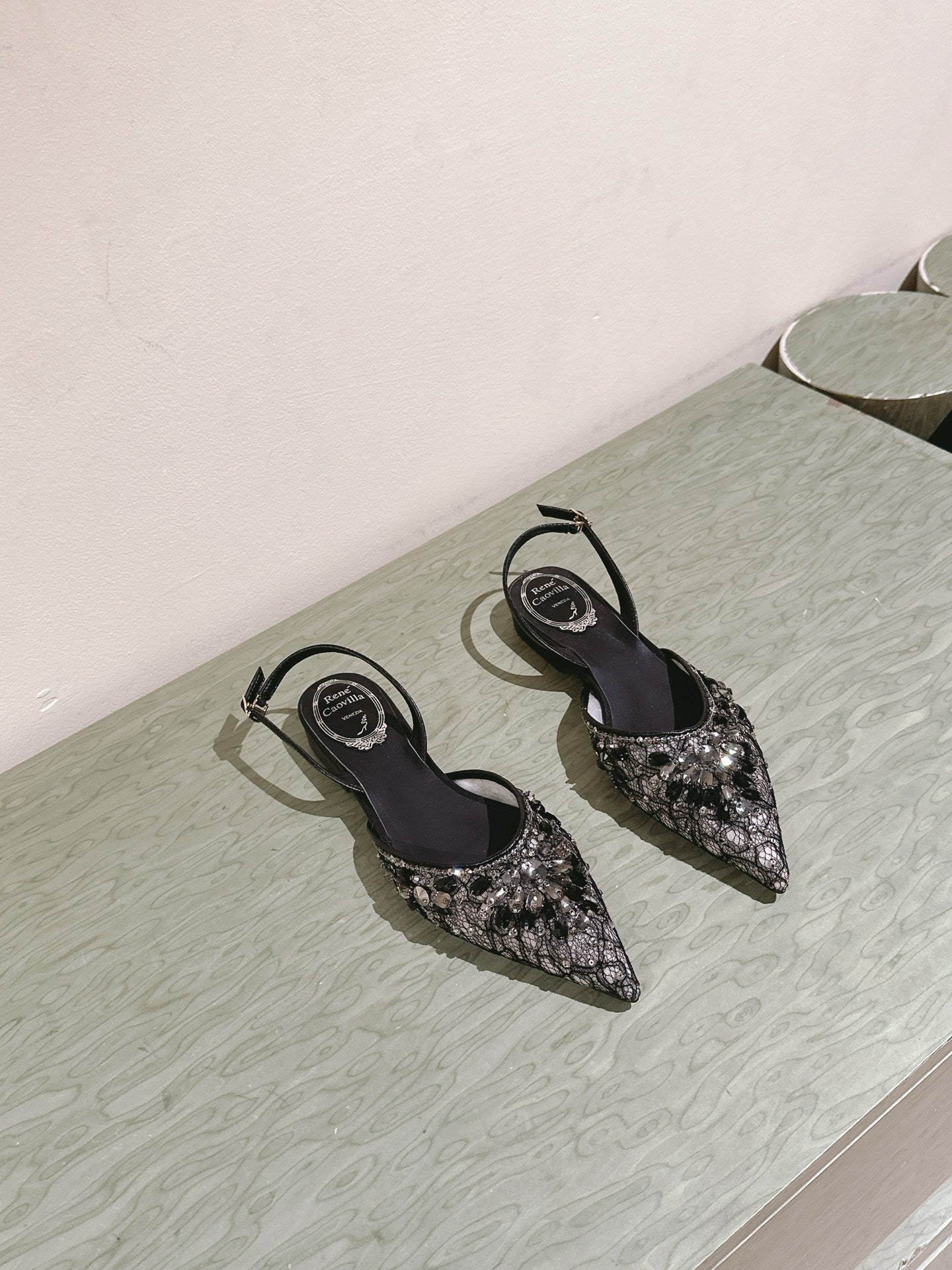 RC 25 Diamond Lace High Heeled Sandals Black Sheepskin 268055
