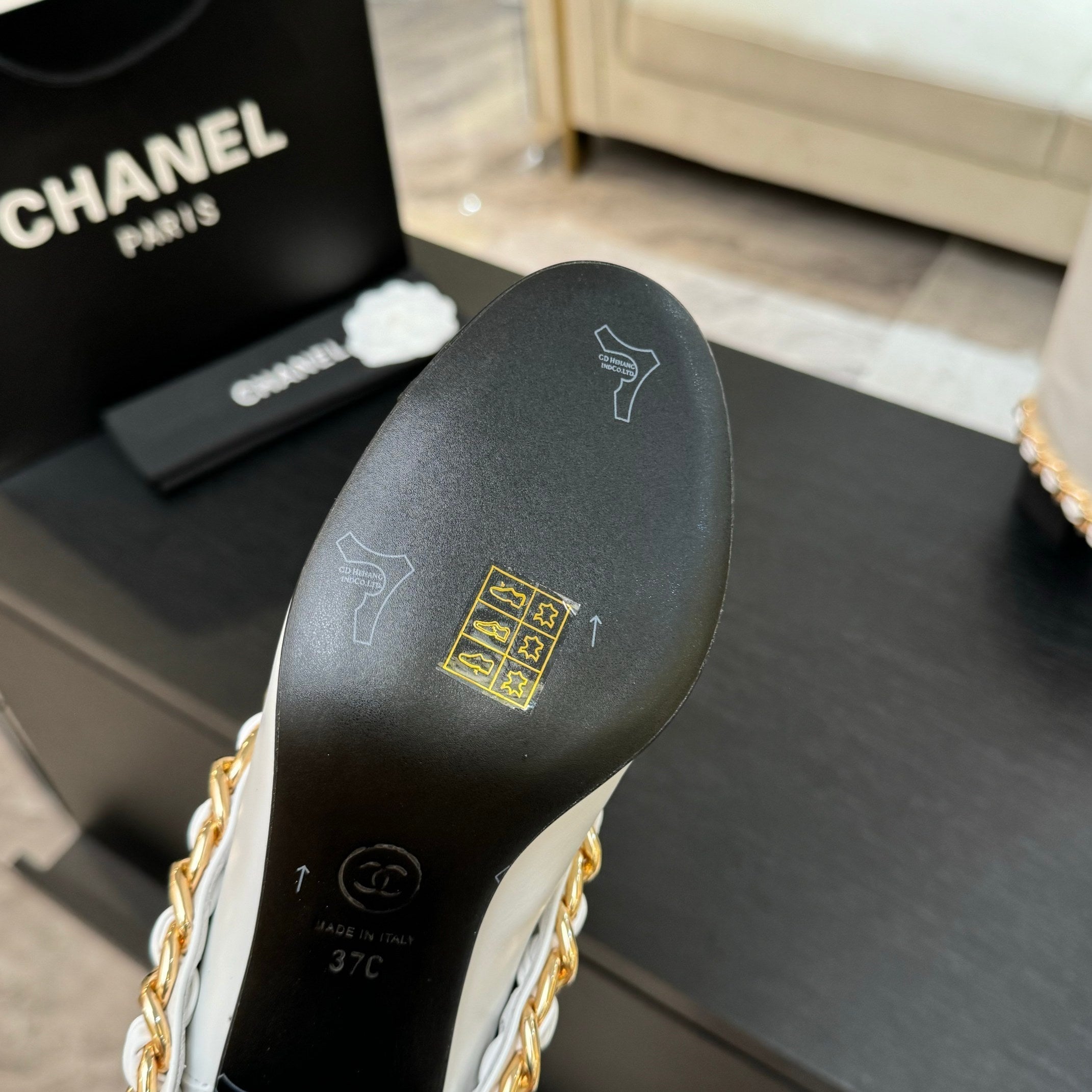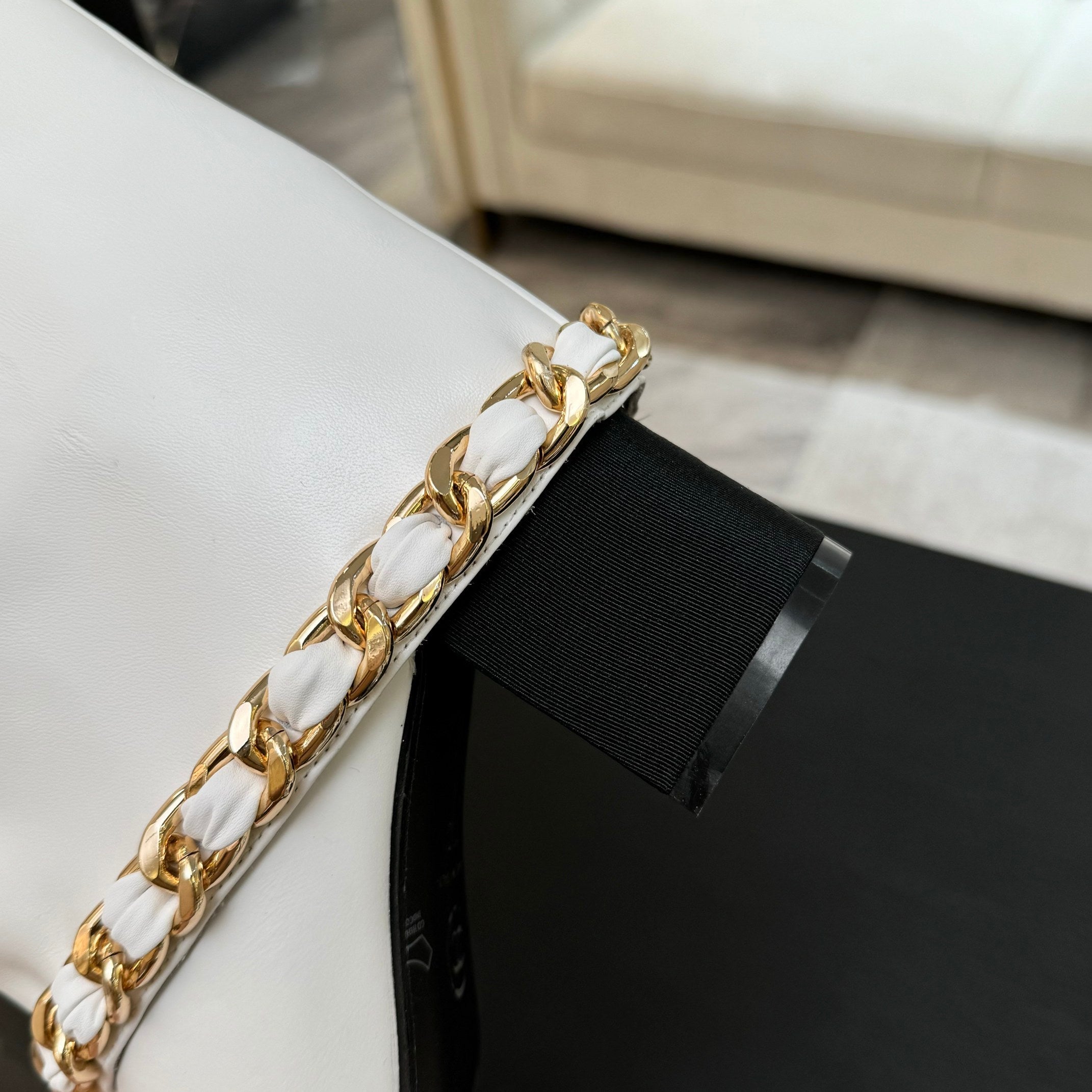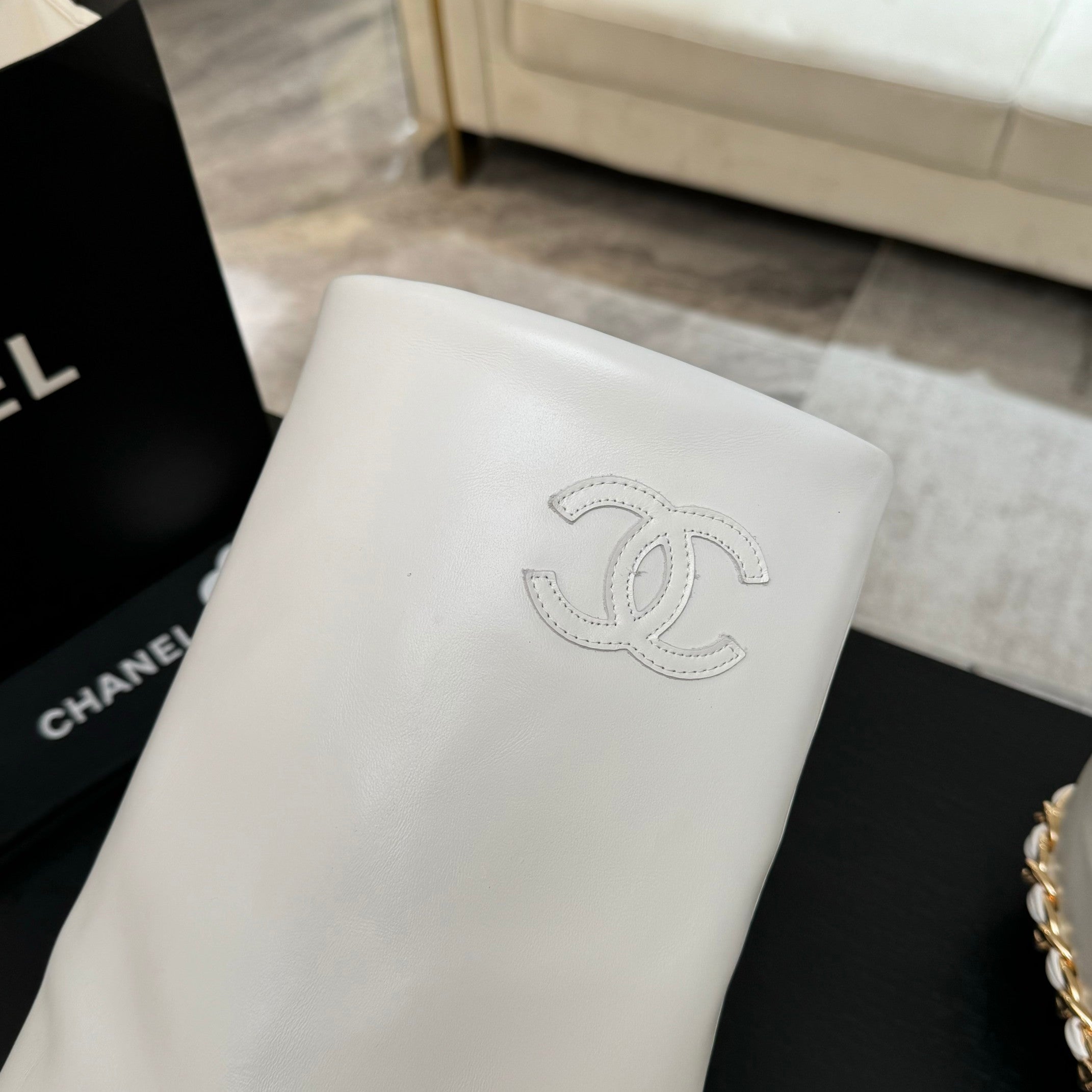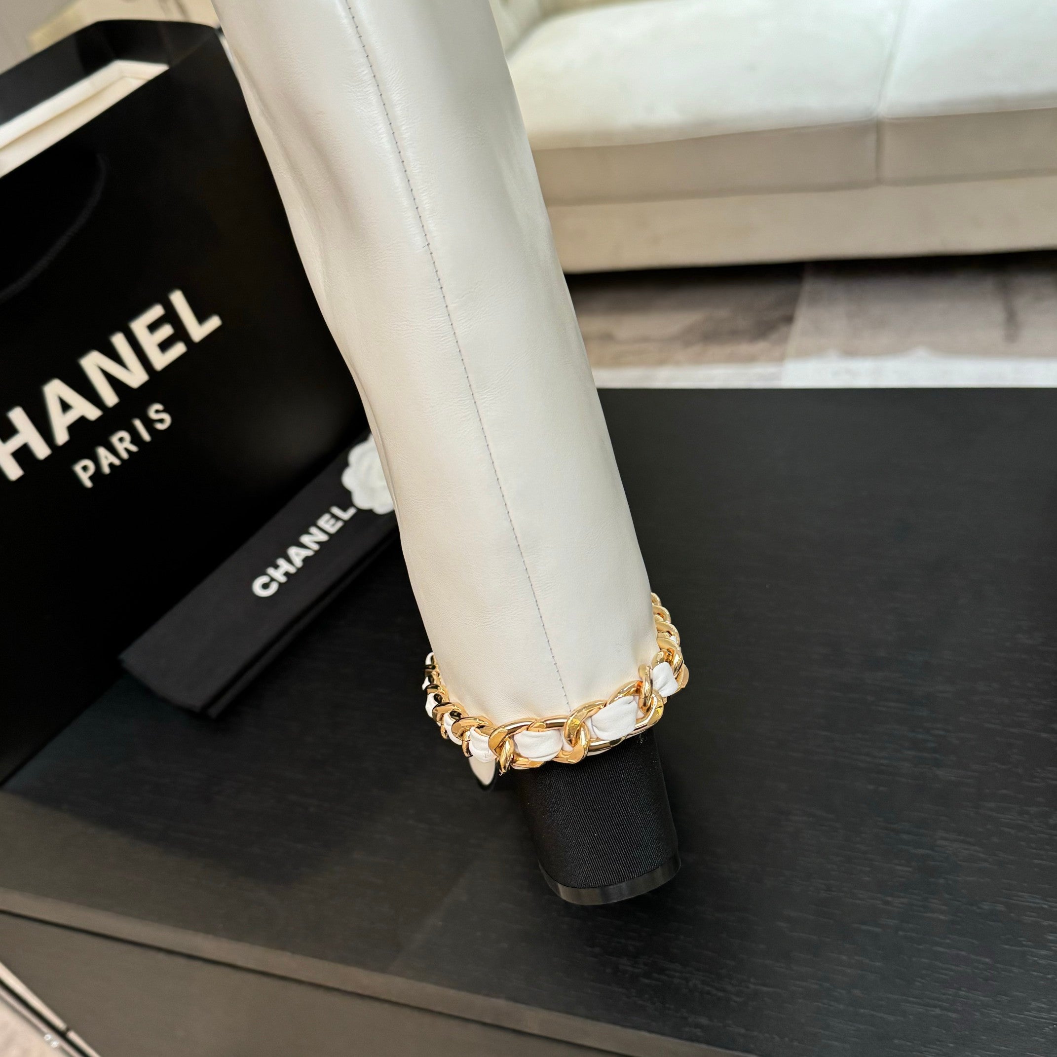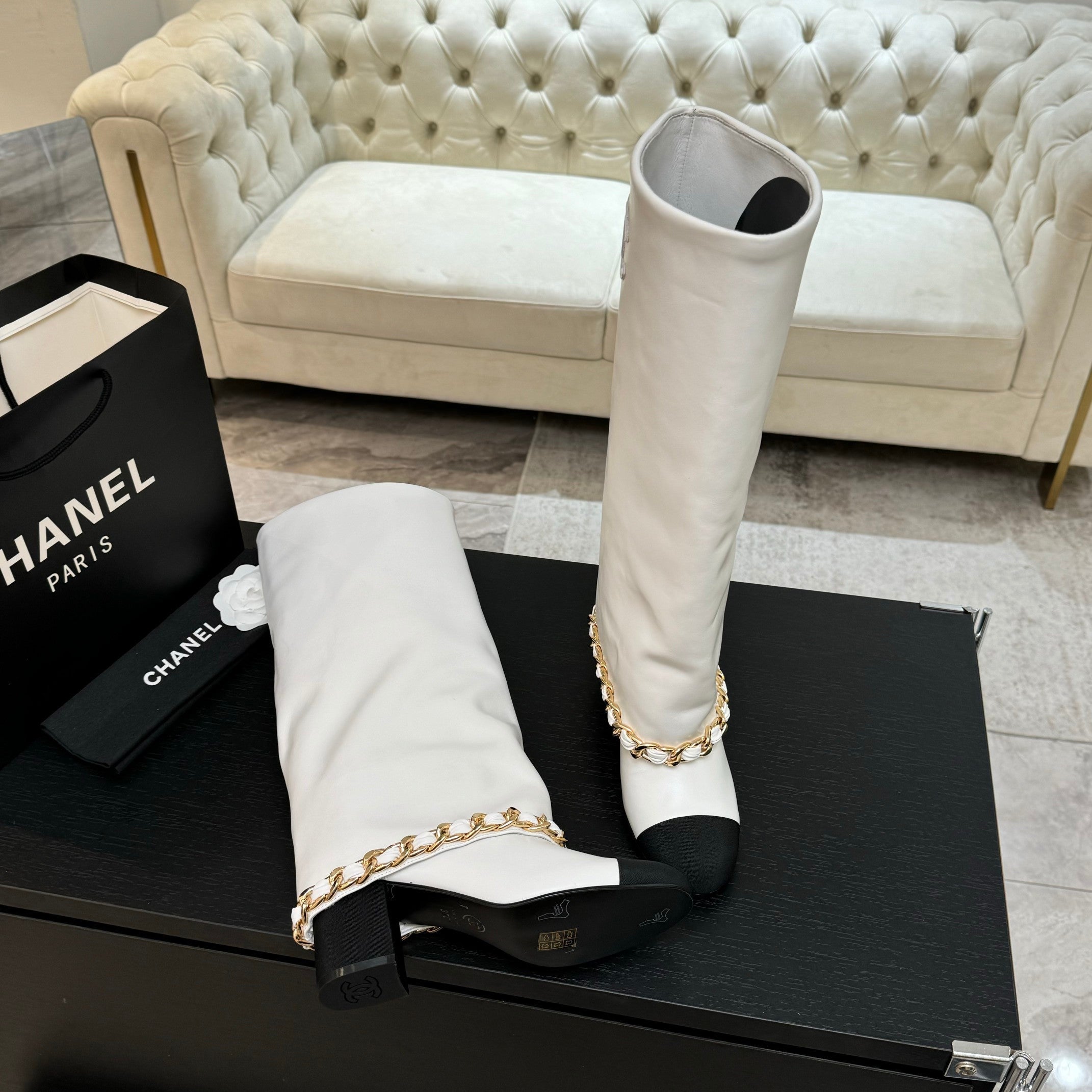 CC 25B High Boots White Sheepskin With Chain Black Grosgrain 373811