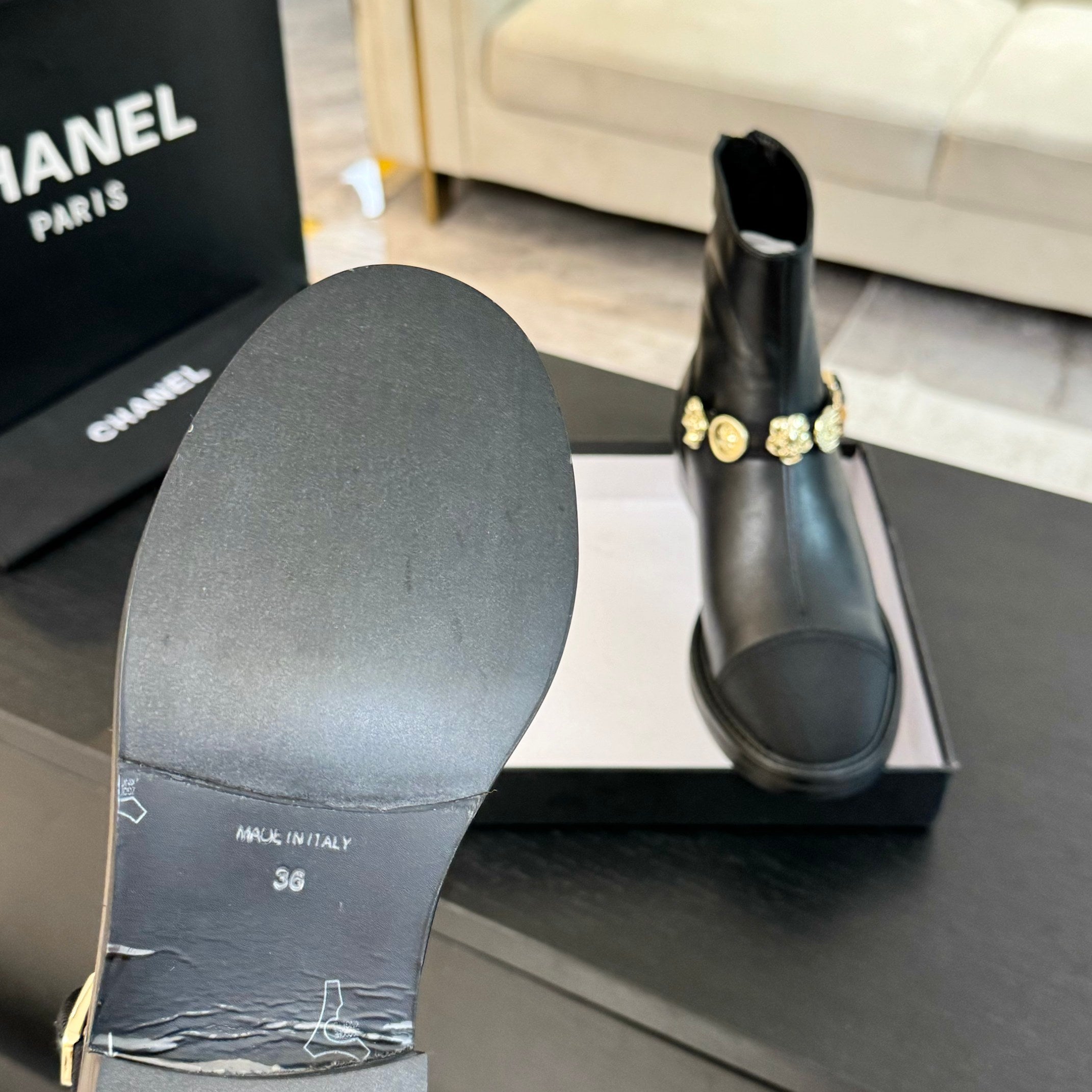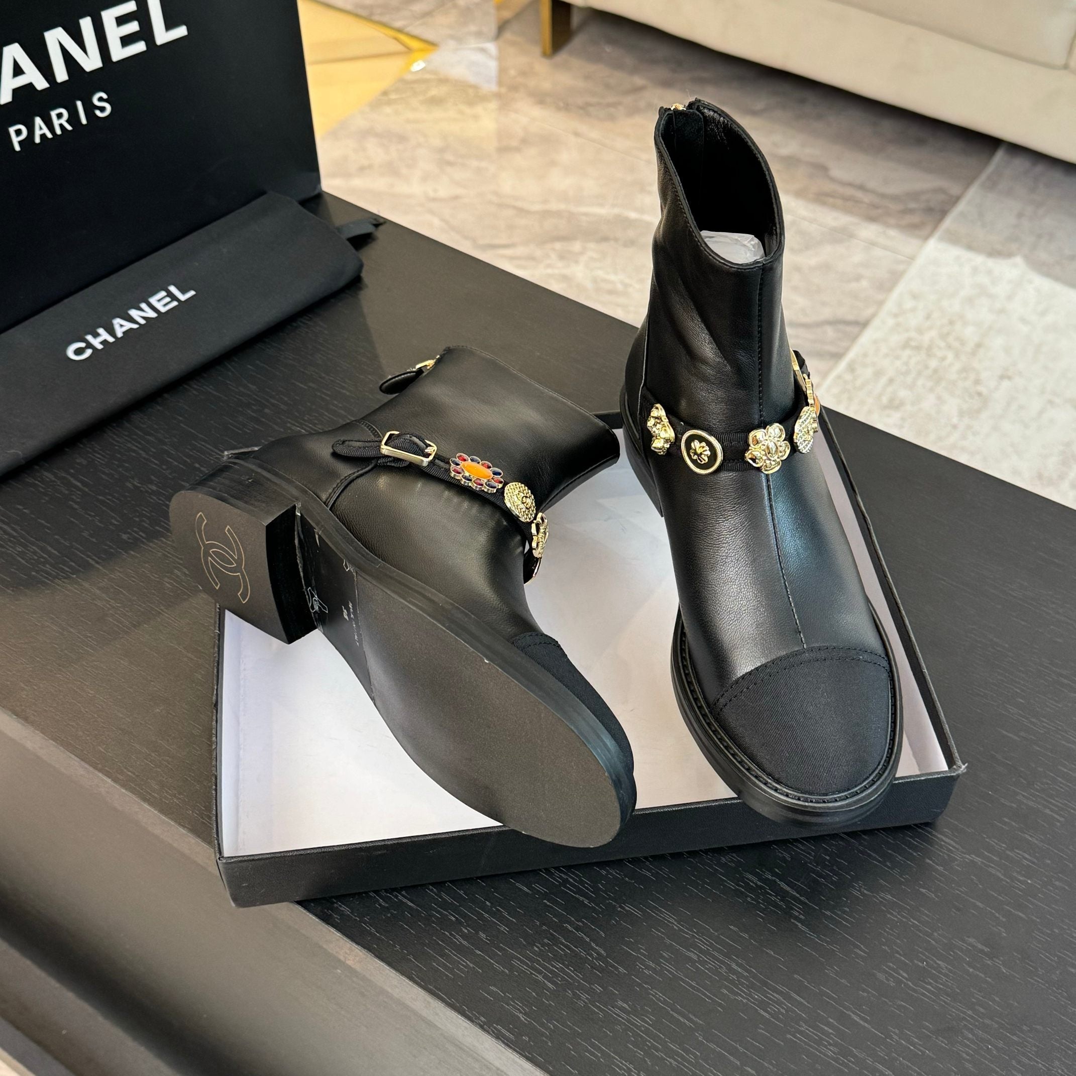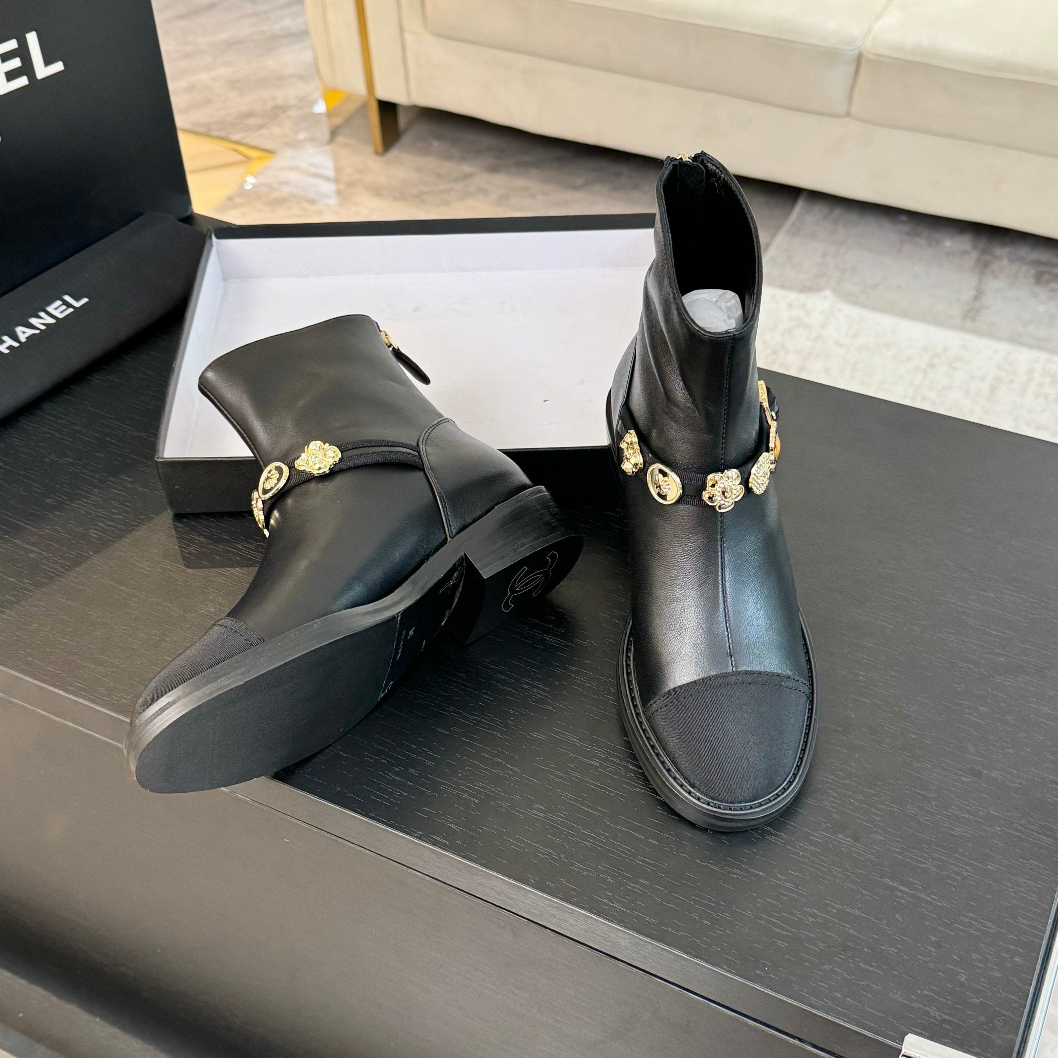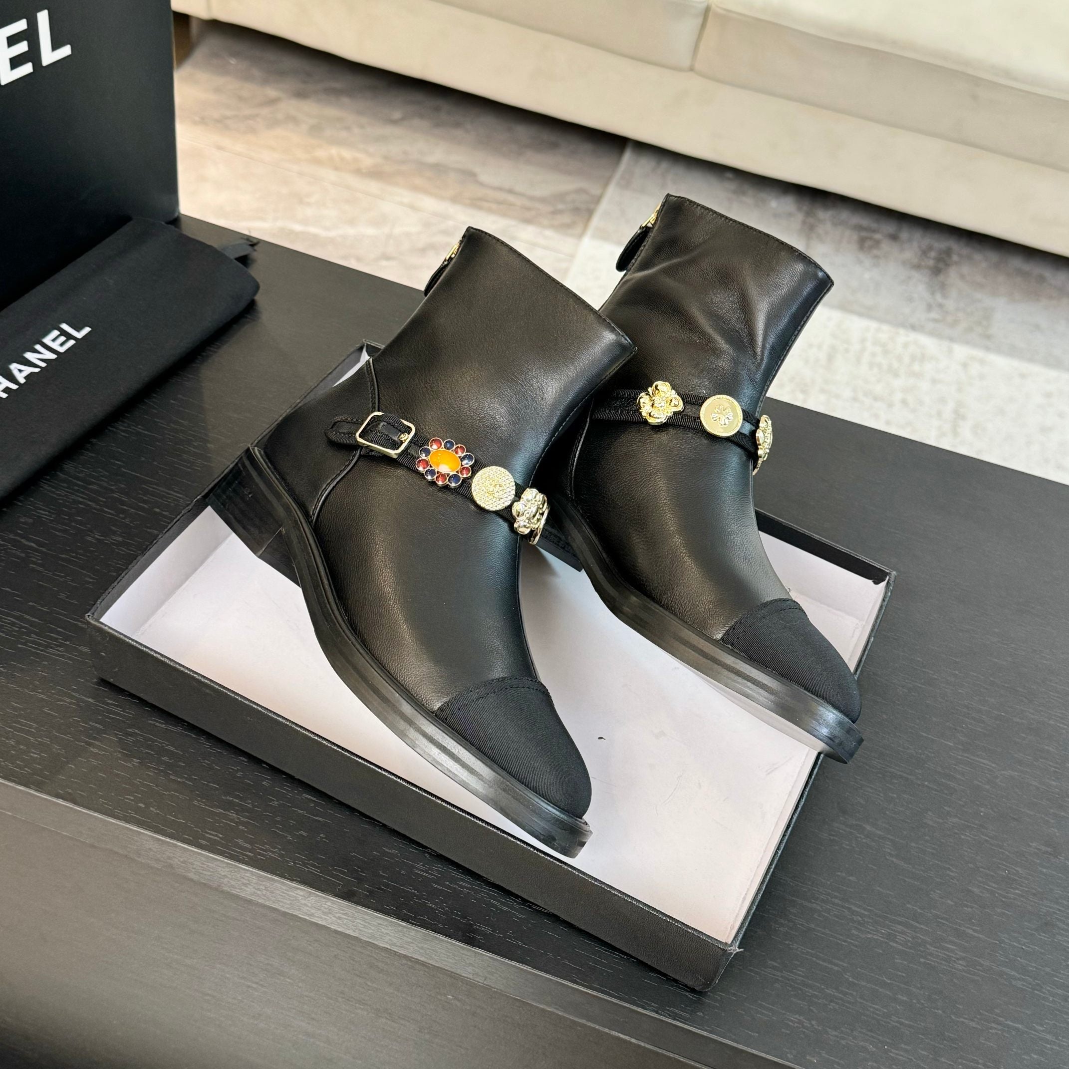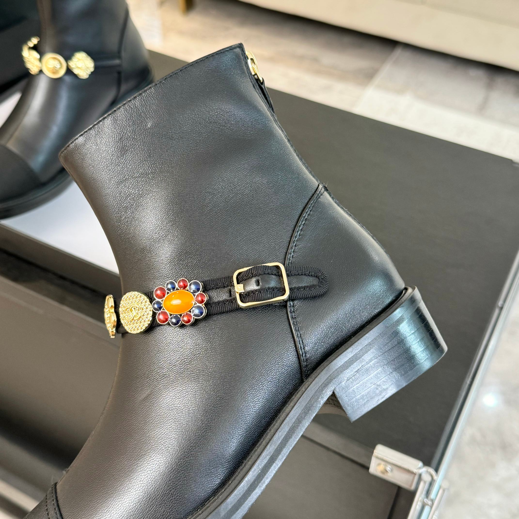 CC Short boots Black Cowhide Mix Fabric Denim