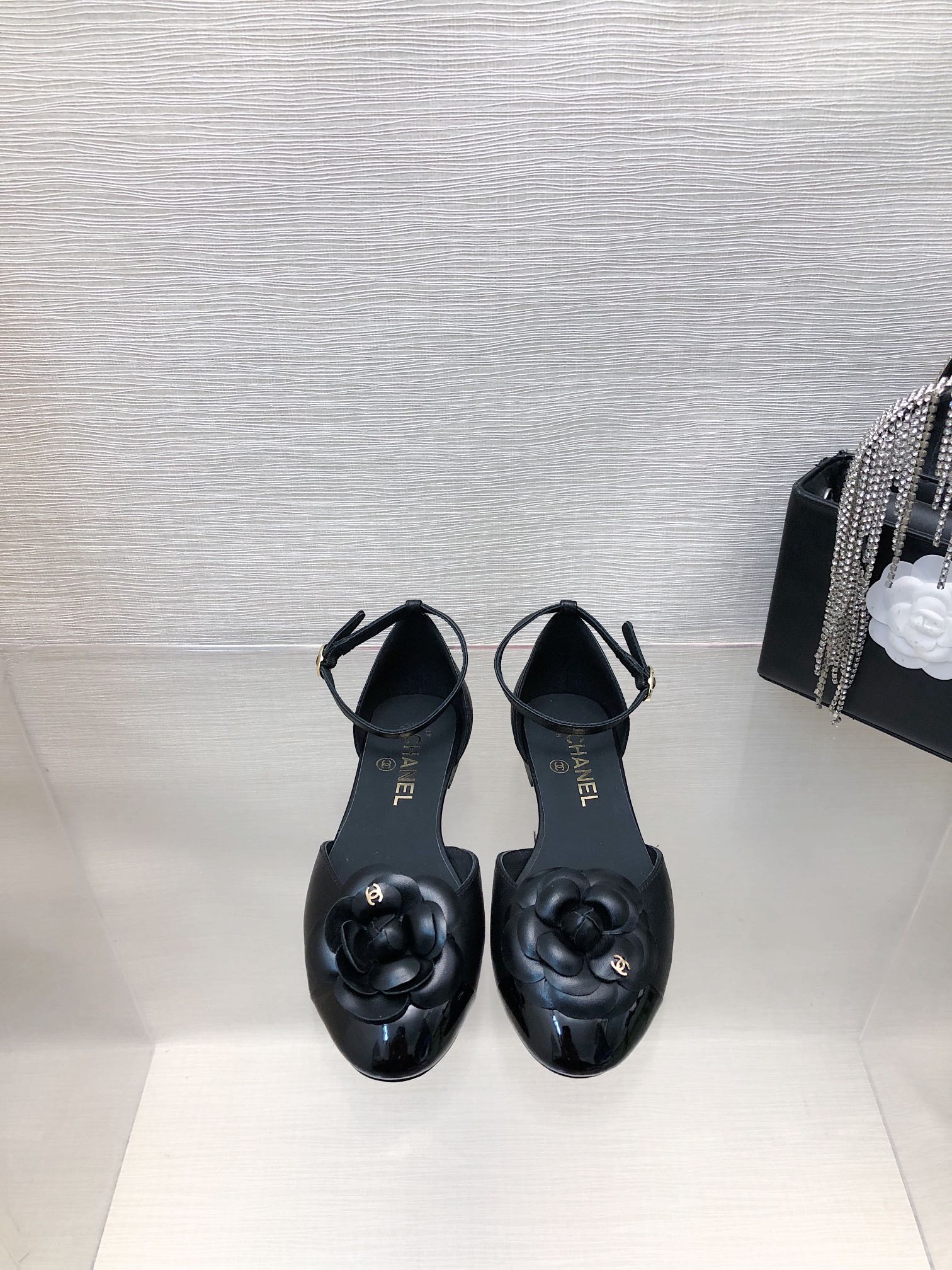 BLACK LAMBSKIN CAMELLIA HOLLOW SANDAL