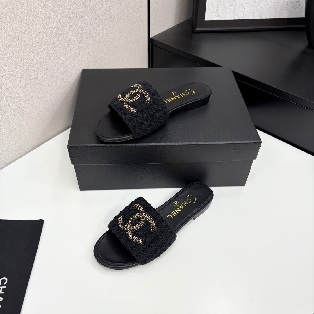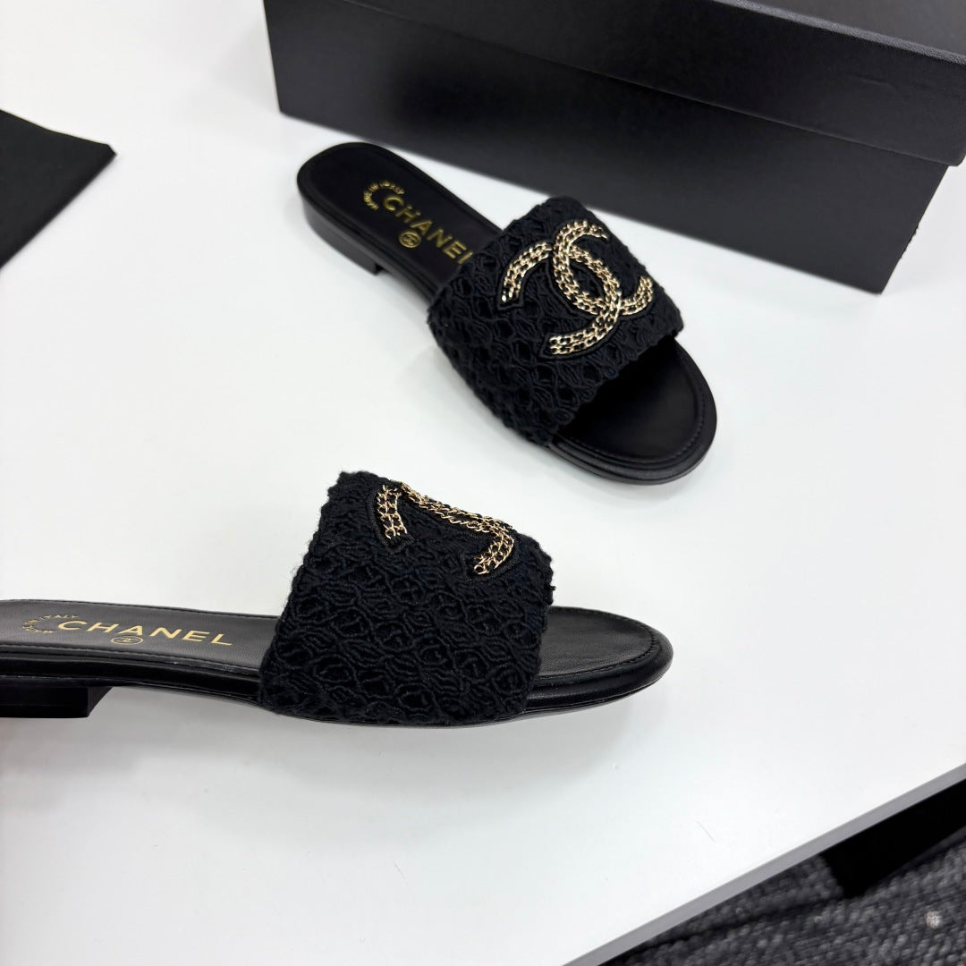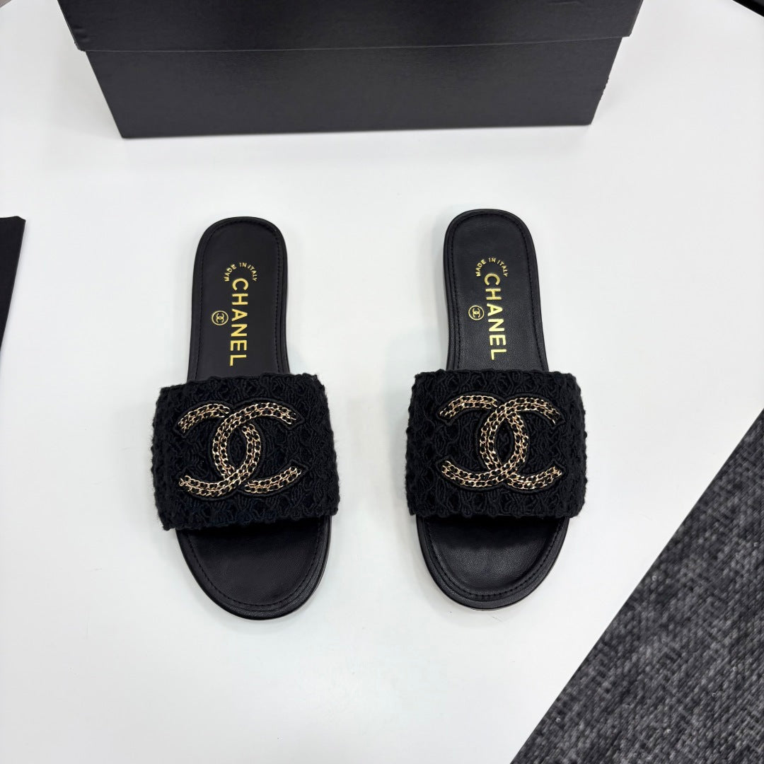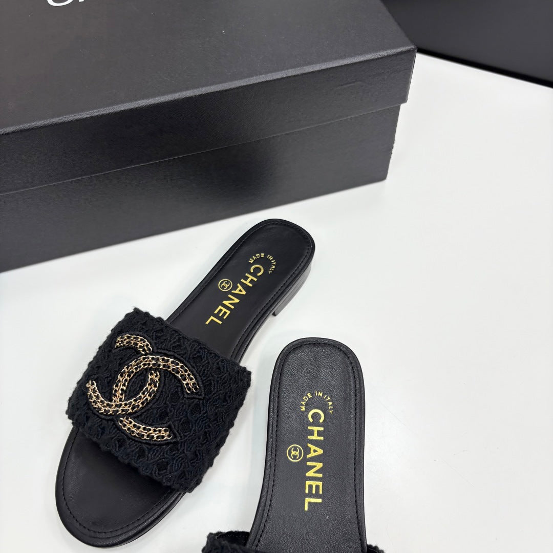 CC 25 Doubble Chain Embroidered Slippers Black Fabric And Sheepskin 352493