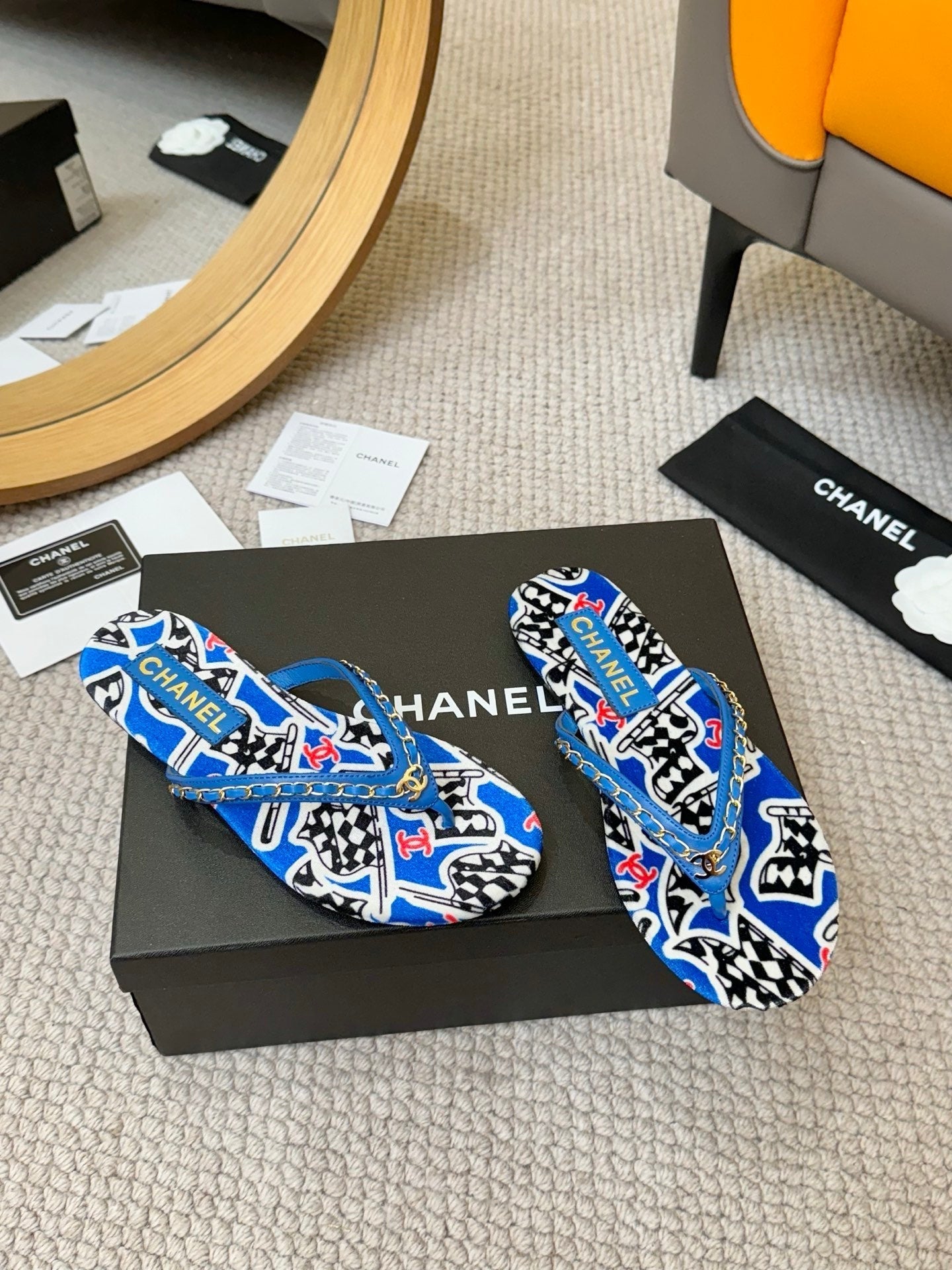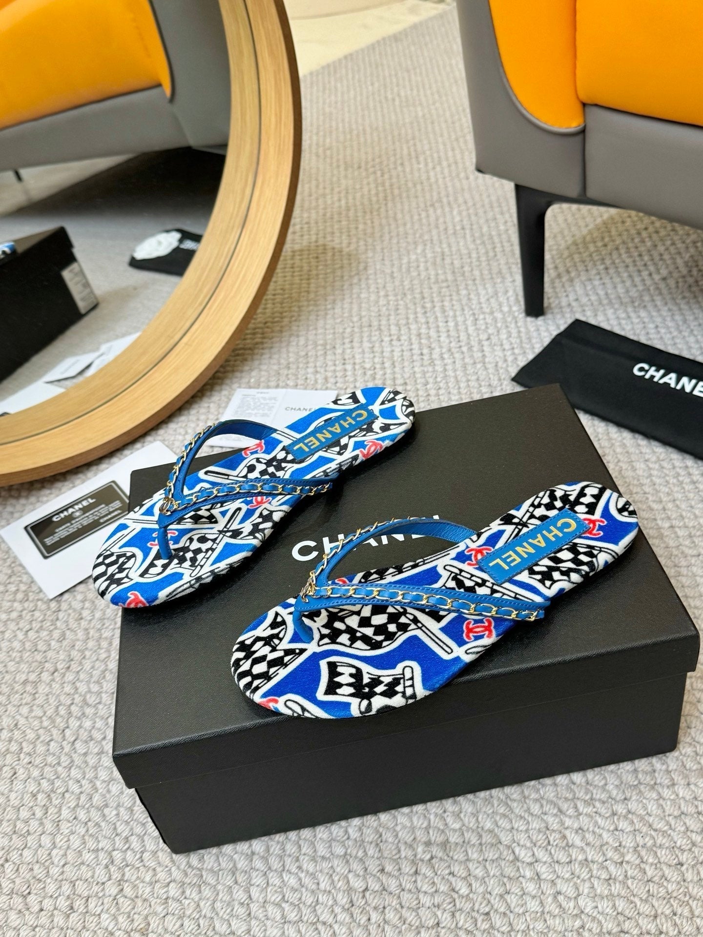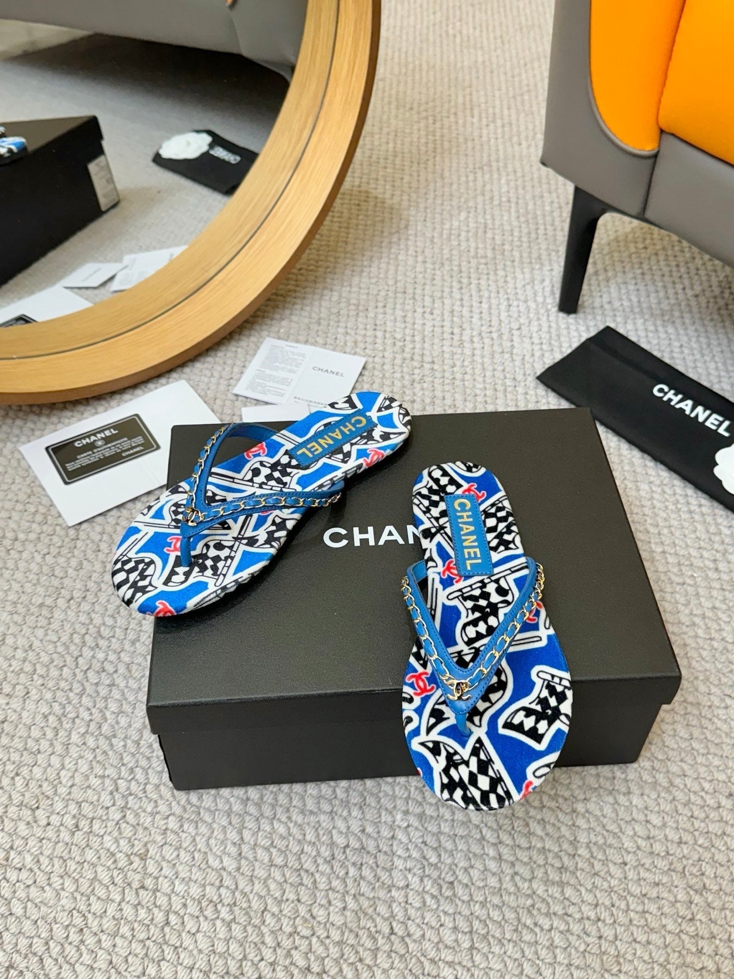 CC Chain Strap Thong Slippers Blue Cloth Sheepskin Velvet 305869