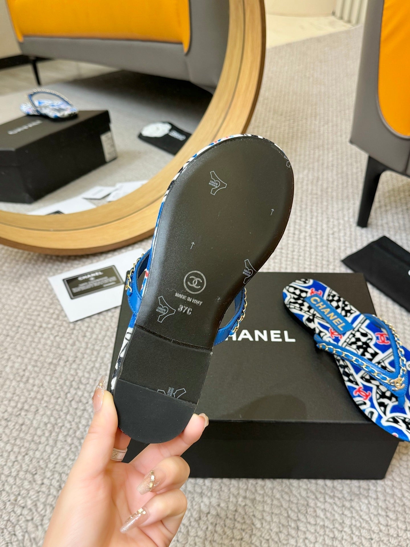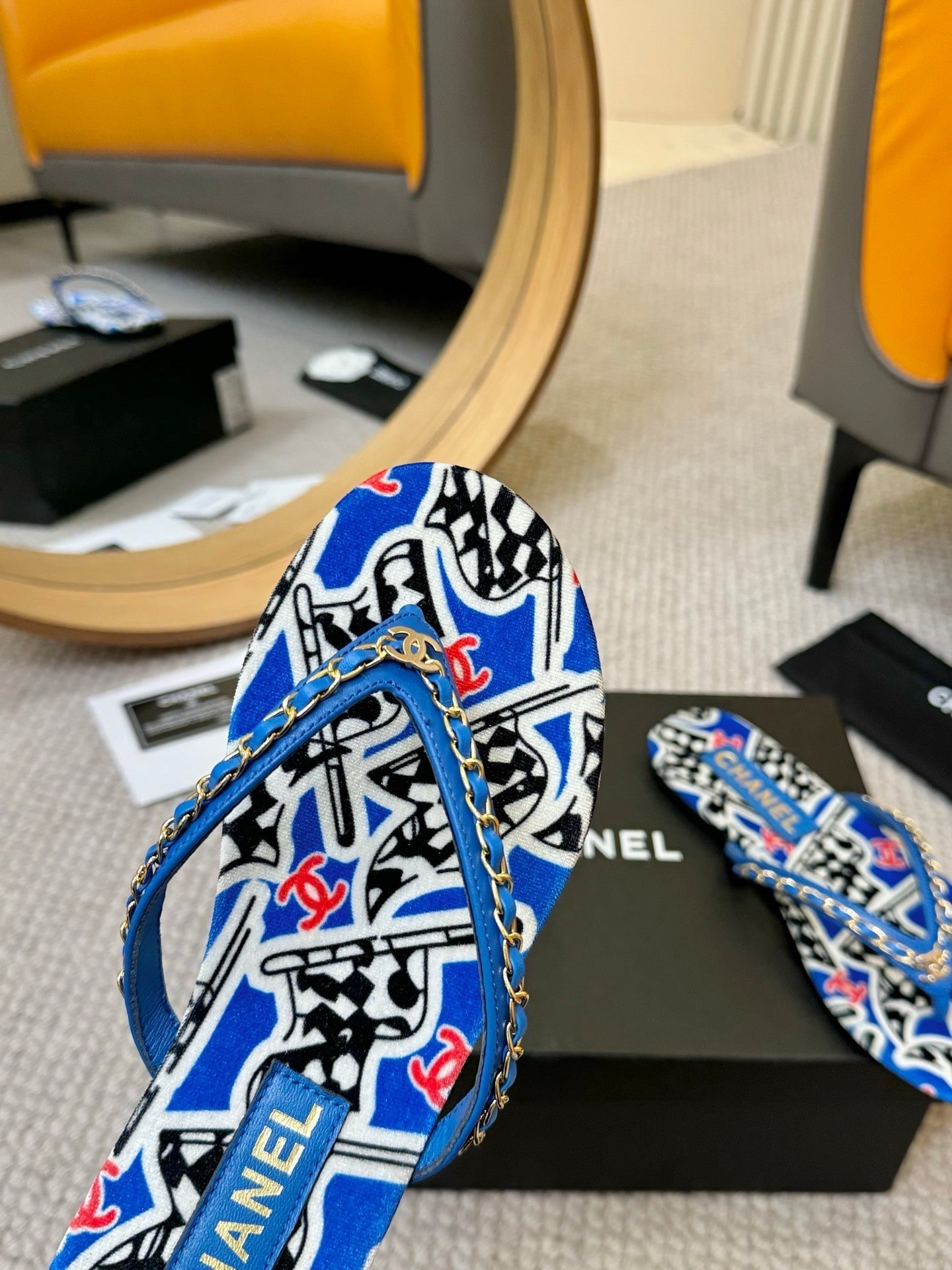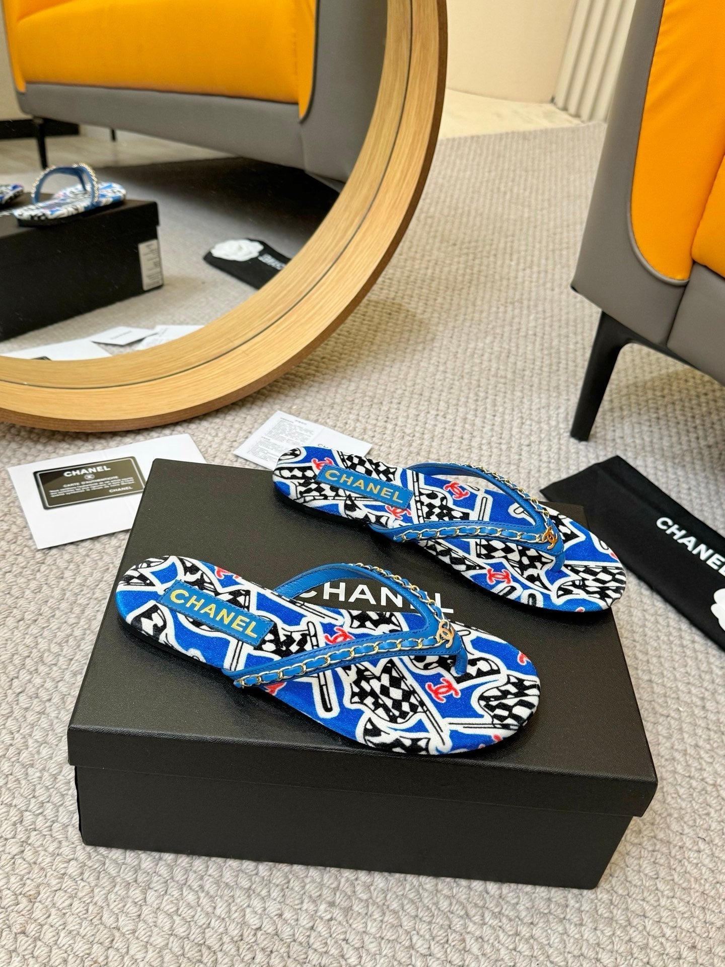 CC Chain Strap Thong Slippers Blue Cloth Sheepskin Velvet 305869