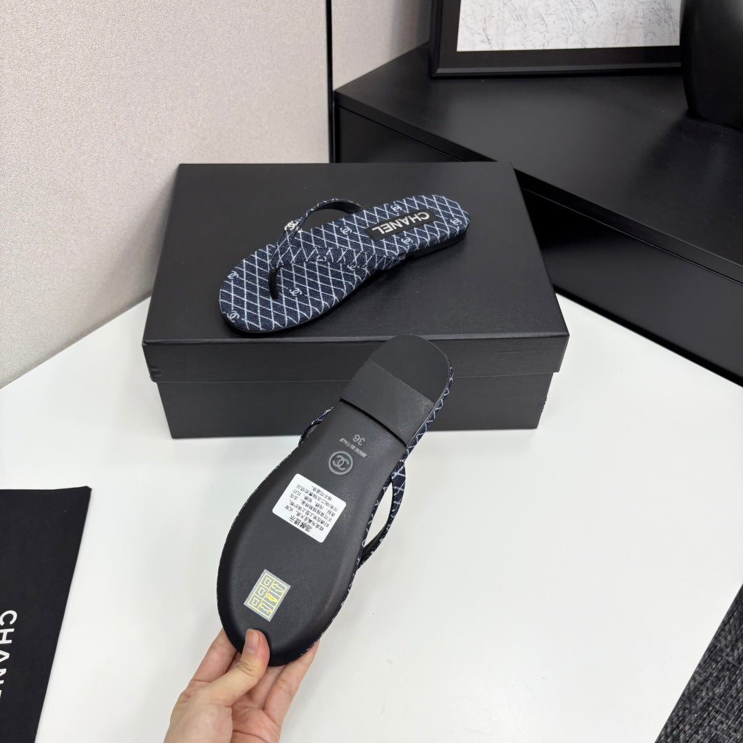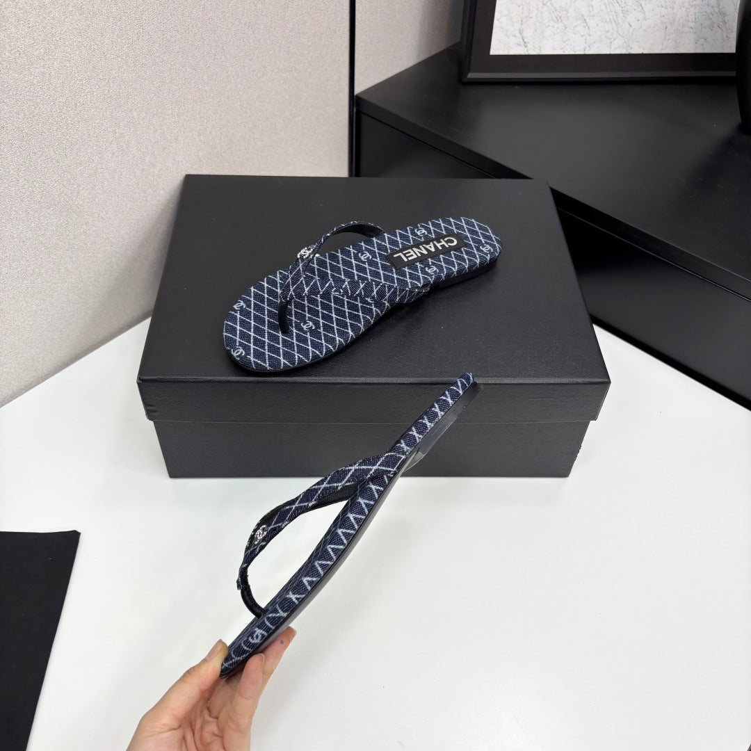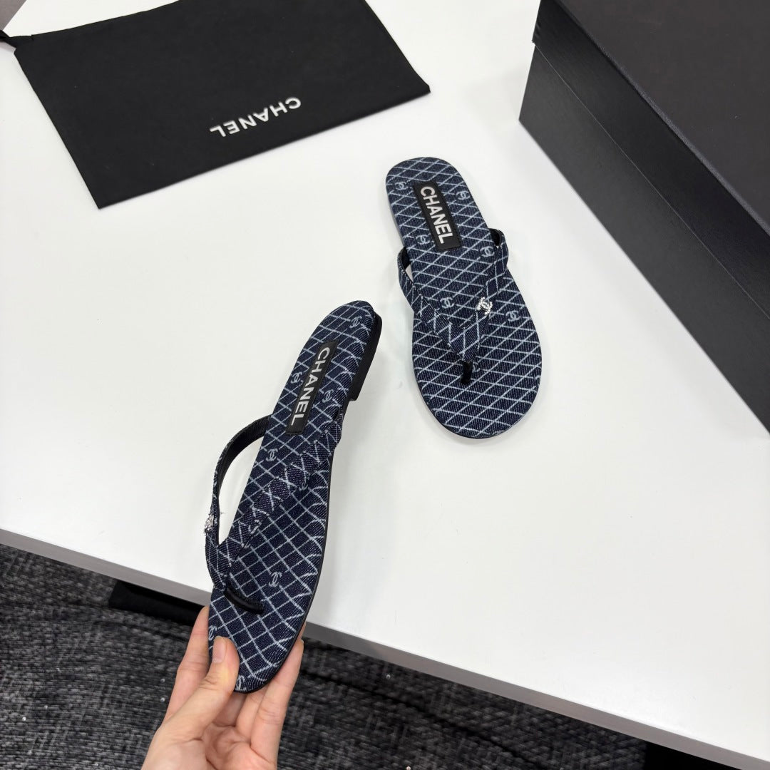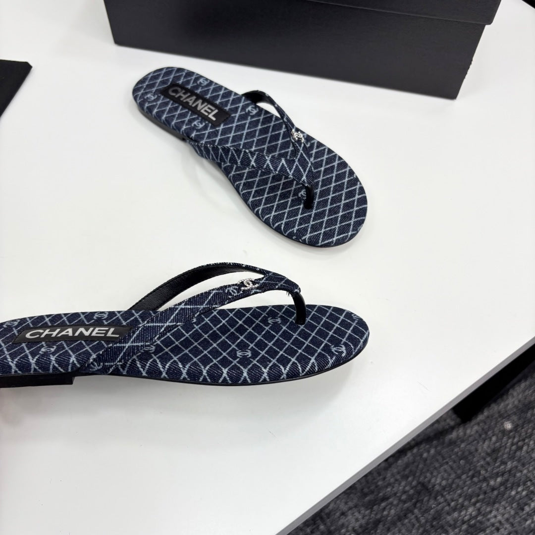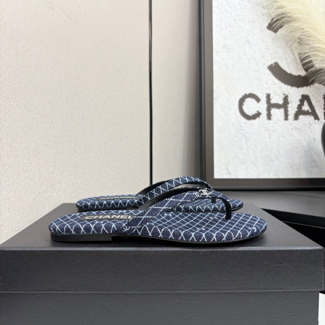 CC Crystal Logo Thong Sandal Navy Blue Fabric And Sheepskin 352483