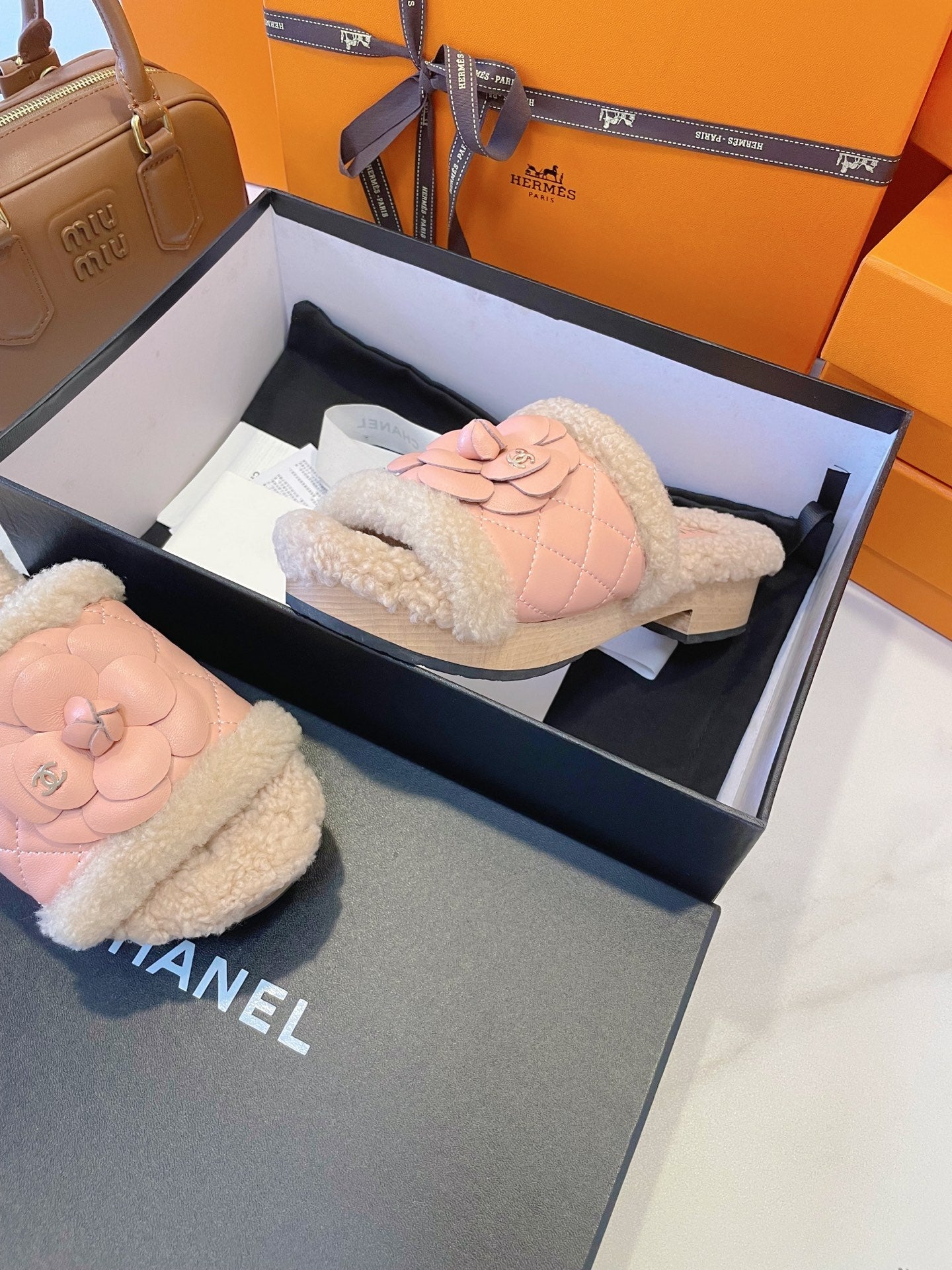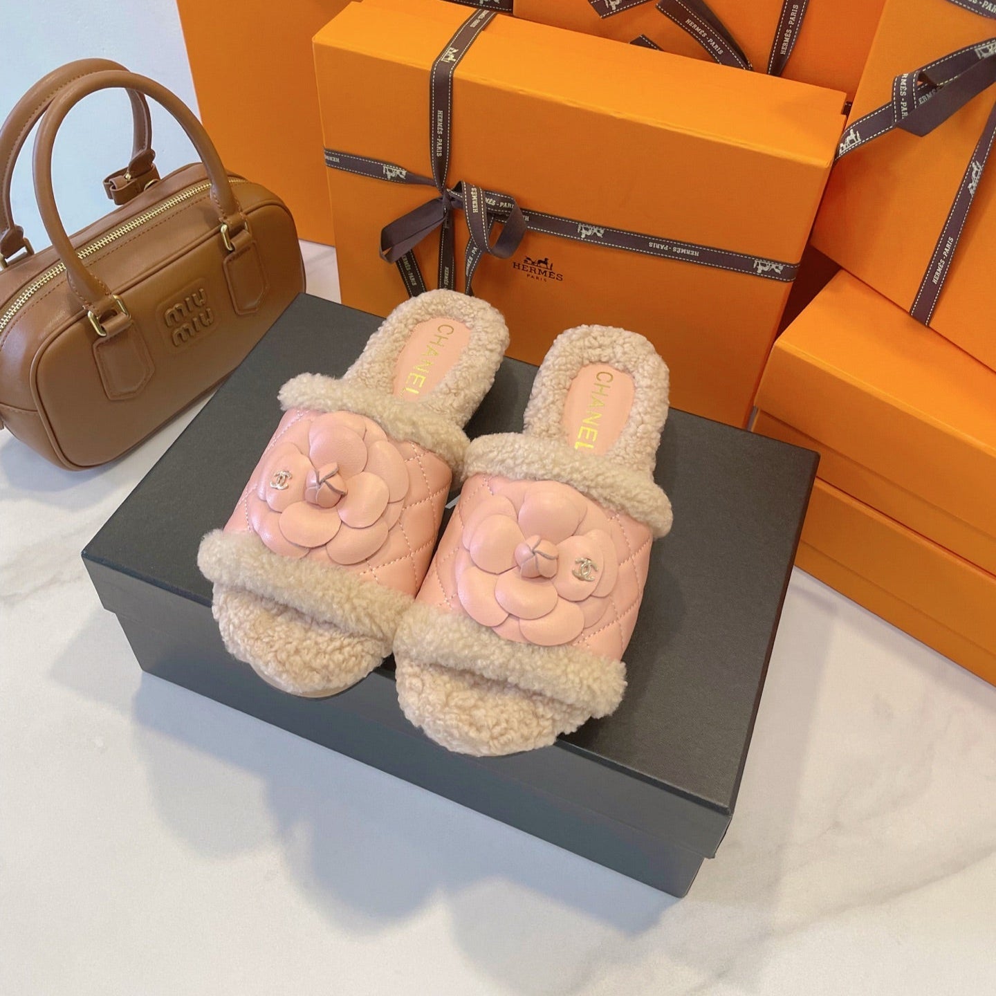CC 25C Flower Slippers 50mm Pink Shearling Wood Sheepskin 423697