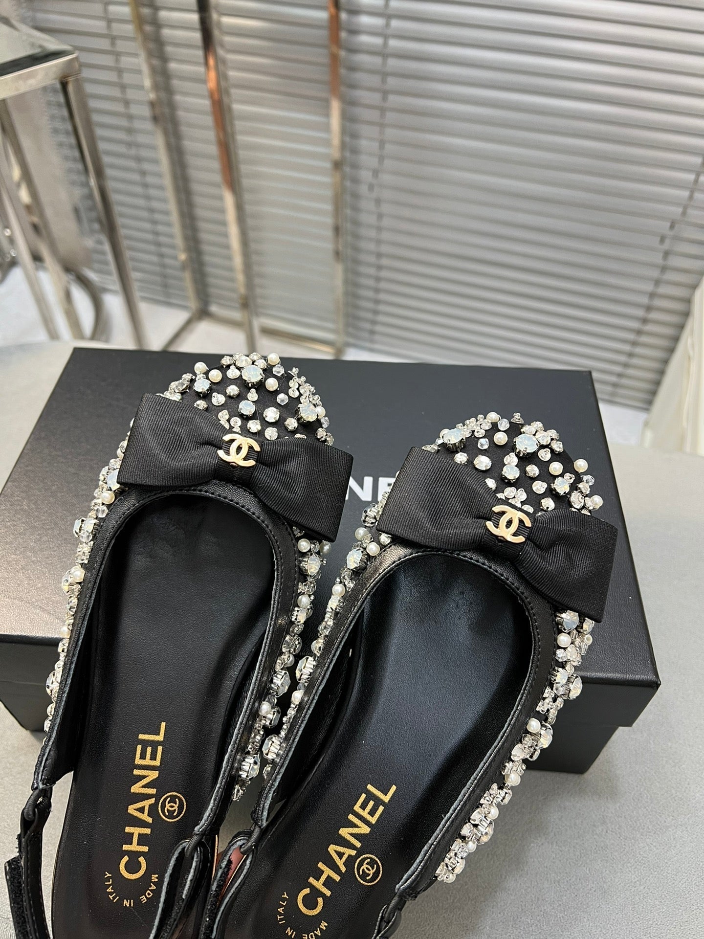 slingback flat black bowl silk diamond buckle