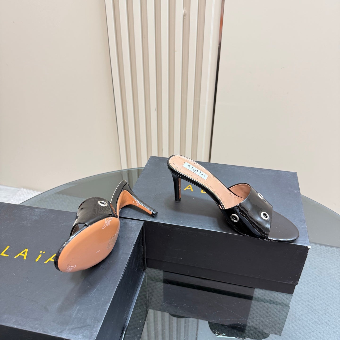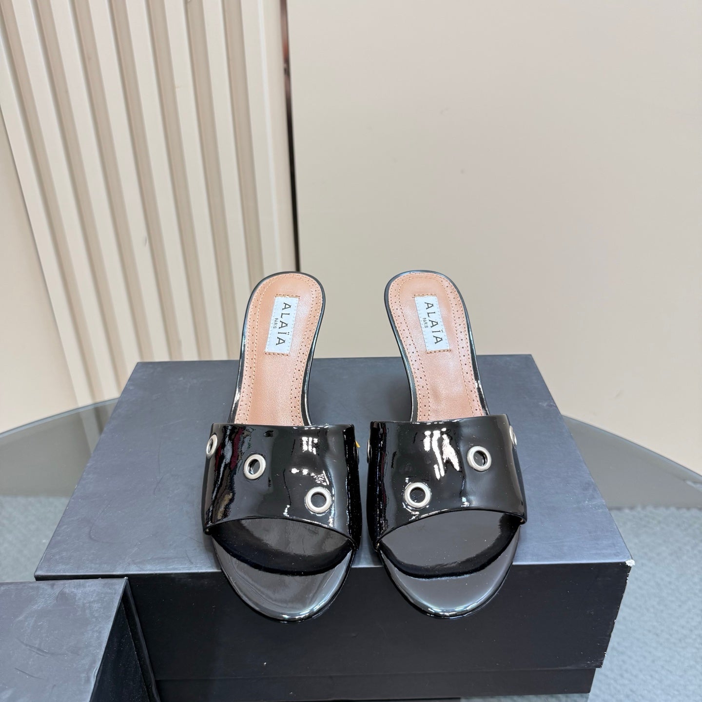 Alaia 2025 Oeillets Embellished Leather Sandals Glossy Black Lambskin 299668