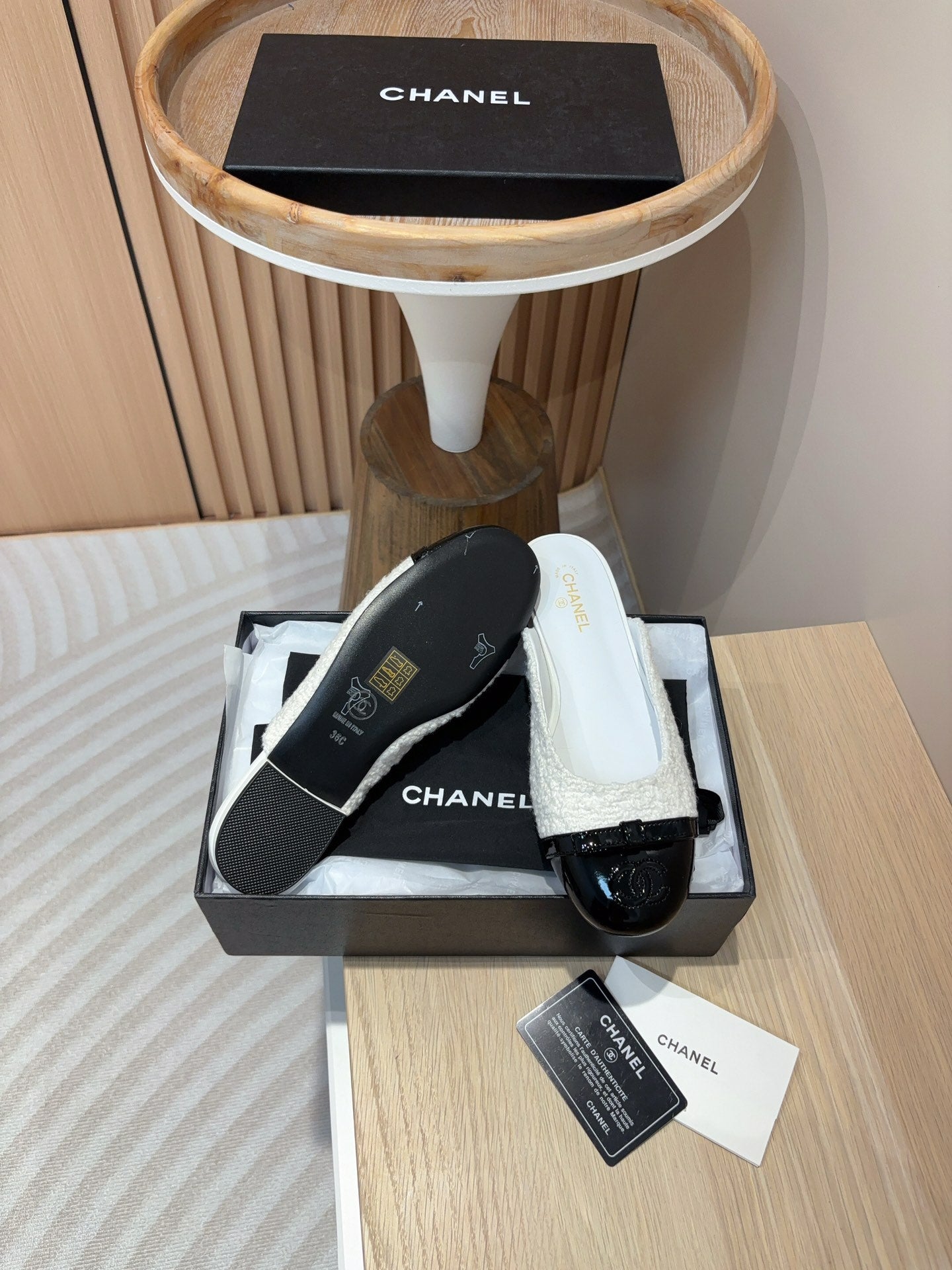 cc mule white tweed black patent calfskin