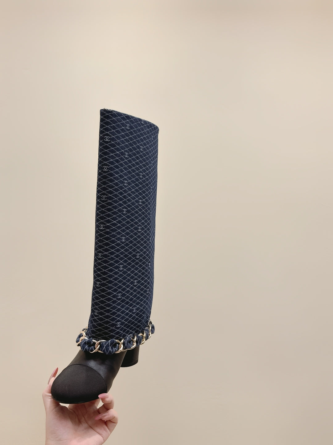 CC 25 Long Boot Navy Blue Black Denim Fabric Calfskin 515273