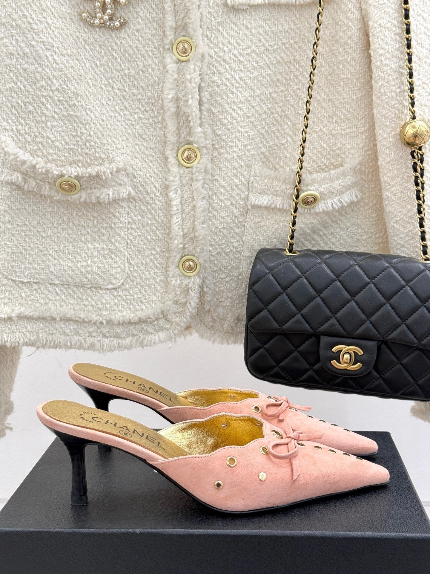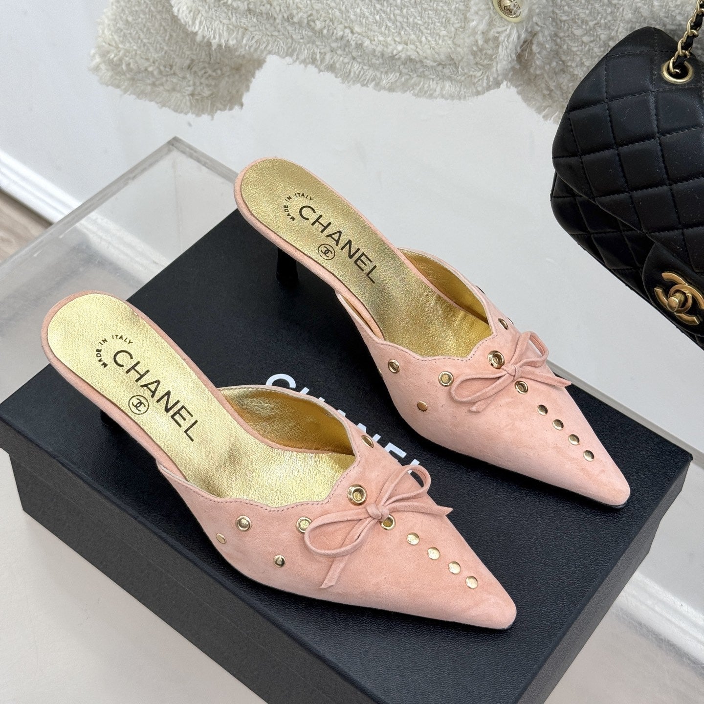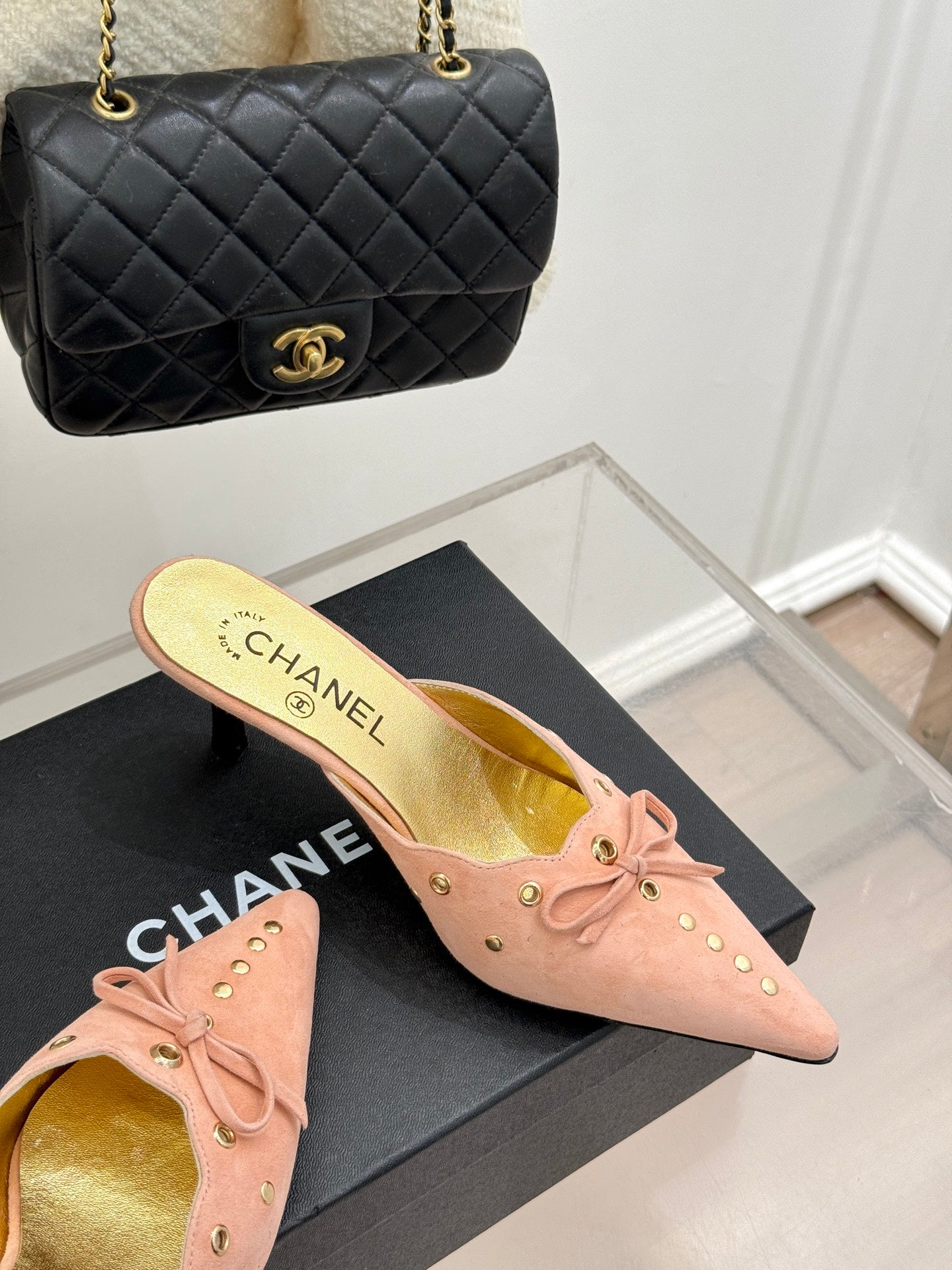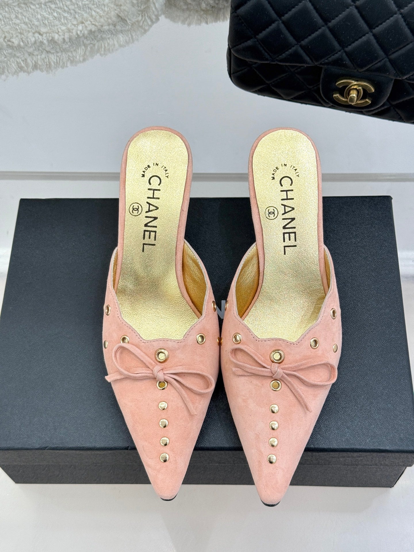 CC 25C Bowknot Pointed High Heel Half Slippers 60mm Peach Suede 265659