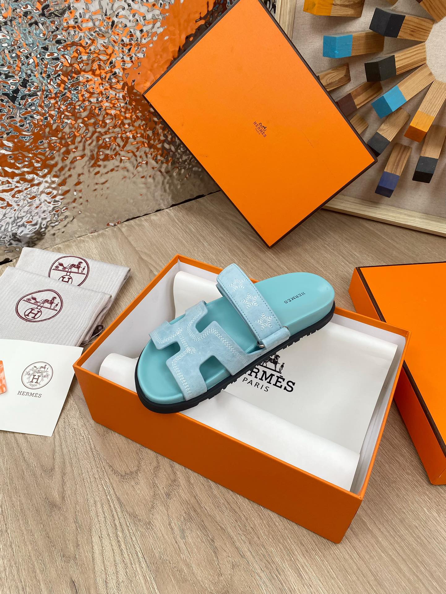 chypre sandal turquoise blue suede calfskin white thread embroidered