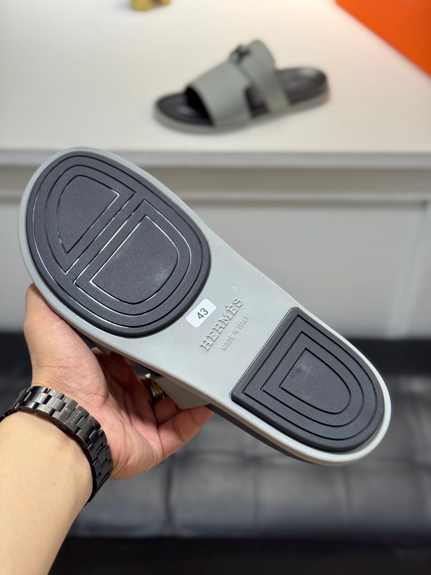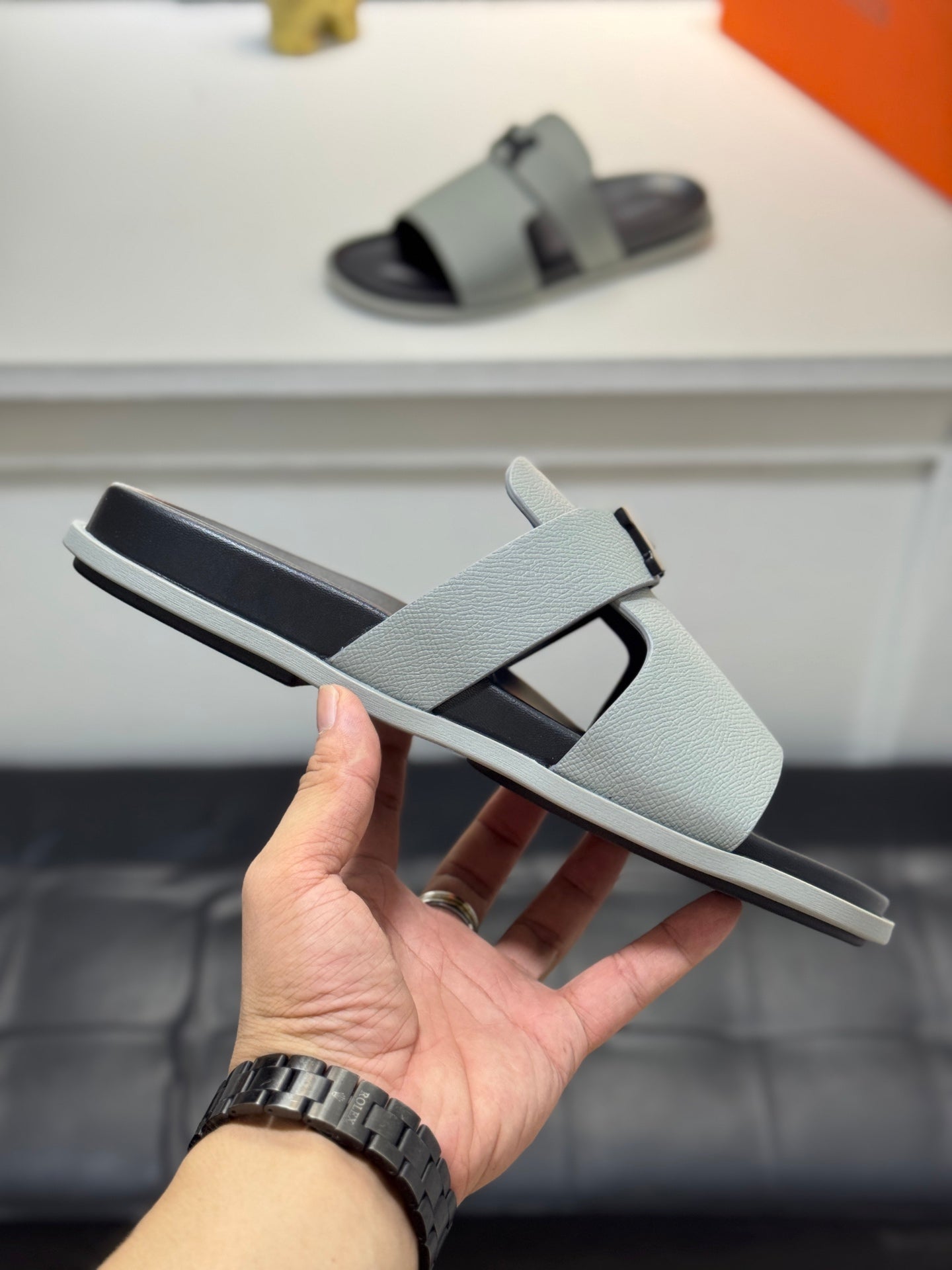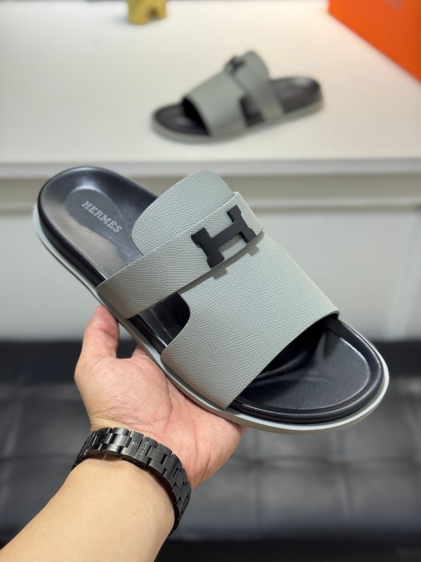 HM Oran H Noir Buckle Slippers in Light Gray Cowhide 735258