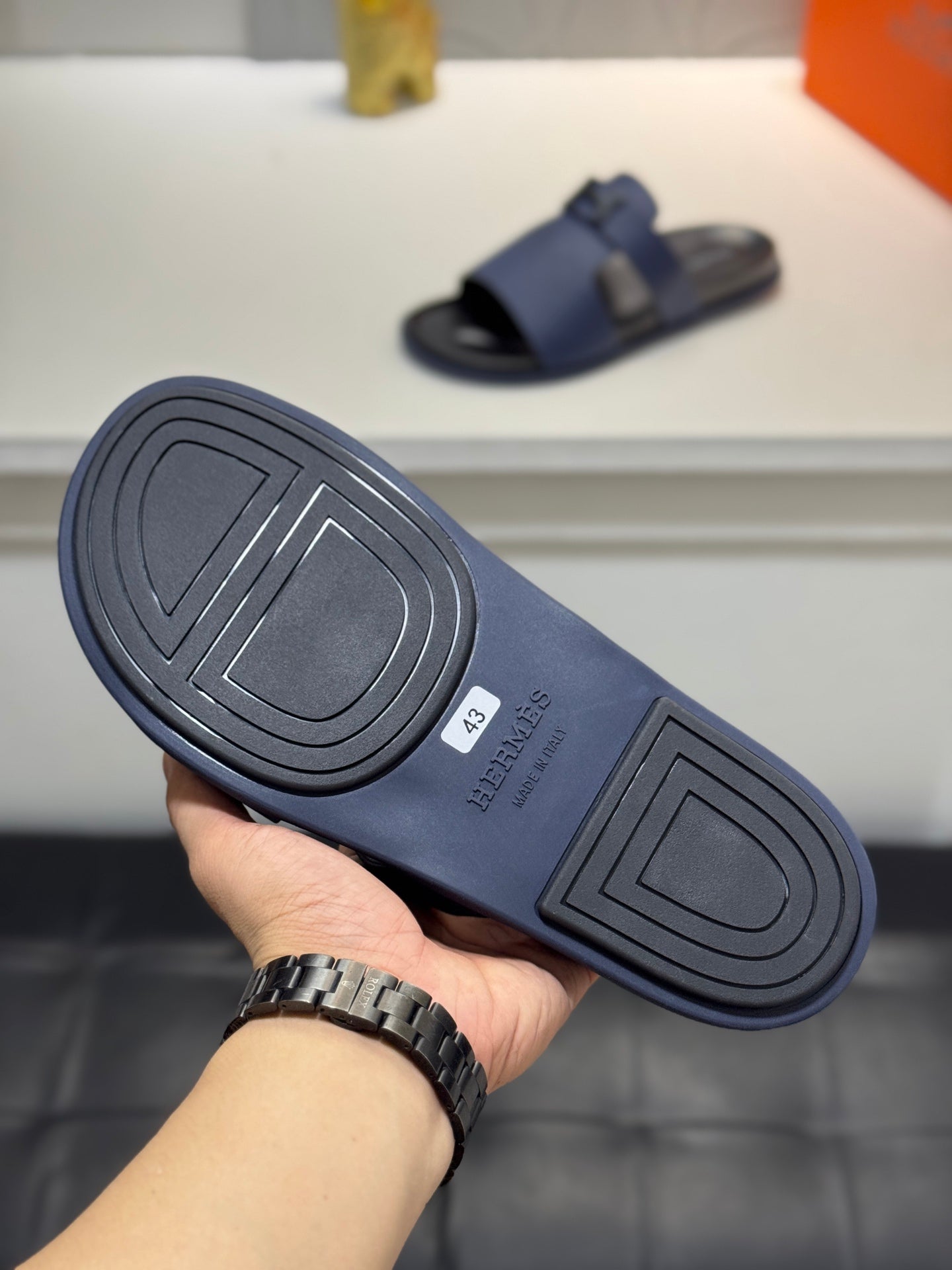 HM Oran H Noir Buckle Slippers in Navy Blue Cowhide 735257
