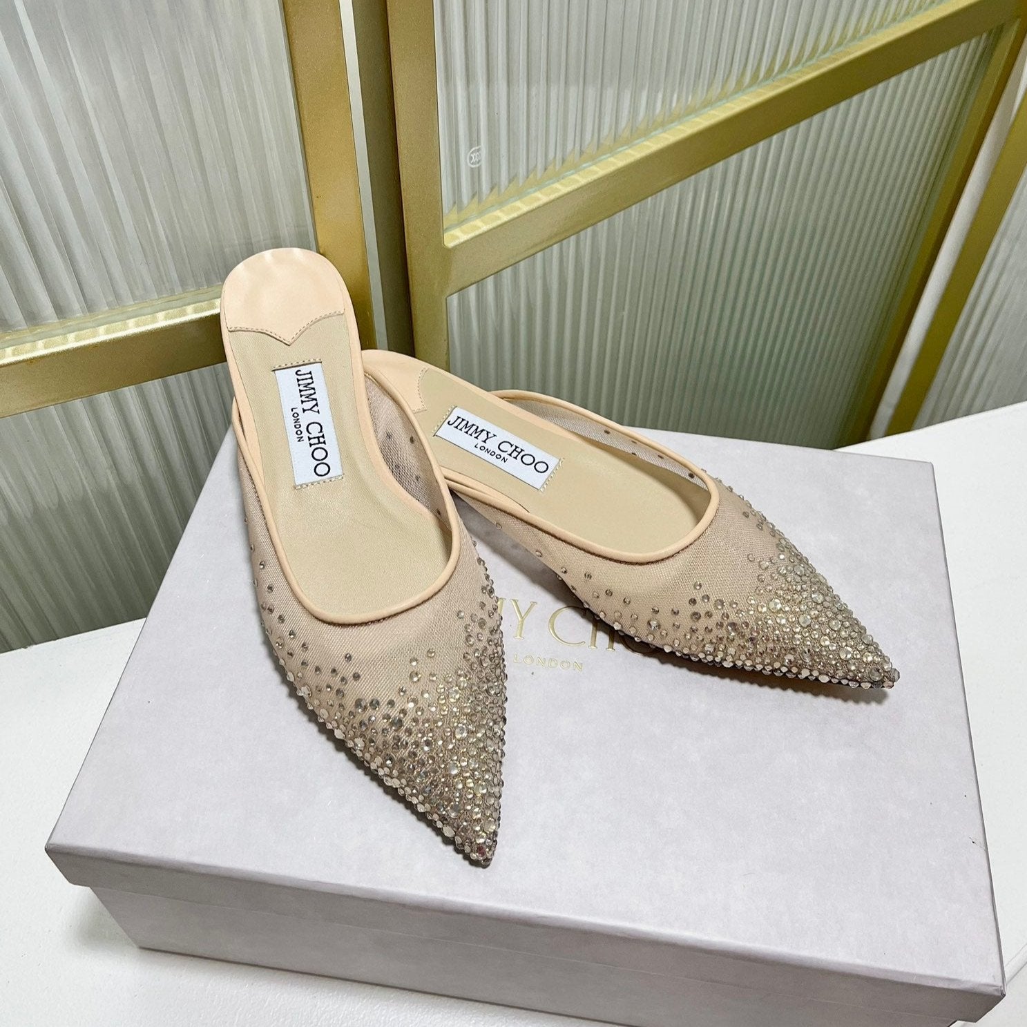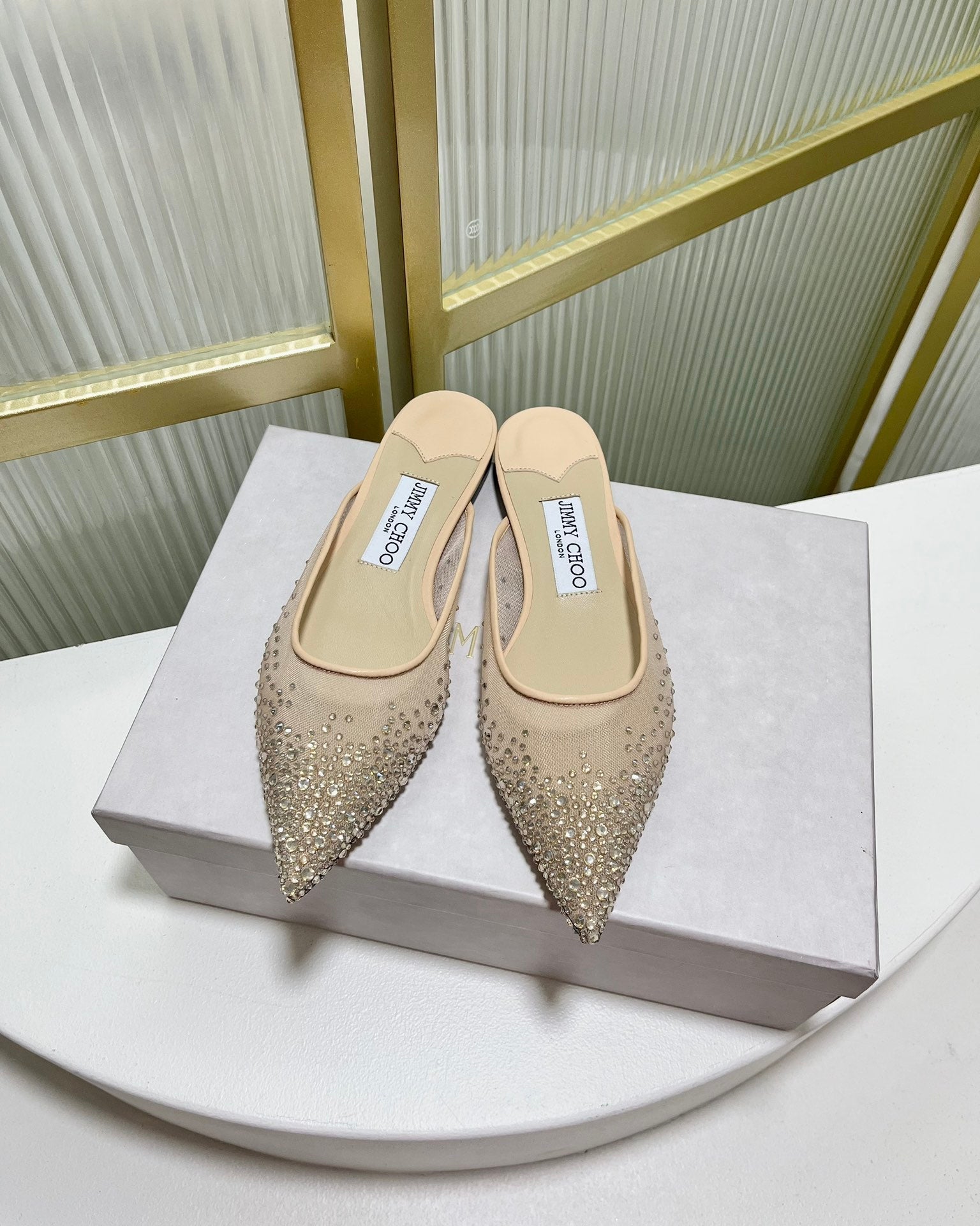Jimmy Mule In Beige Mesh Fabric With Swarovski Crystal 597879