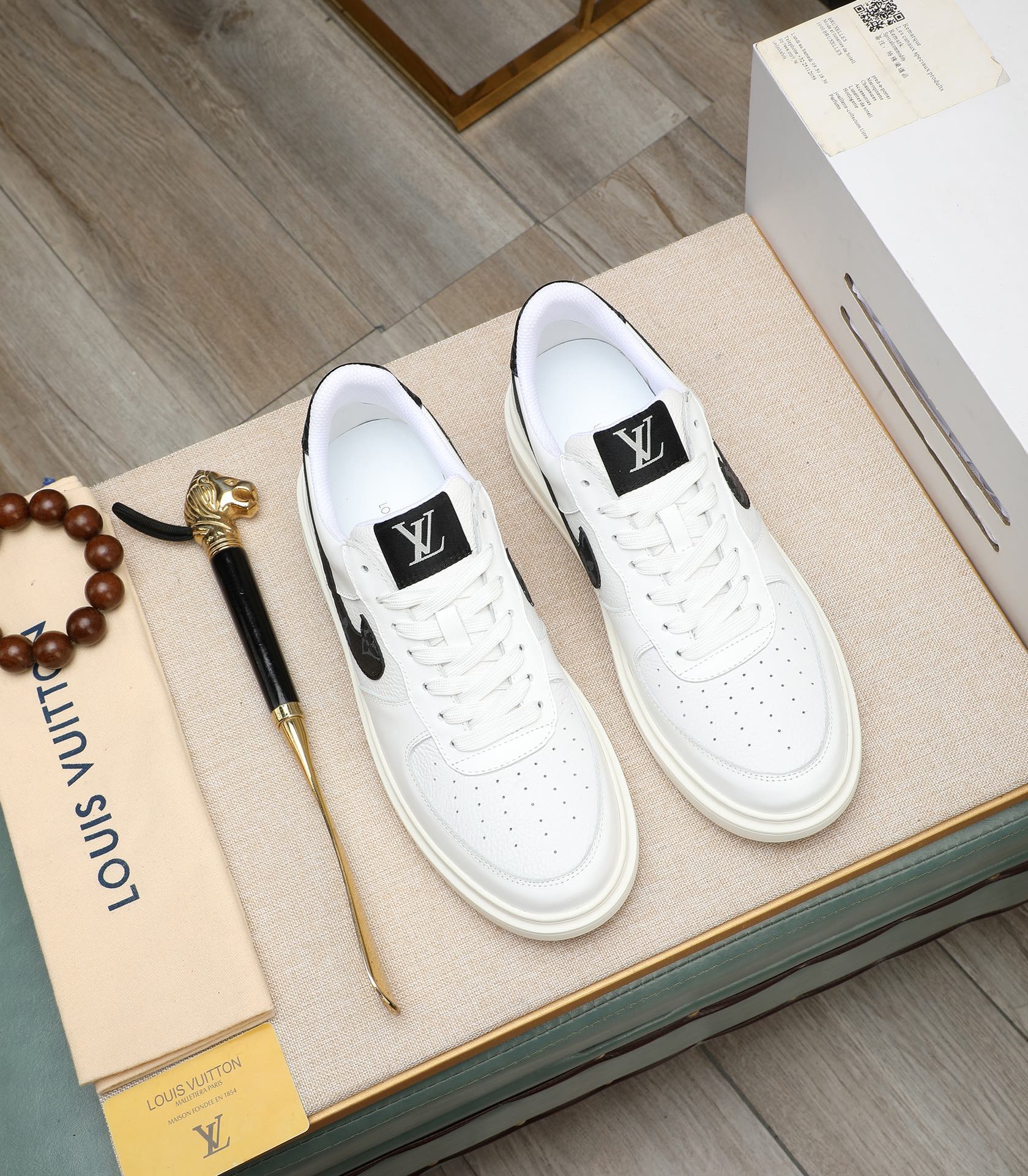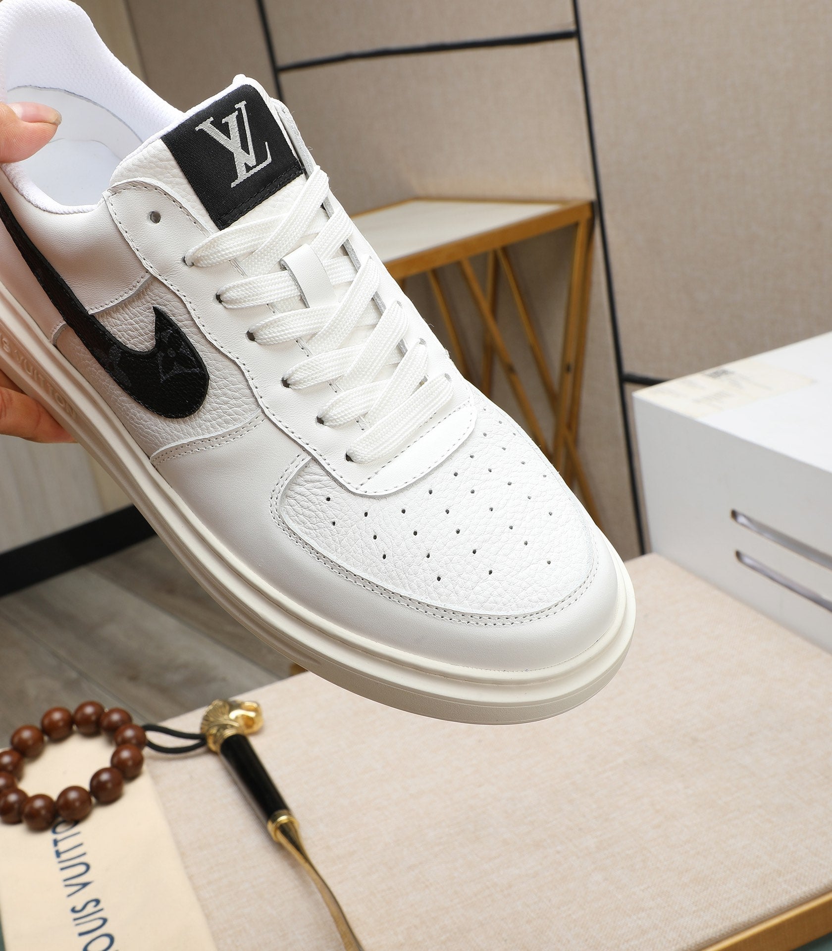 LV AIR FORCE 1 GLOSSY WHITE CALFSKIN WITH BLACK MONOGRAM LOGO
