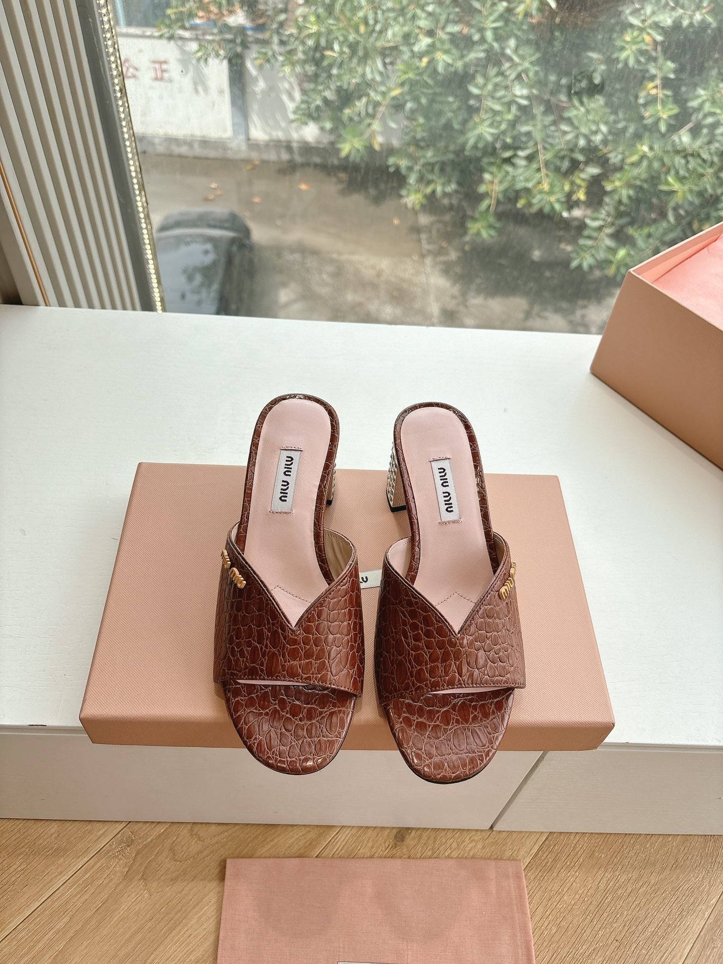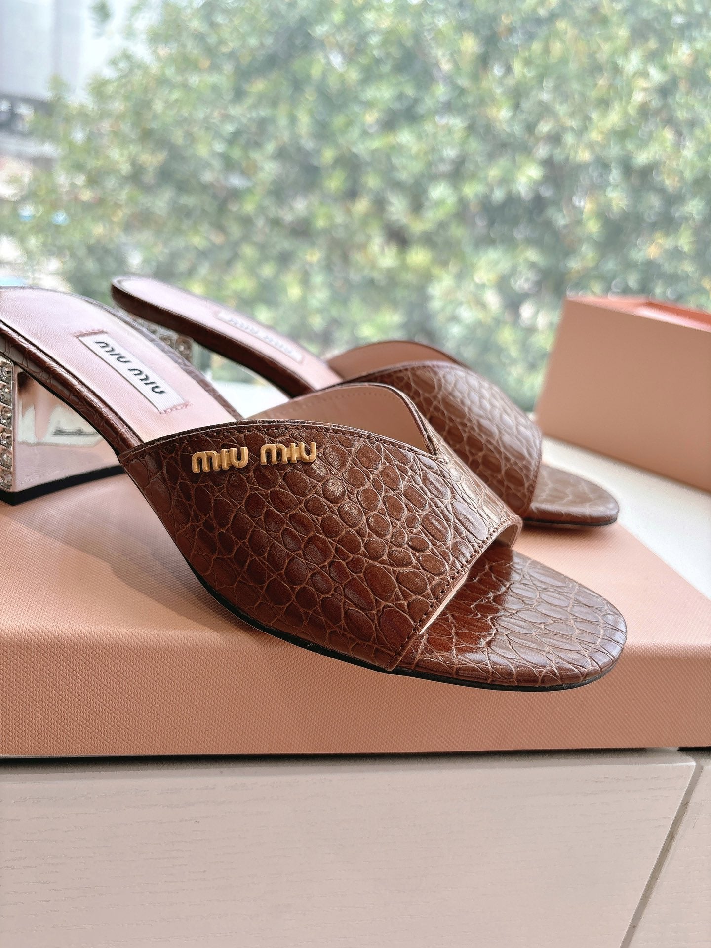 Miu Brown Croc Embossed Slide Sandals with Embellished Heel 223917