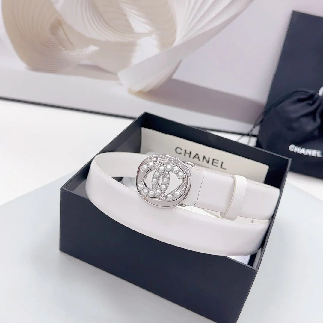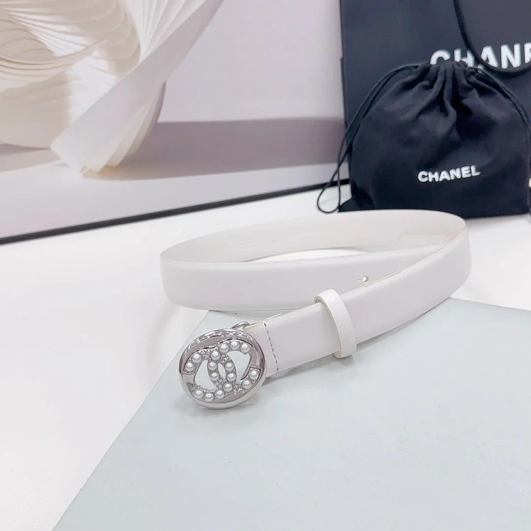 CC 30MM BELT IN WHITE CALFSKIN SILVER HARDWARE ATTACH PEARLS